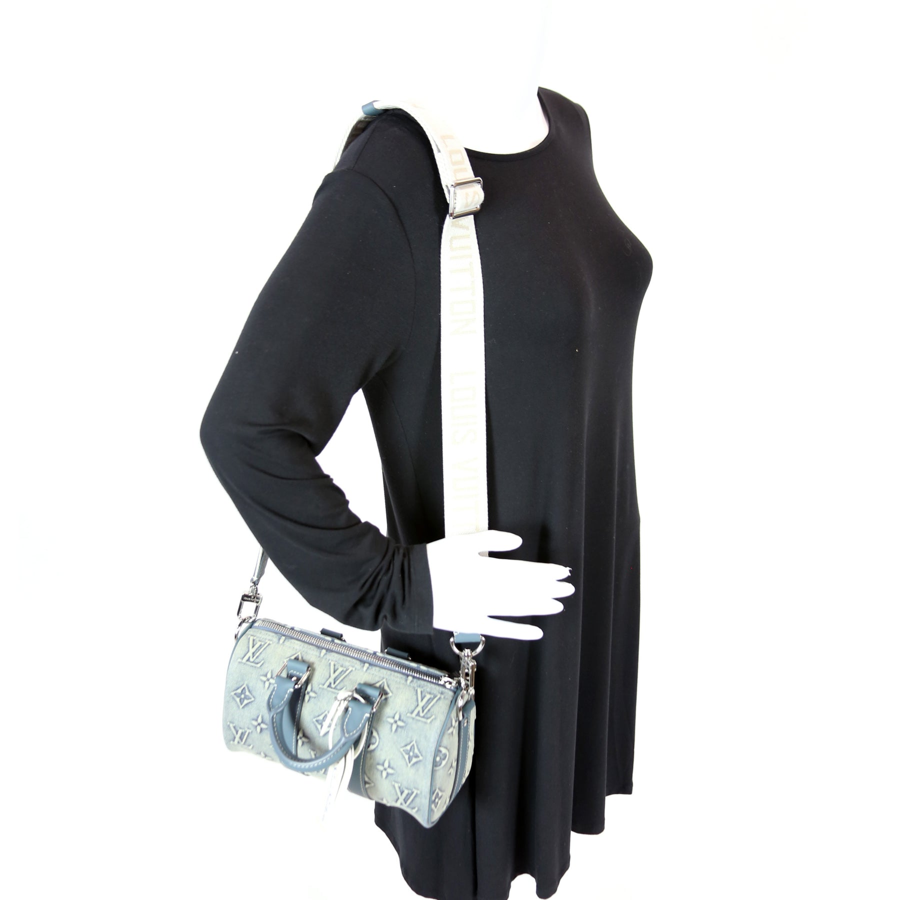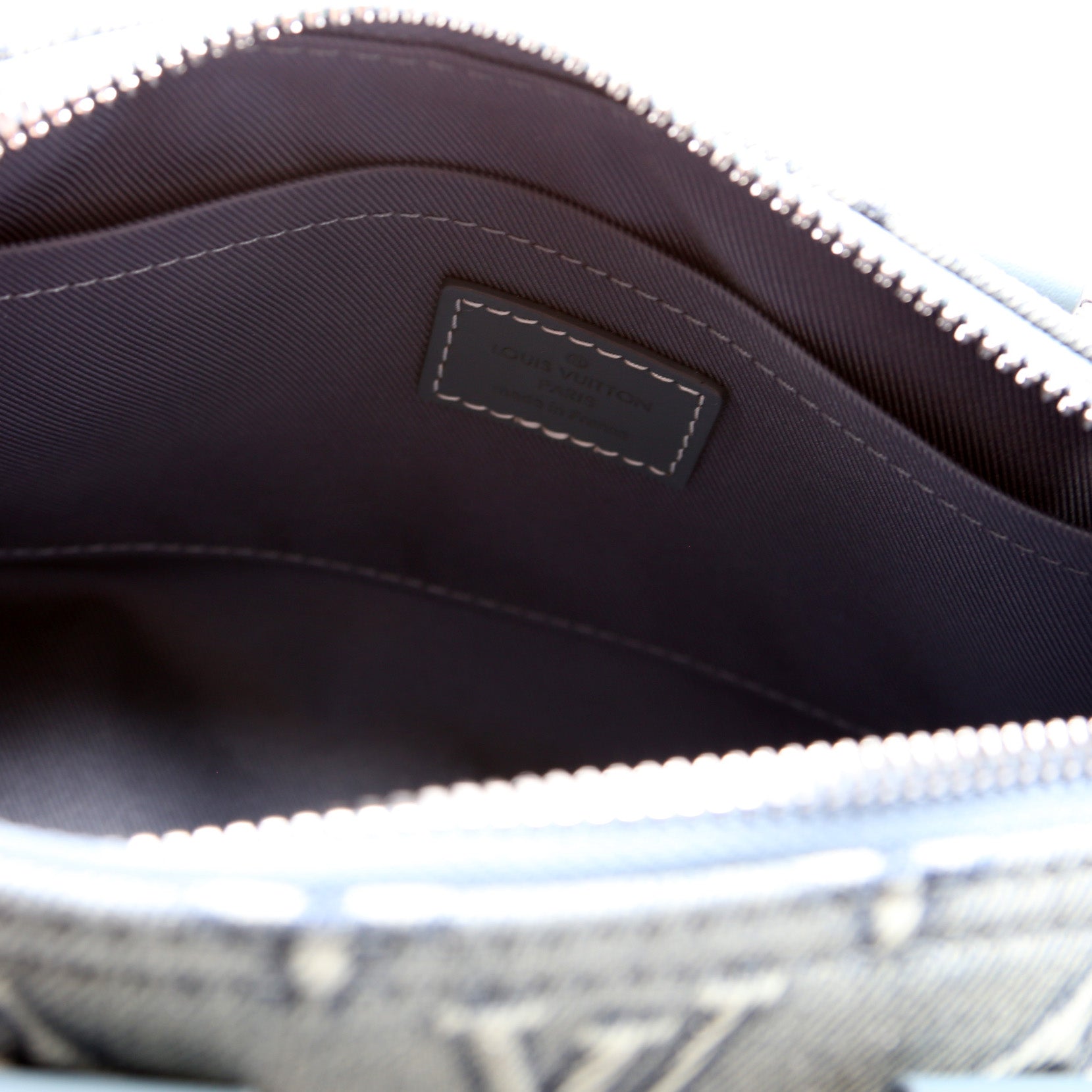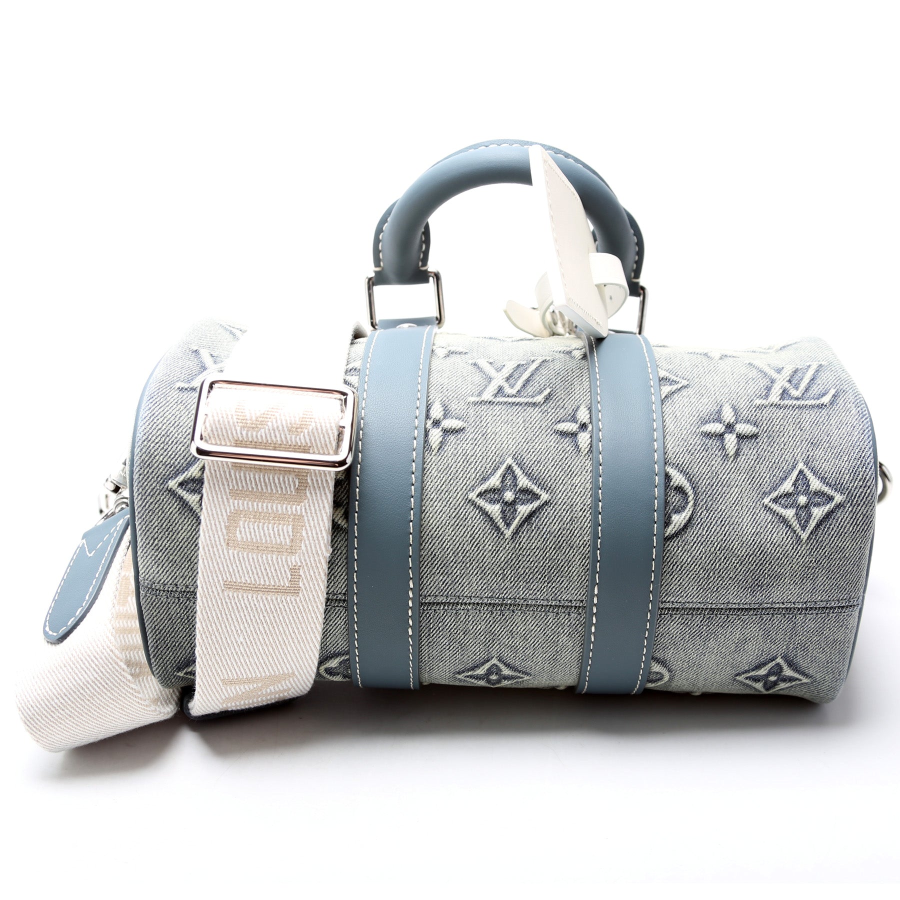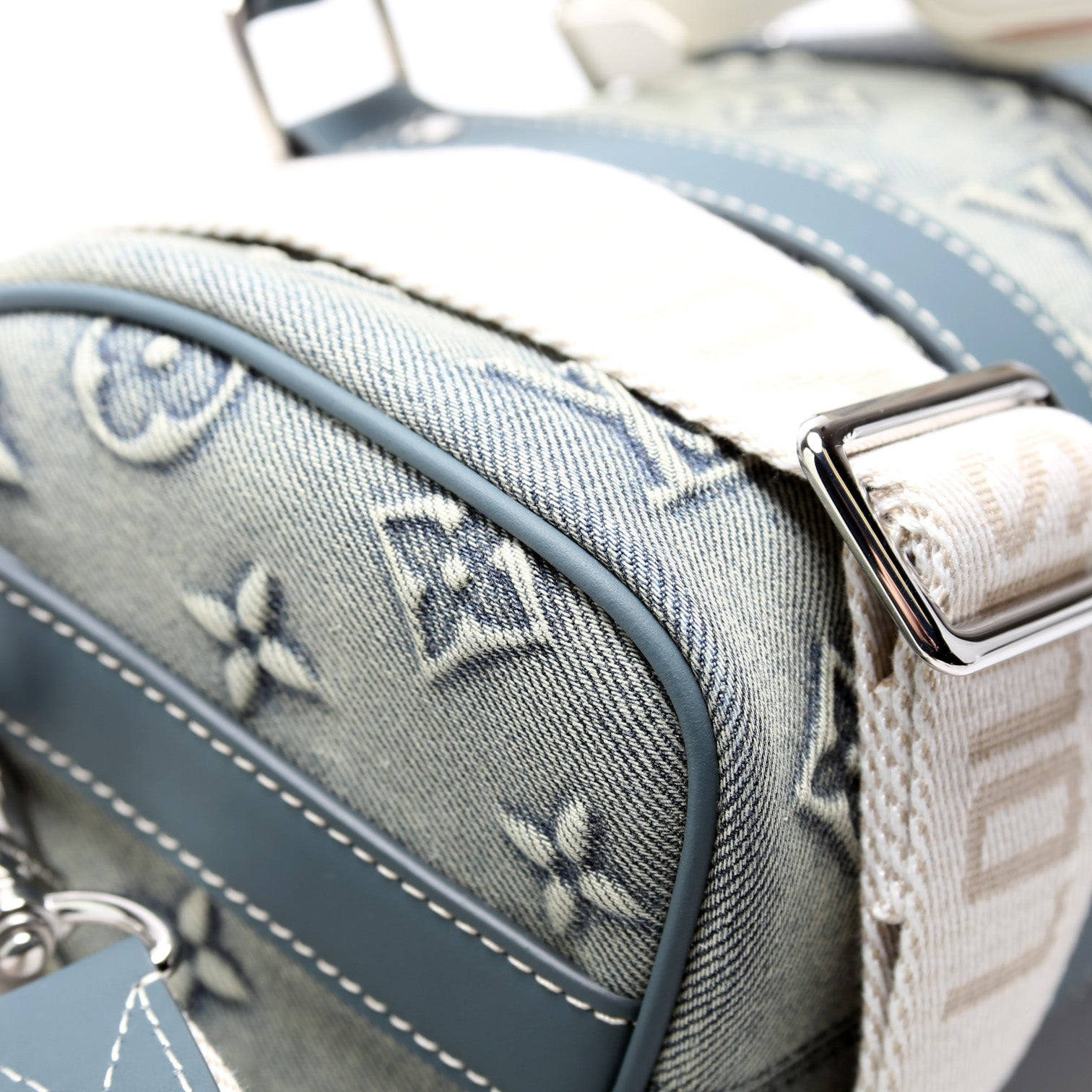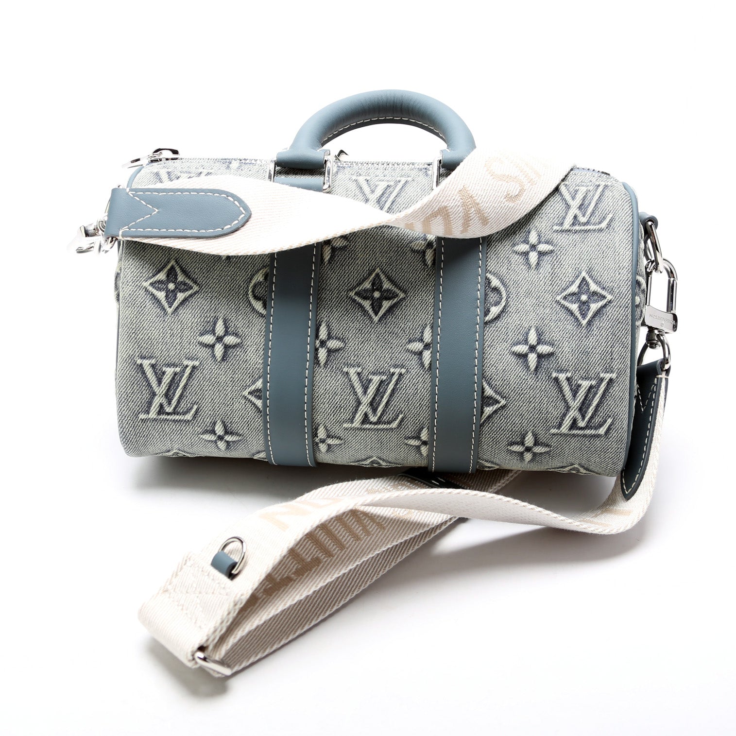 This pre-owned Louis Vuitton Keepall 25 W/Strap is guaranteed 100% authentic. The exterior is in the classic Louis Vuitton Denim Monogram canvas.