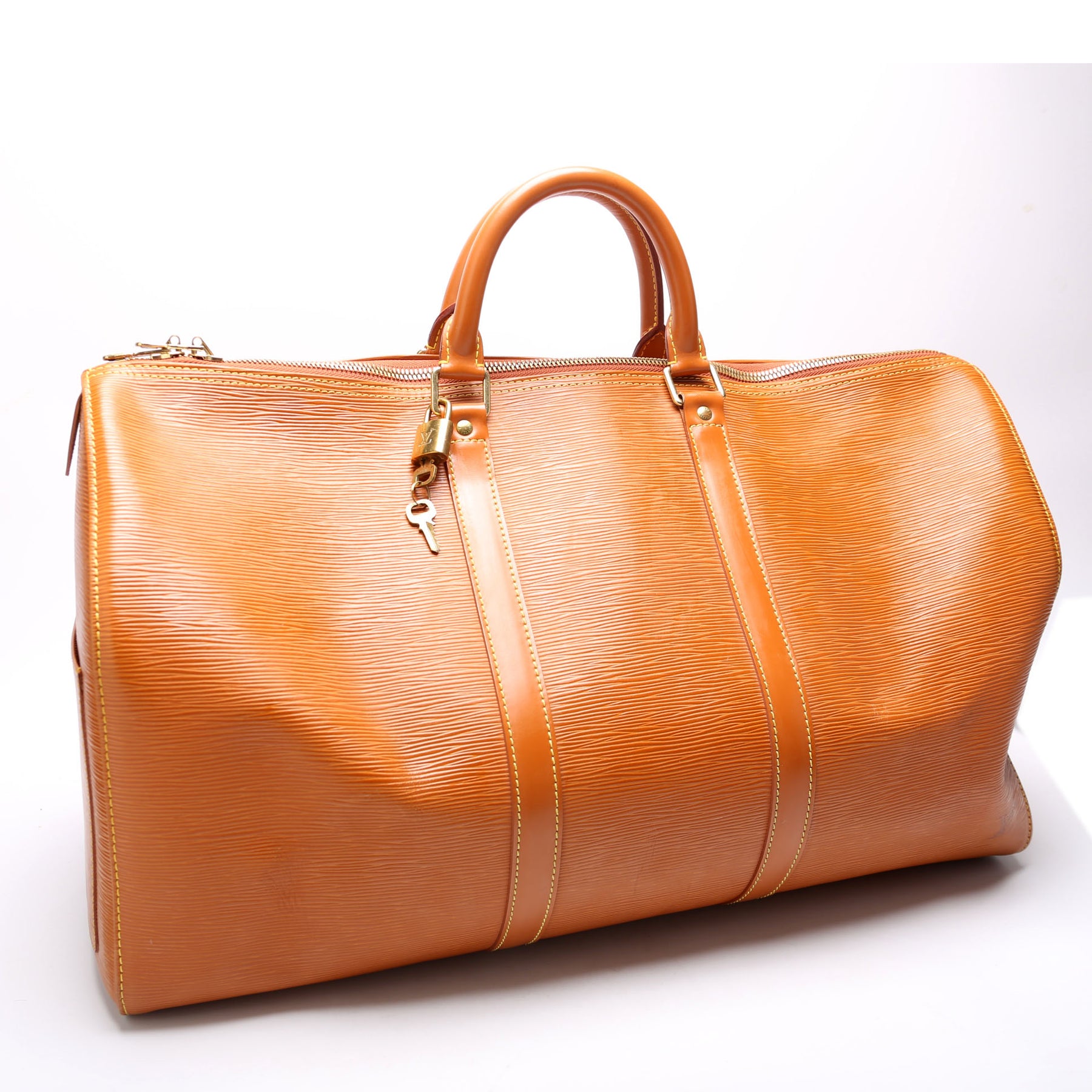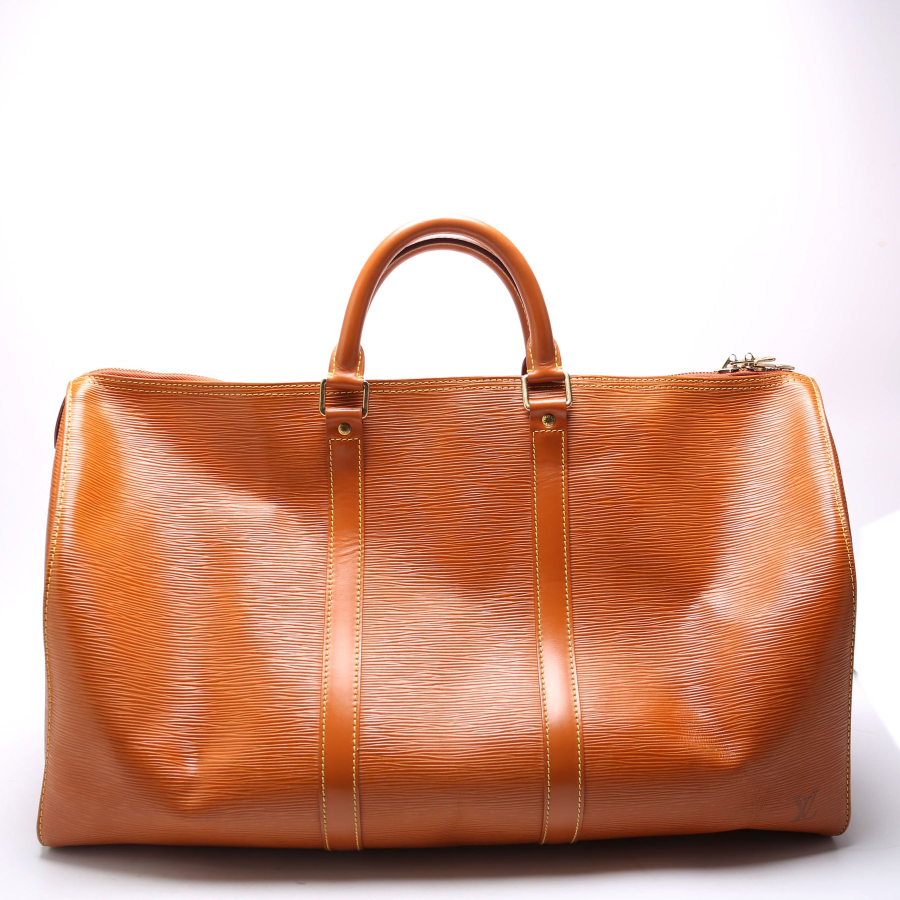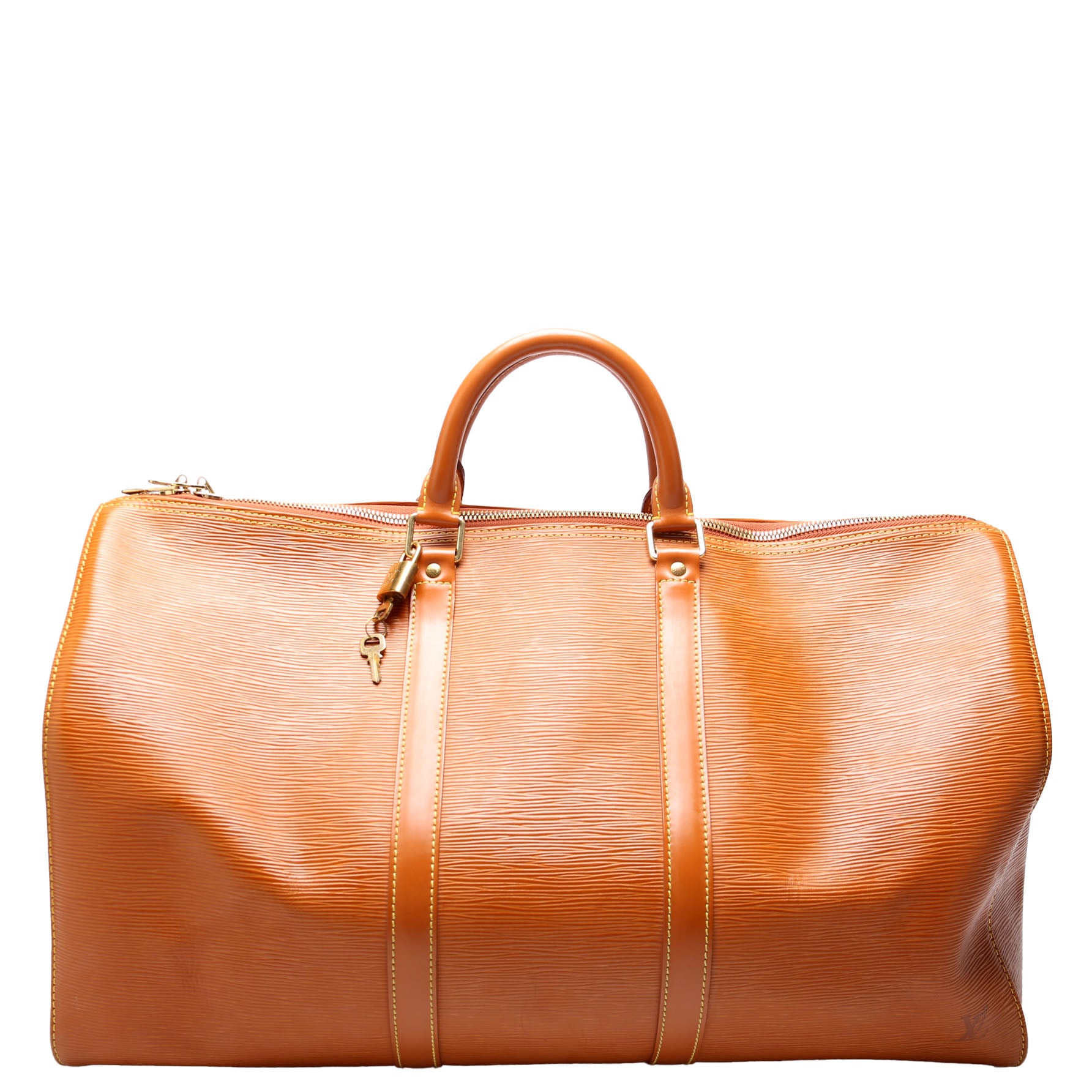 This pre-owned Louis Vuitton Keepall 50 is guaranteed 100% authentic. The exterior is in the classic Louis Vuitton Epi leather.