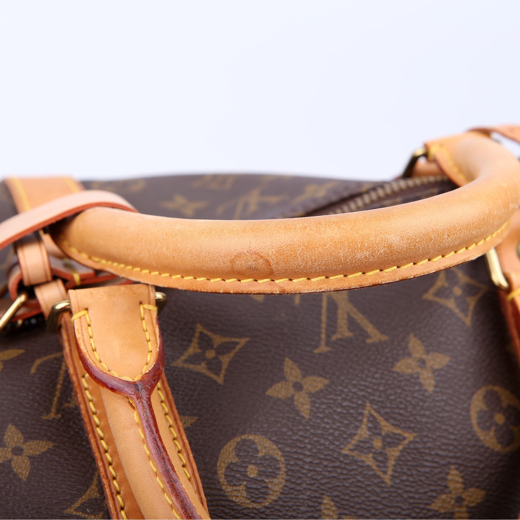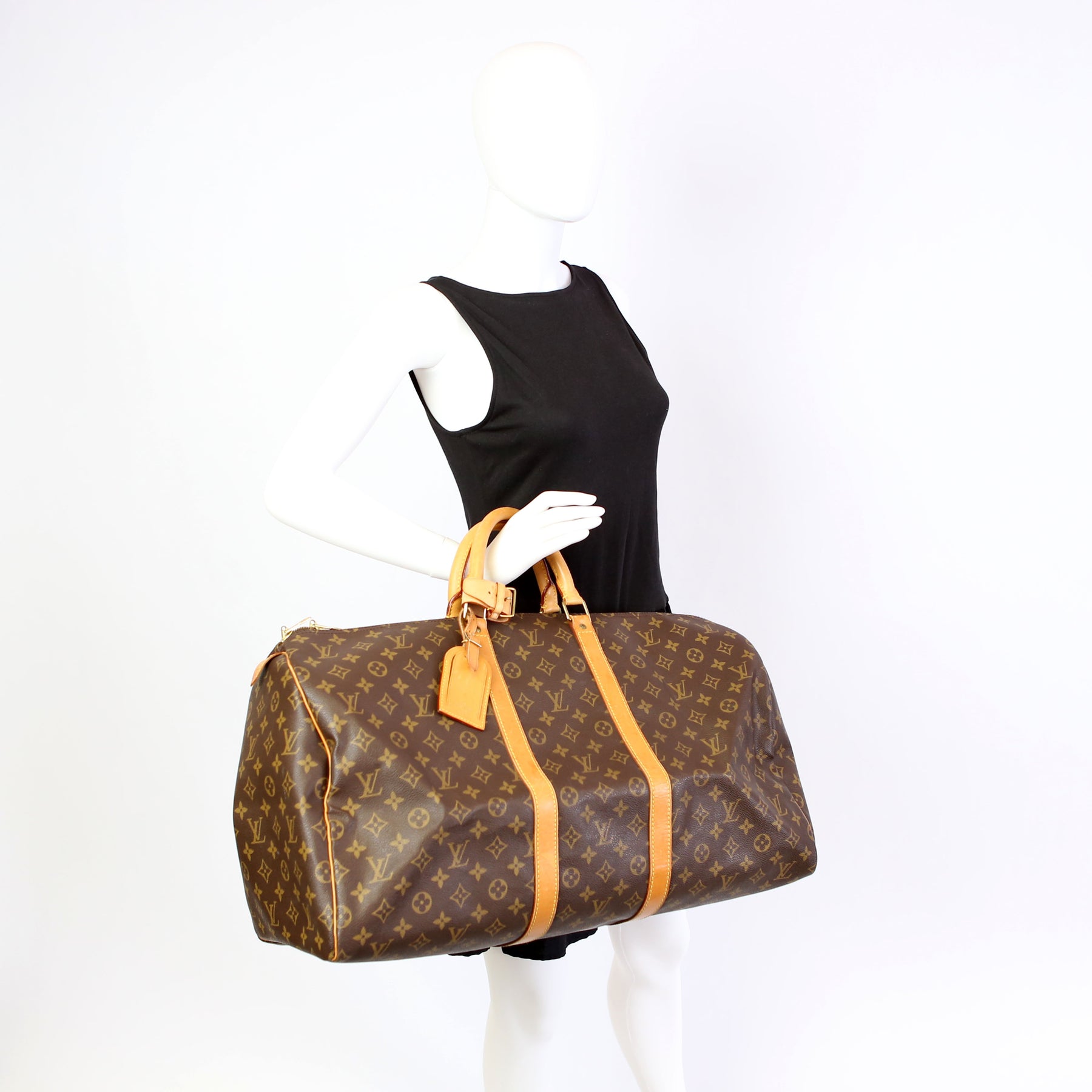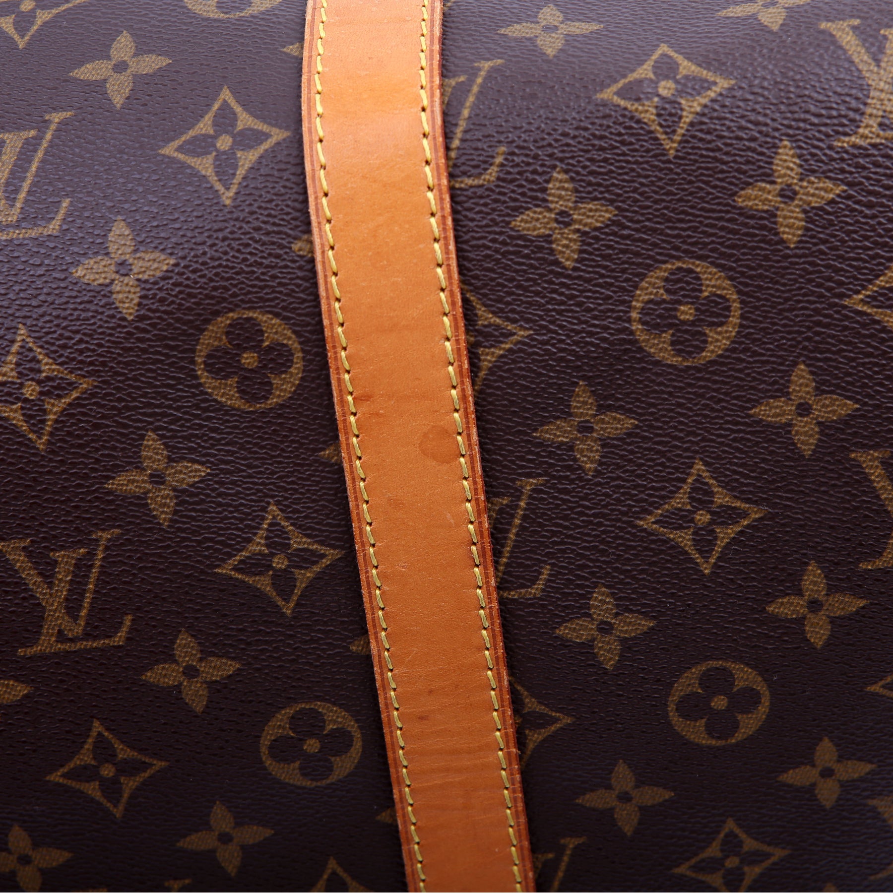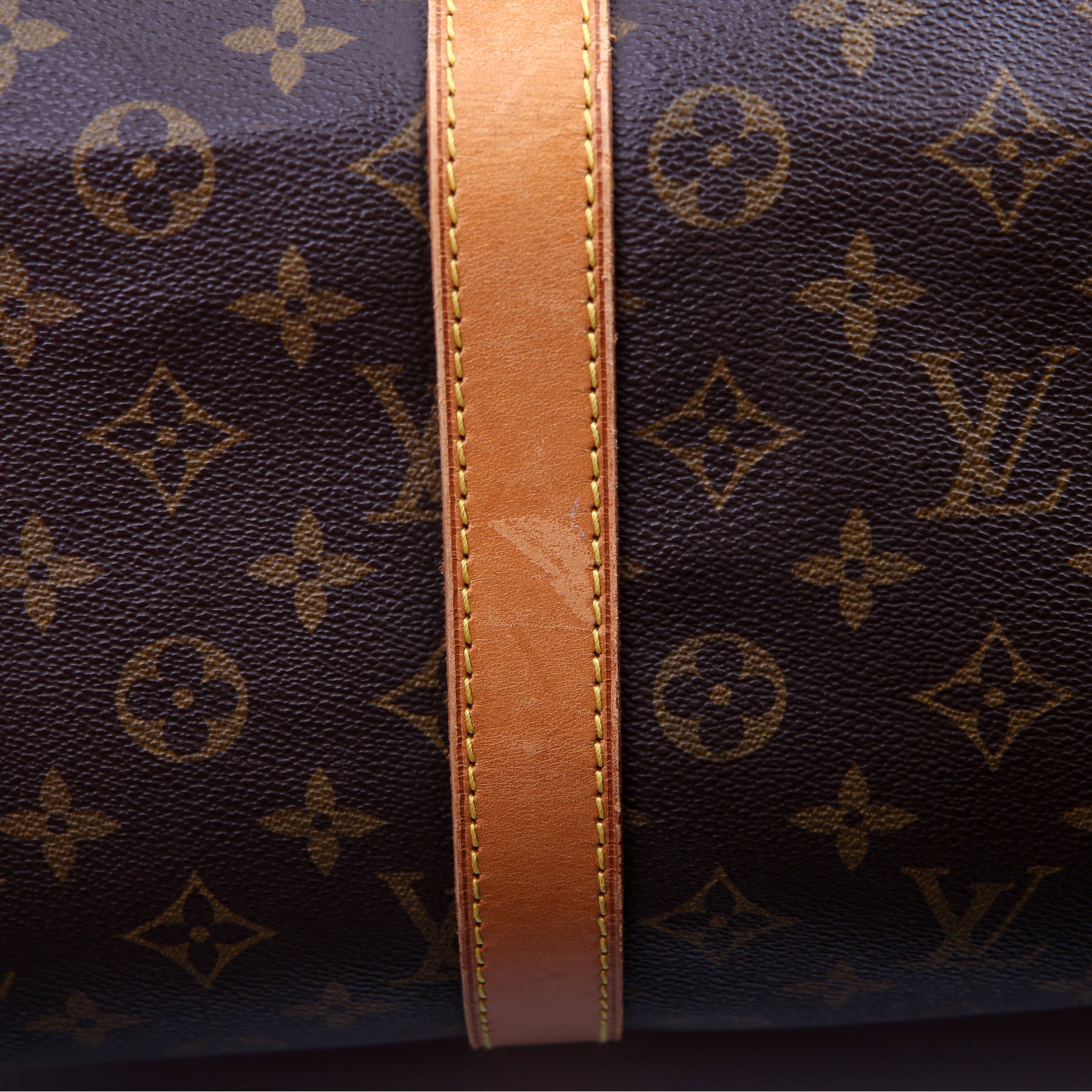 This pre-owned Louis Vuitton Keepall 55 is guaranteed 100% authentic. The exterior is in the classic Louis Vuitton Monogram coated canvas.