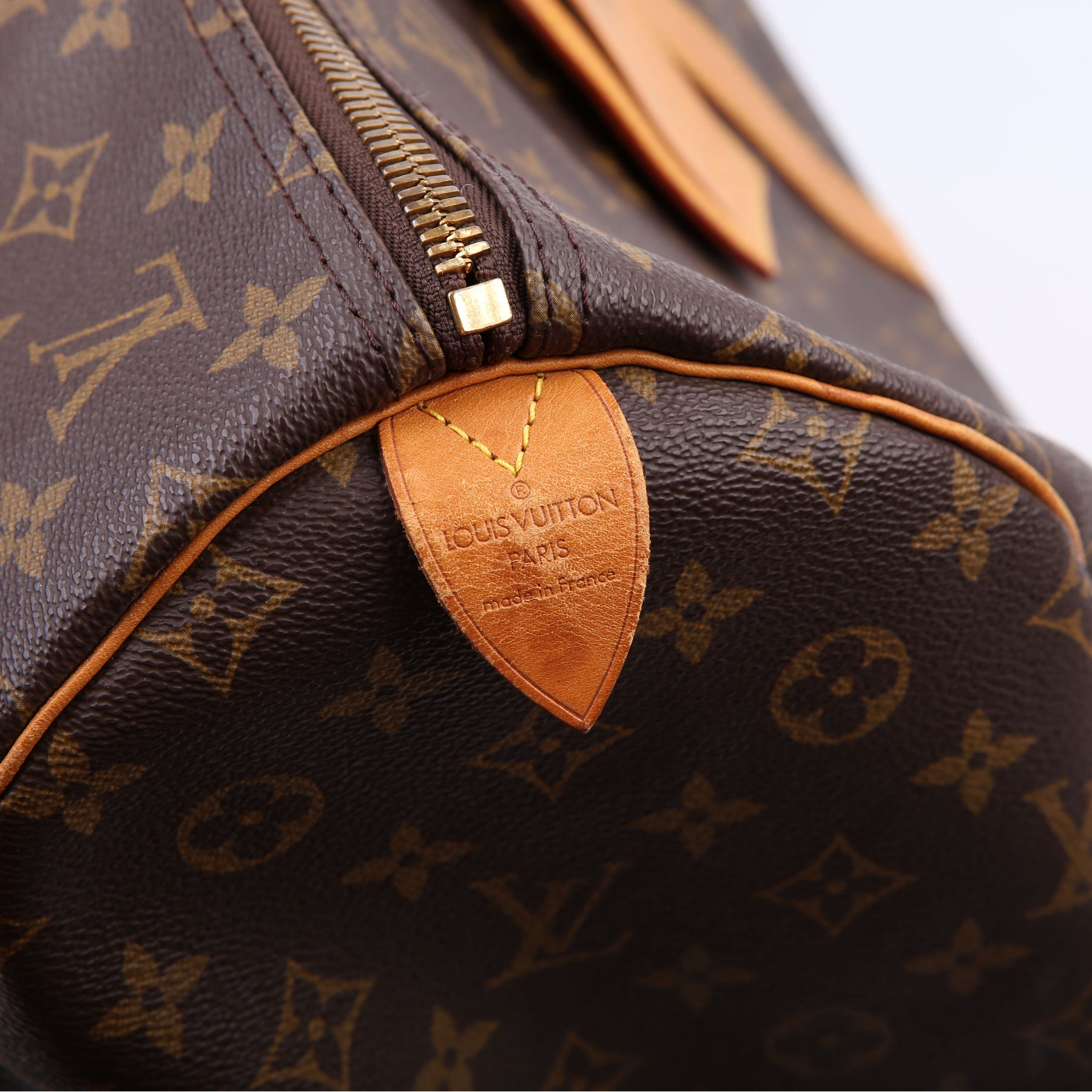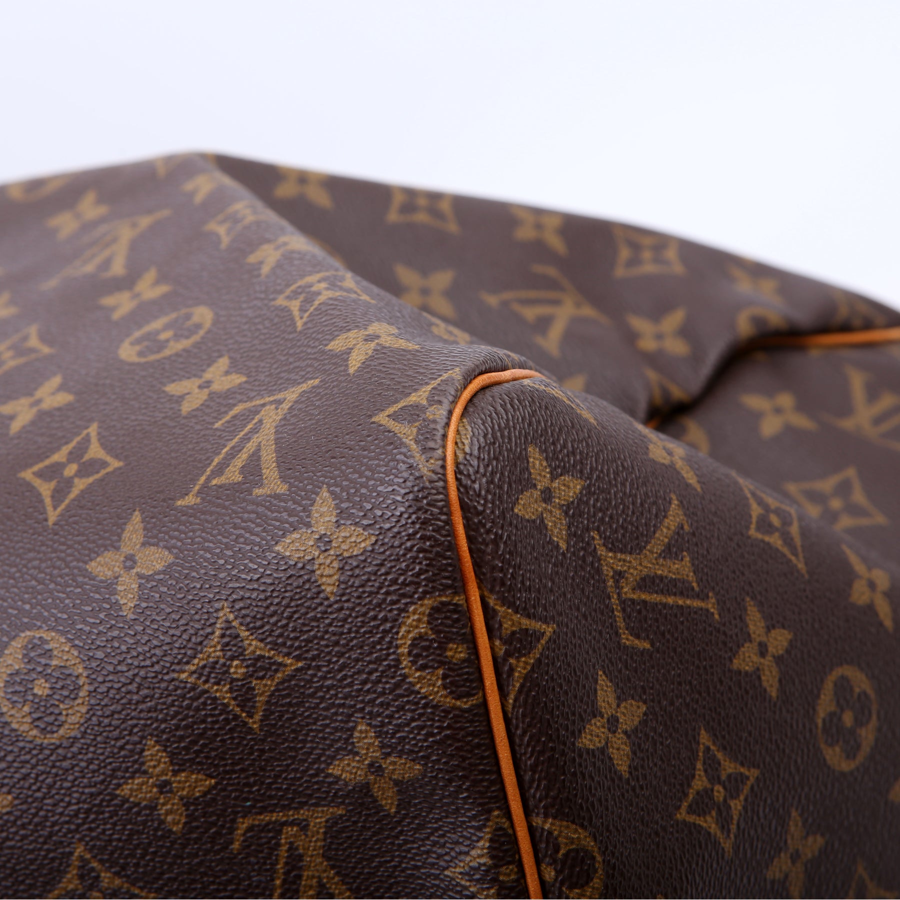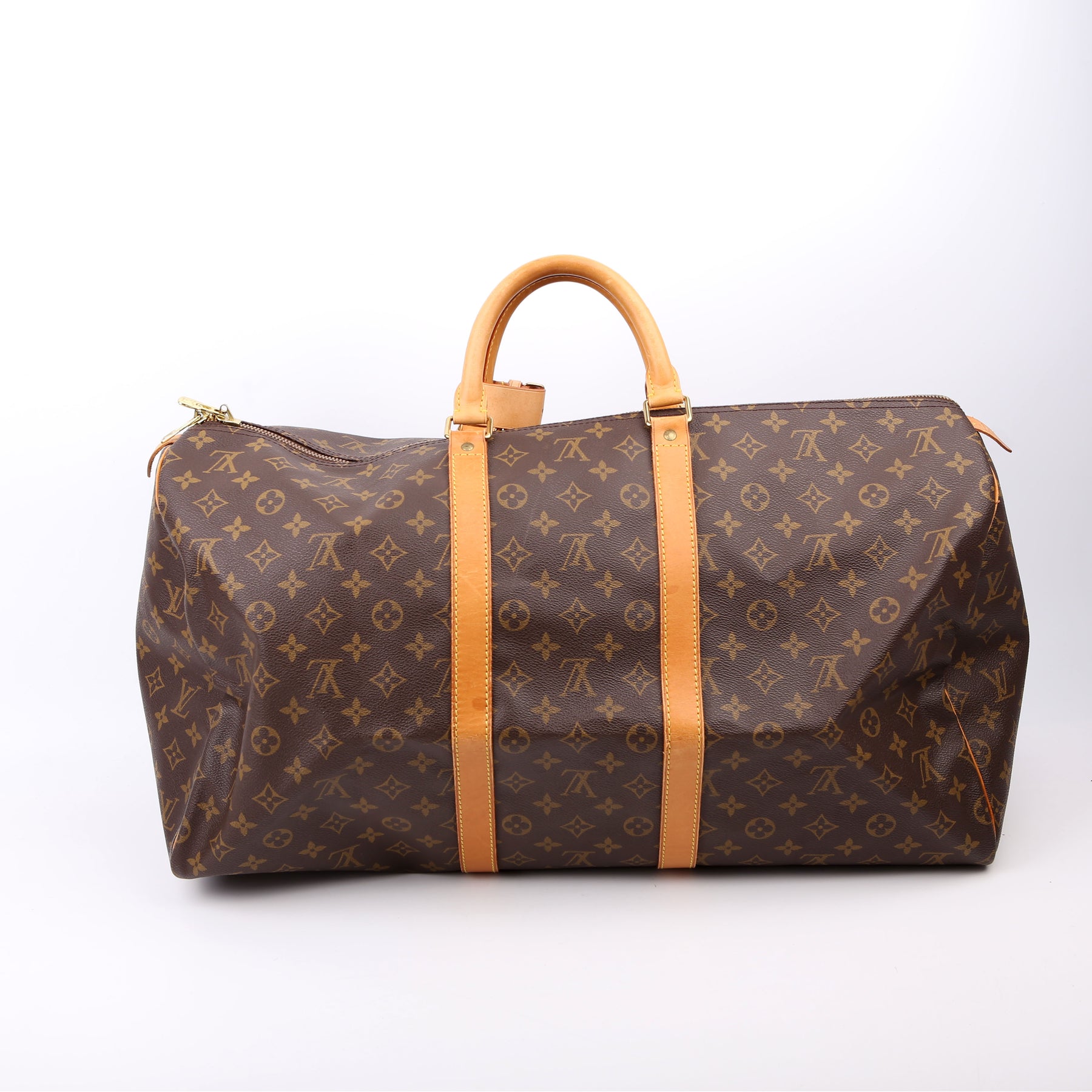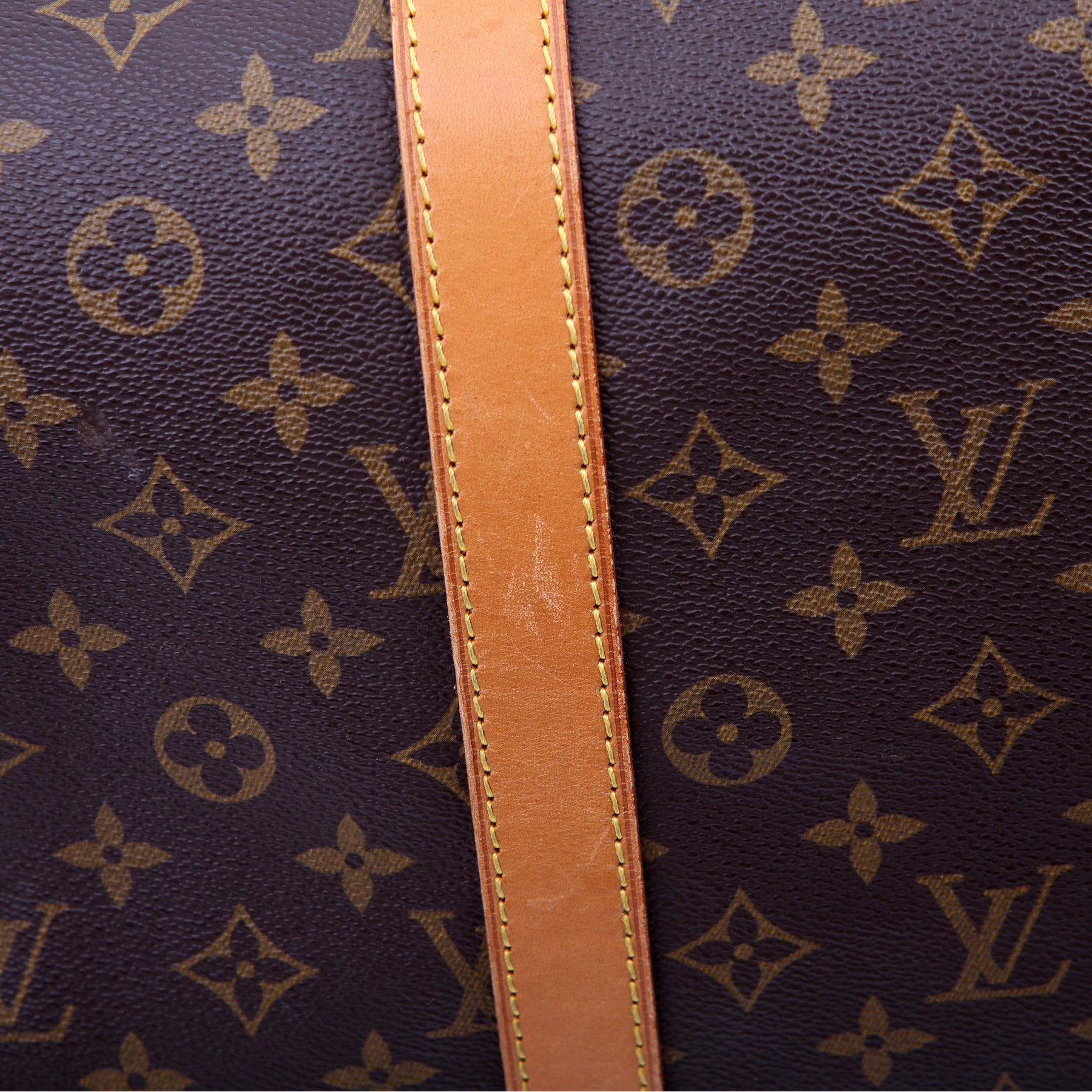 This pre-owned Louis Vuitton Keepall 55 is guaranteed 100% authentic. The exterior is in the classic Louis Vuitton Monogram coated canvas.