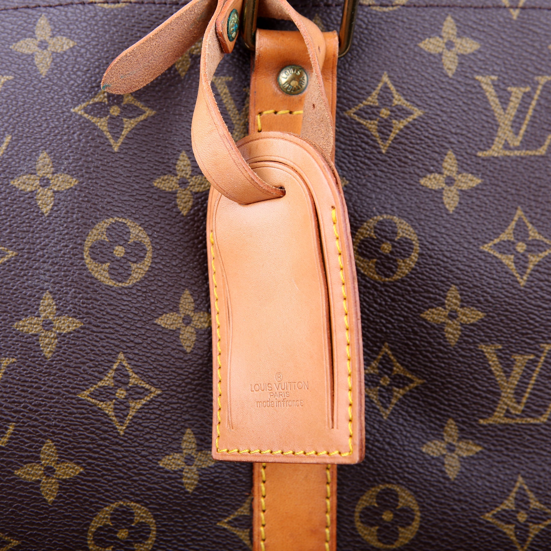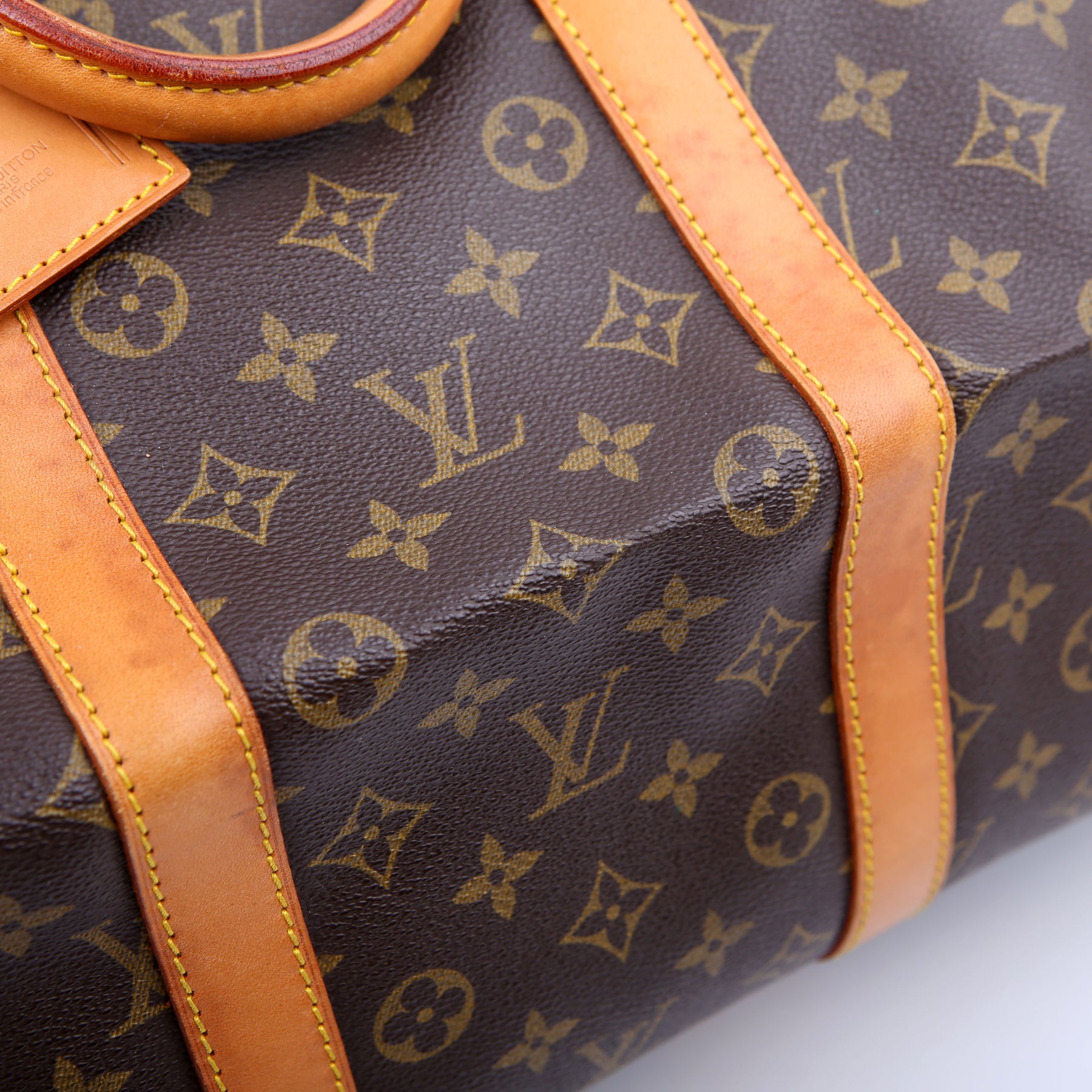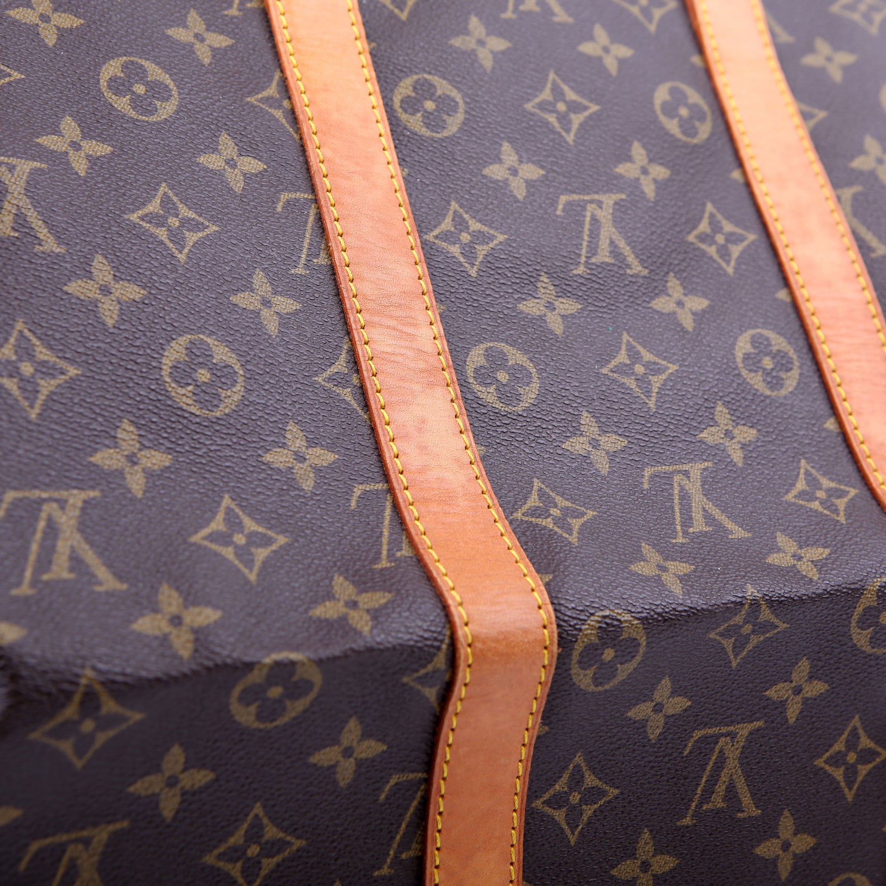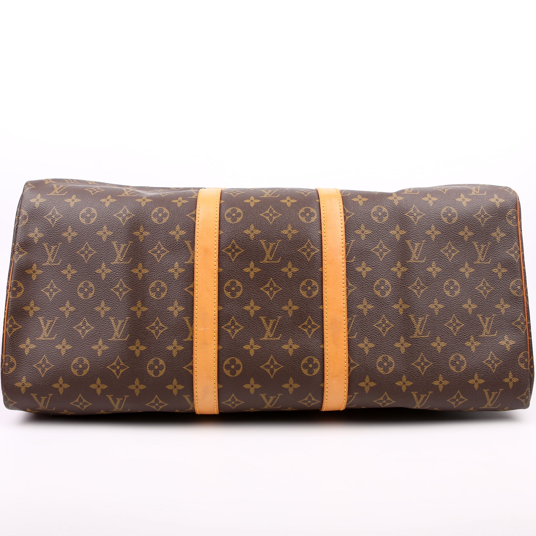 This pre-owned Louis Vuitton Keepall 55 is guaranteed 100% authentic. The exterior is in the classic Louis Vuitton Monogram coated canvas.