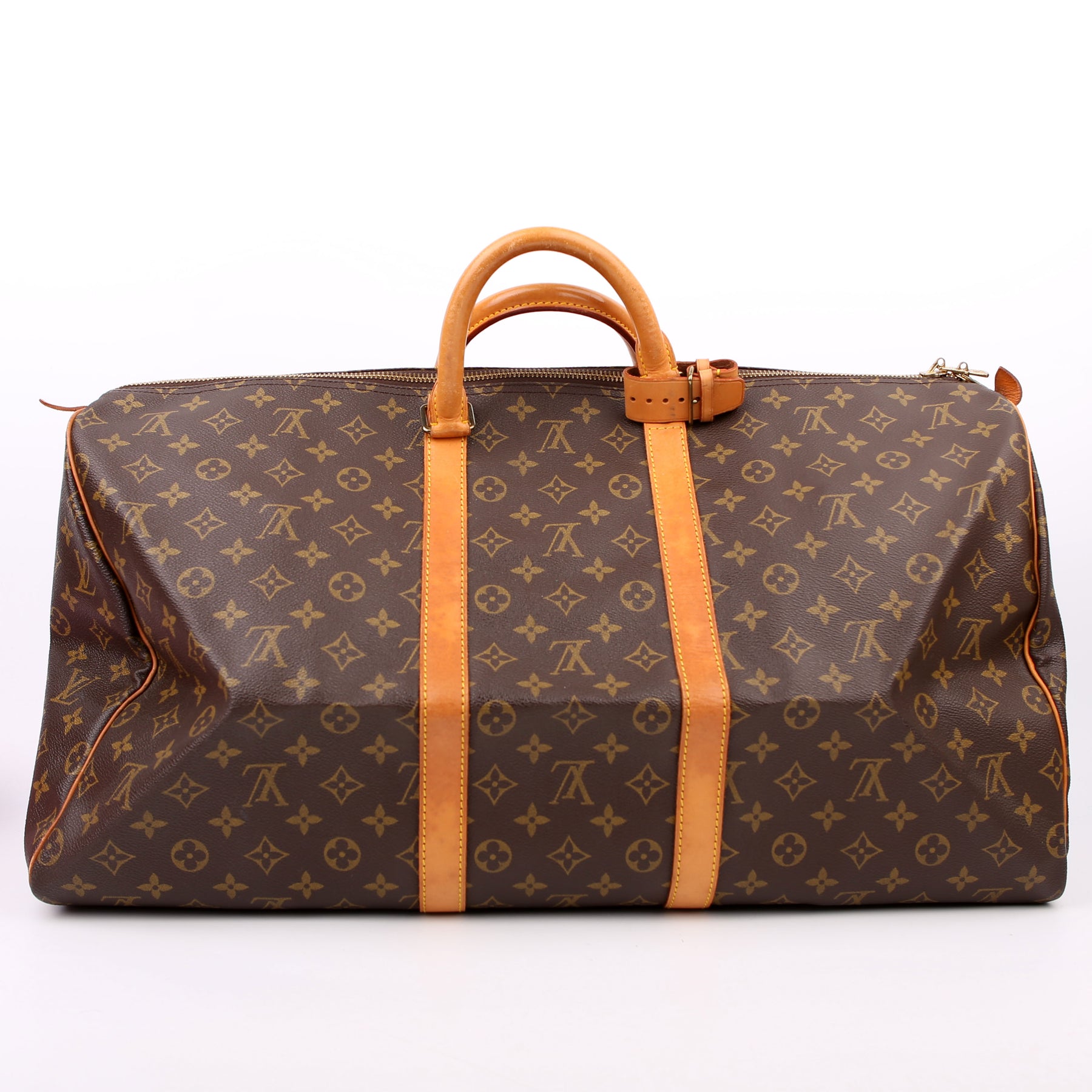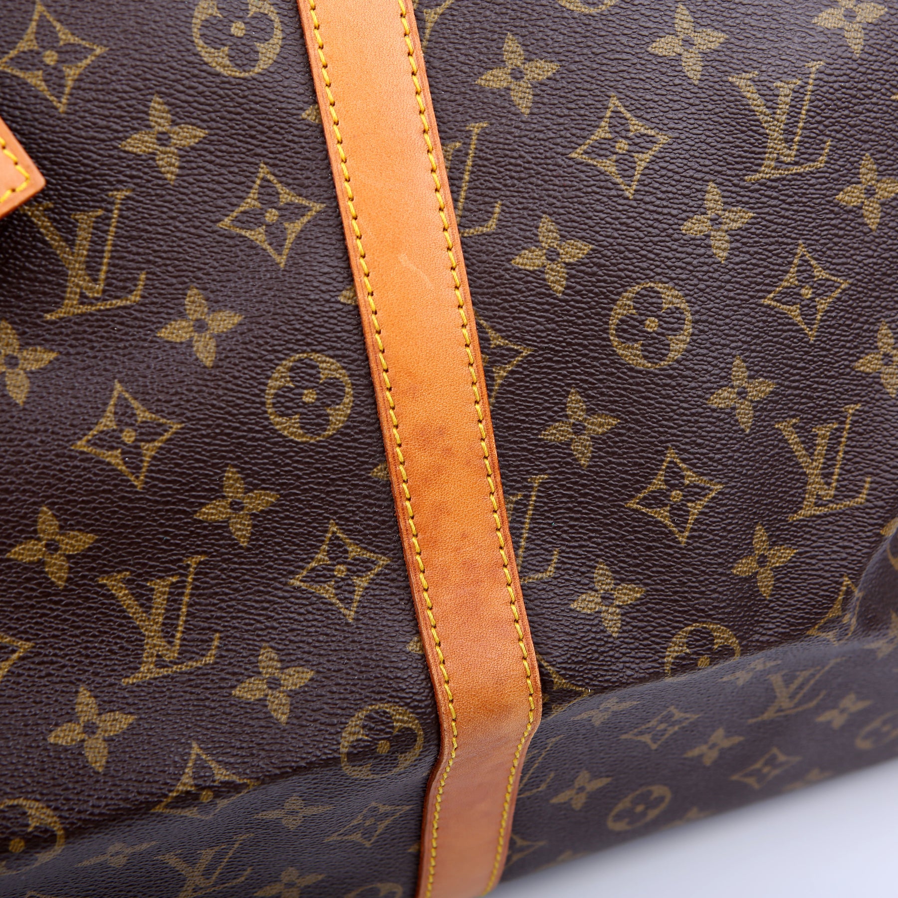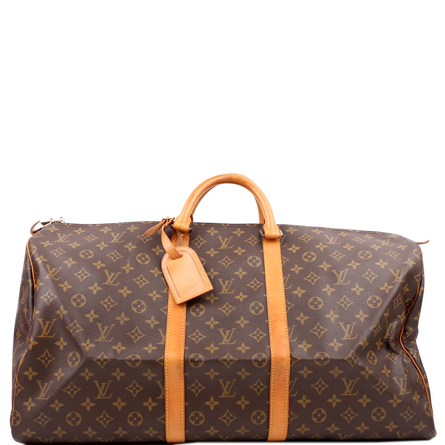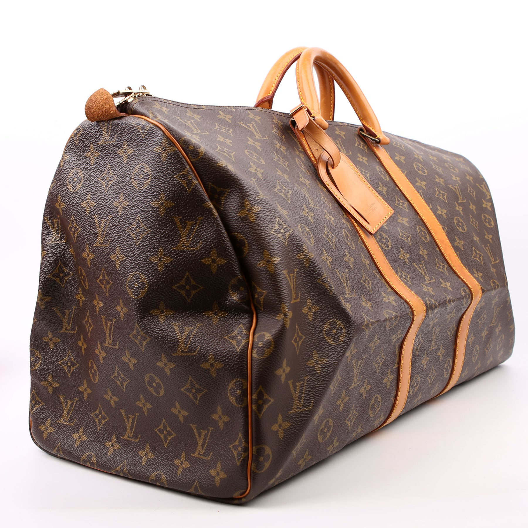 This pre-owned Louis Vuitton Keepall 55 is guaranteed 100% authentic. The exterior is in the classic Louis Vuitton Monogram coated canvas.