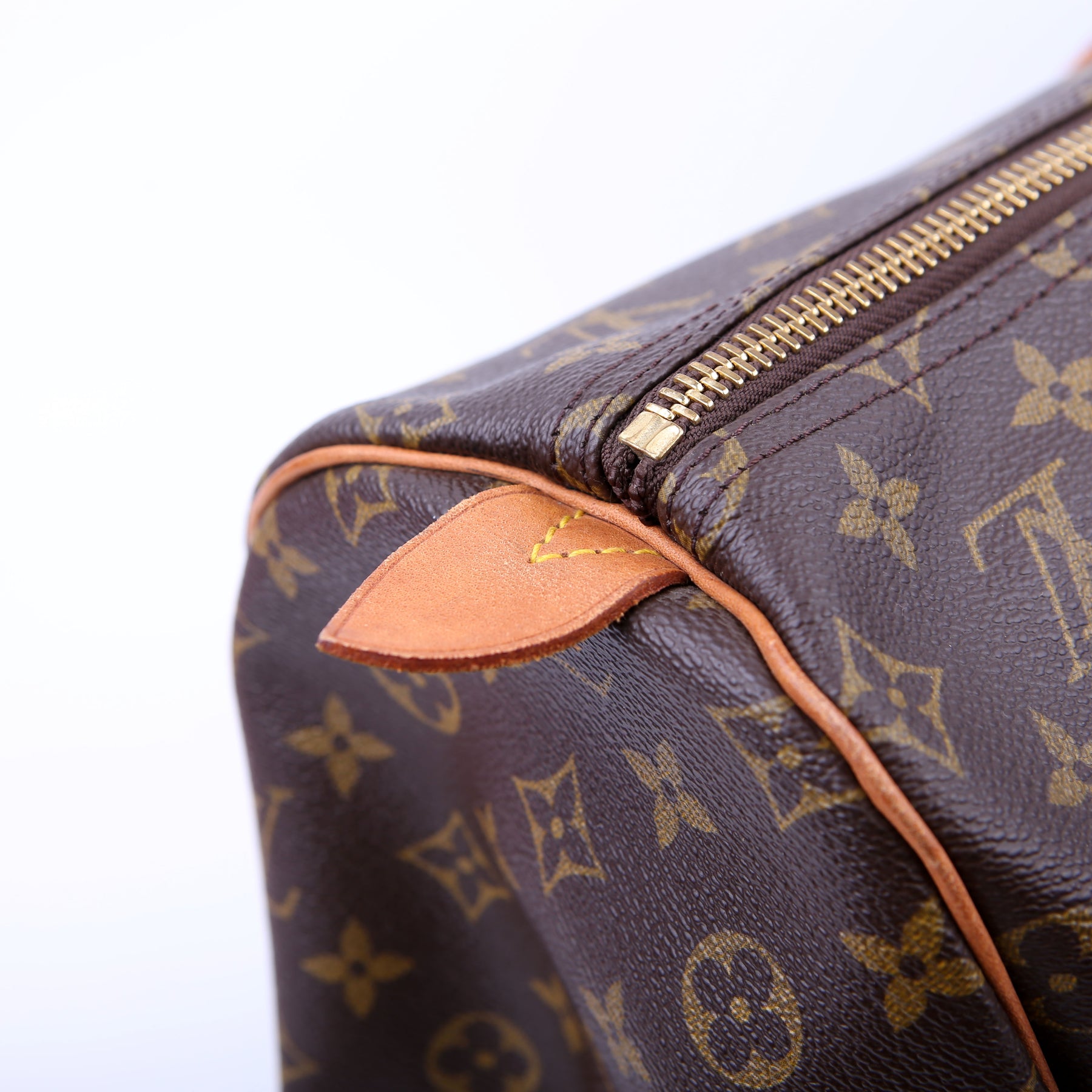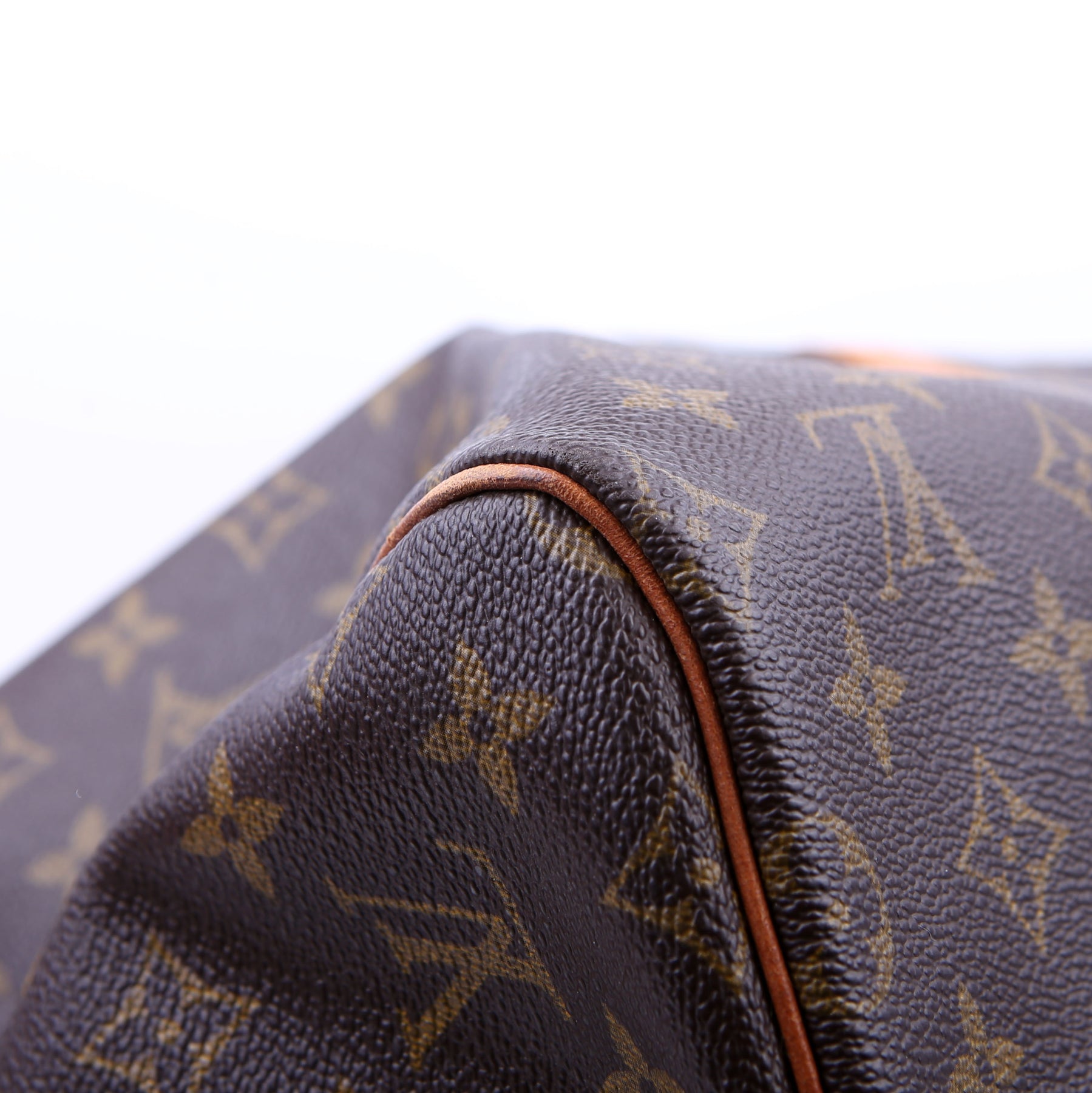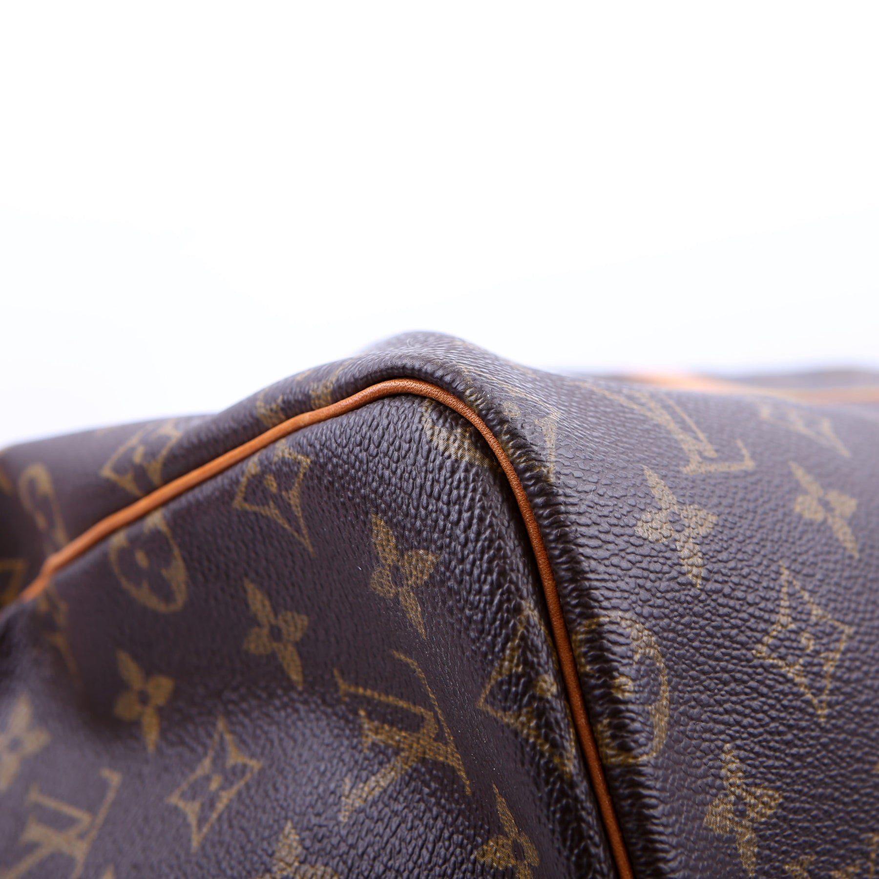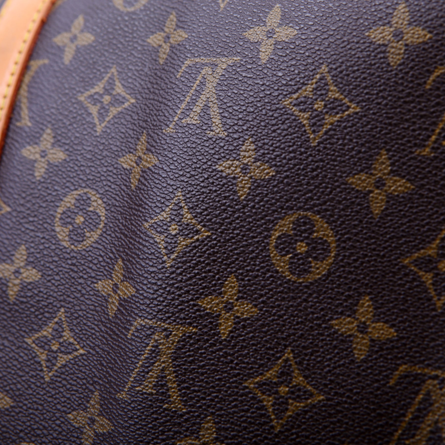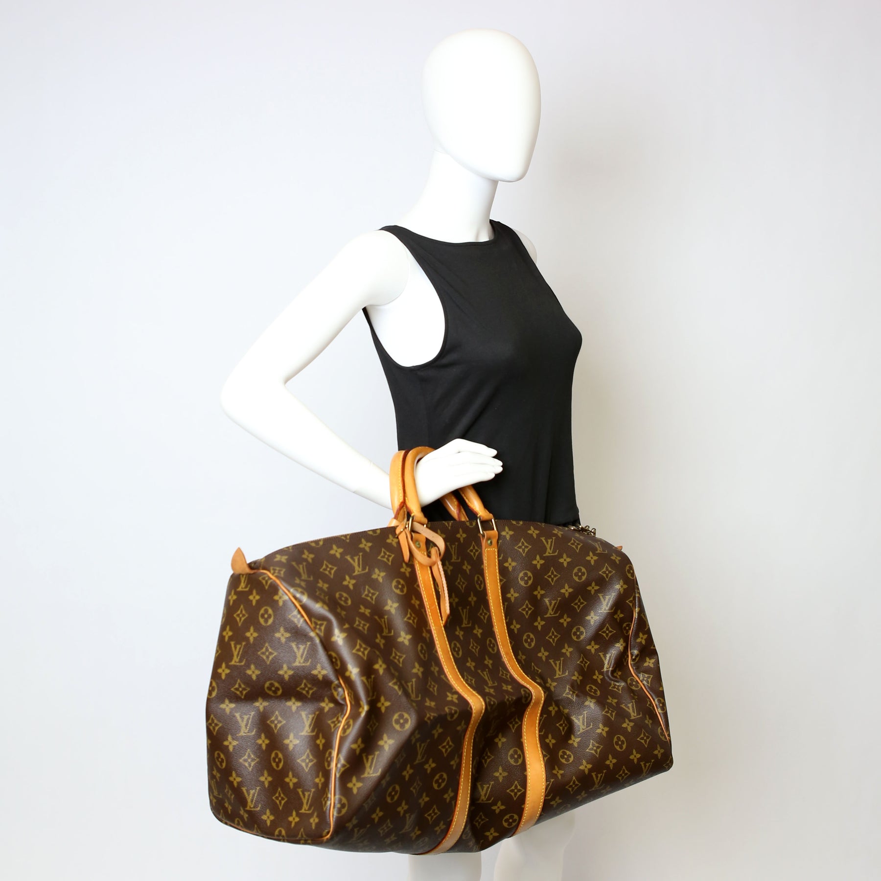 This pre-owned Louis Vuitton Keepall 55 is guaranteed 100% authentic. The exterior is in the classic Louis Vuitton Monogram coated canvas.