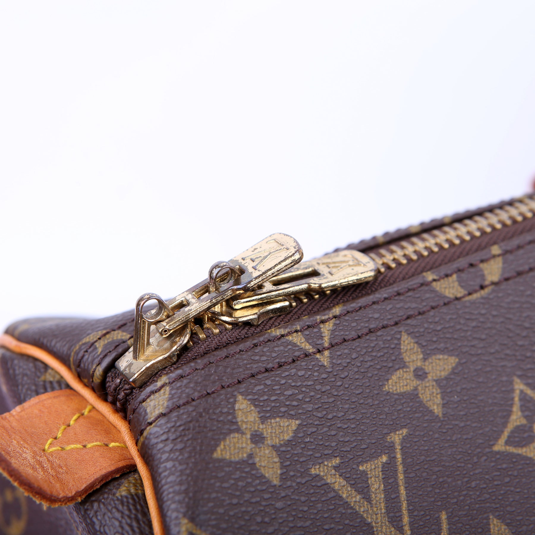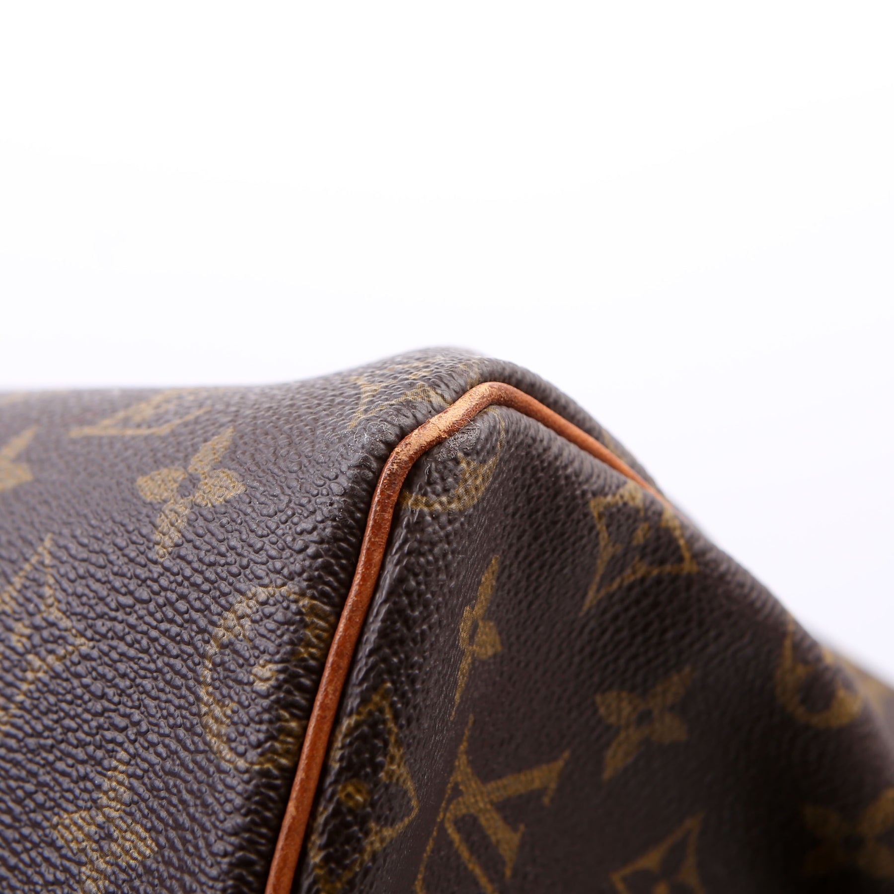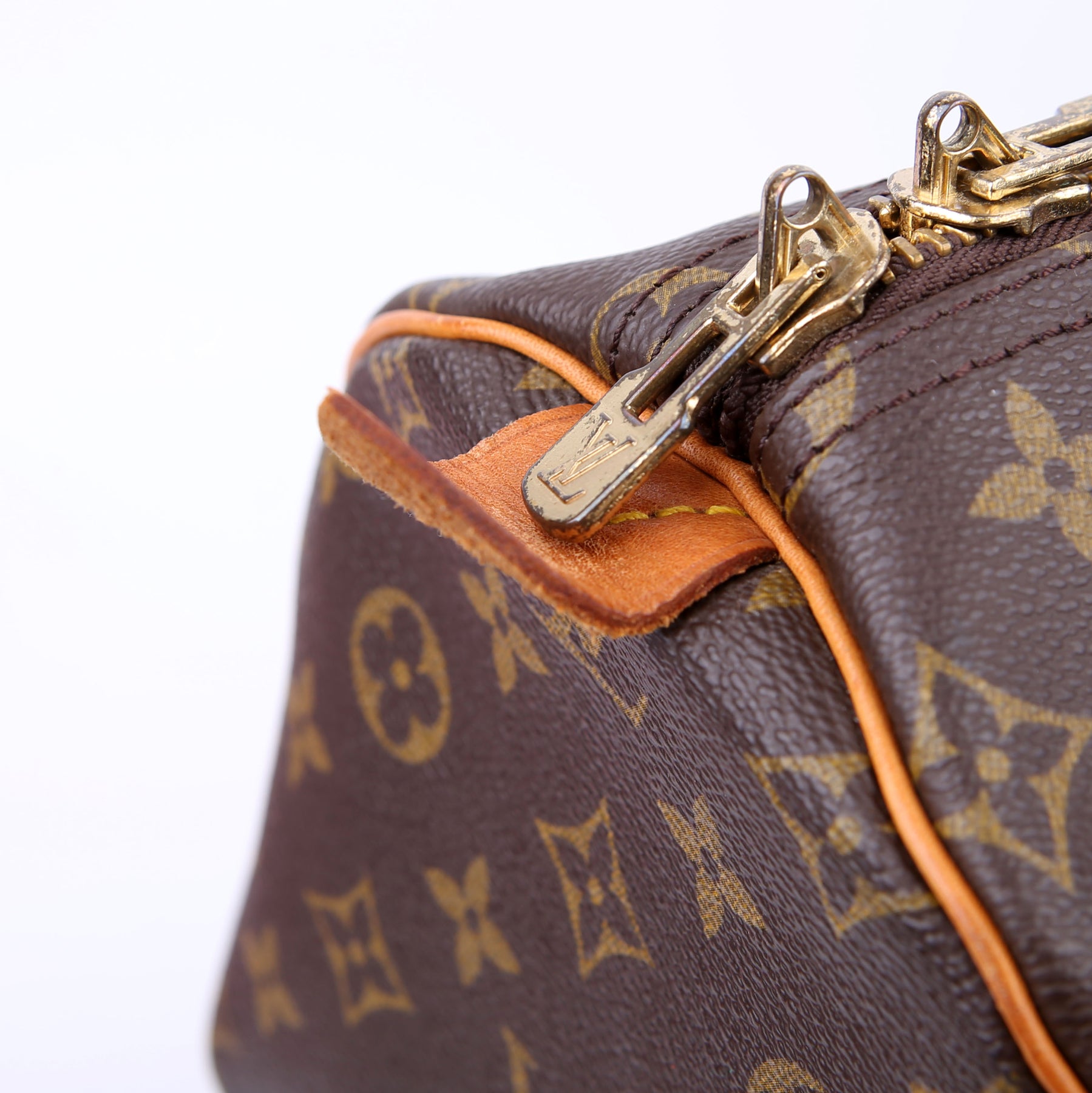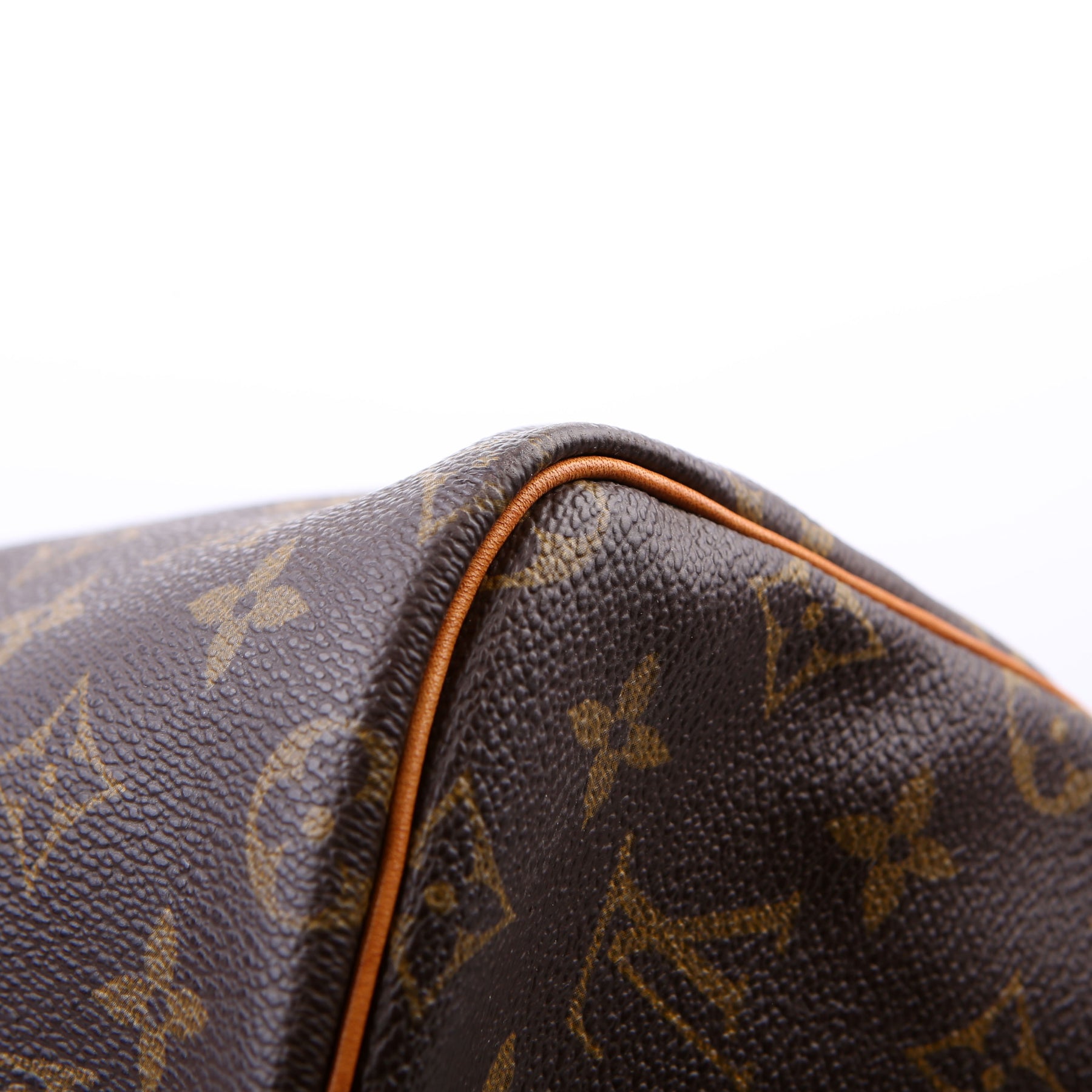 This pre-owned Louis Vuitton Keepall 55 is guaranteed 100% authentic. The exterior is in the classic Louis Vuitton Monogram coated canvas.