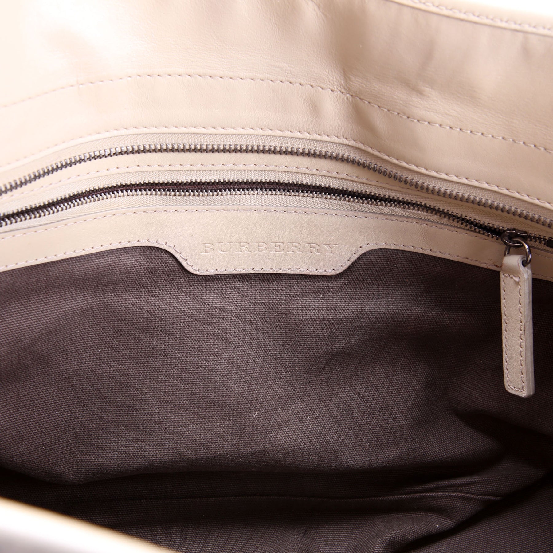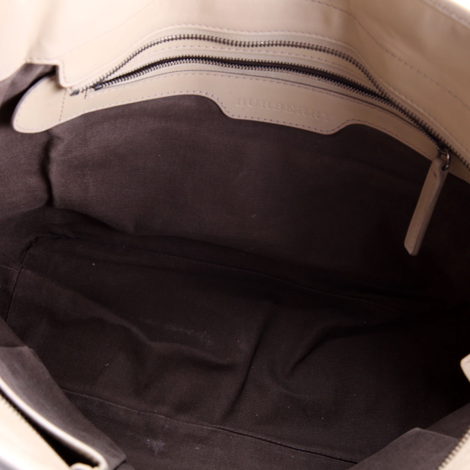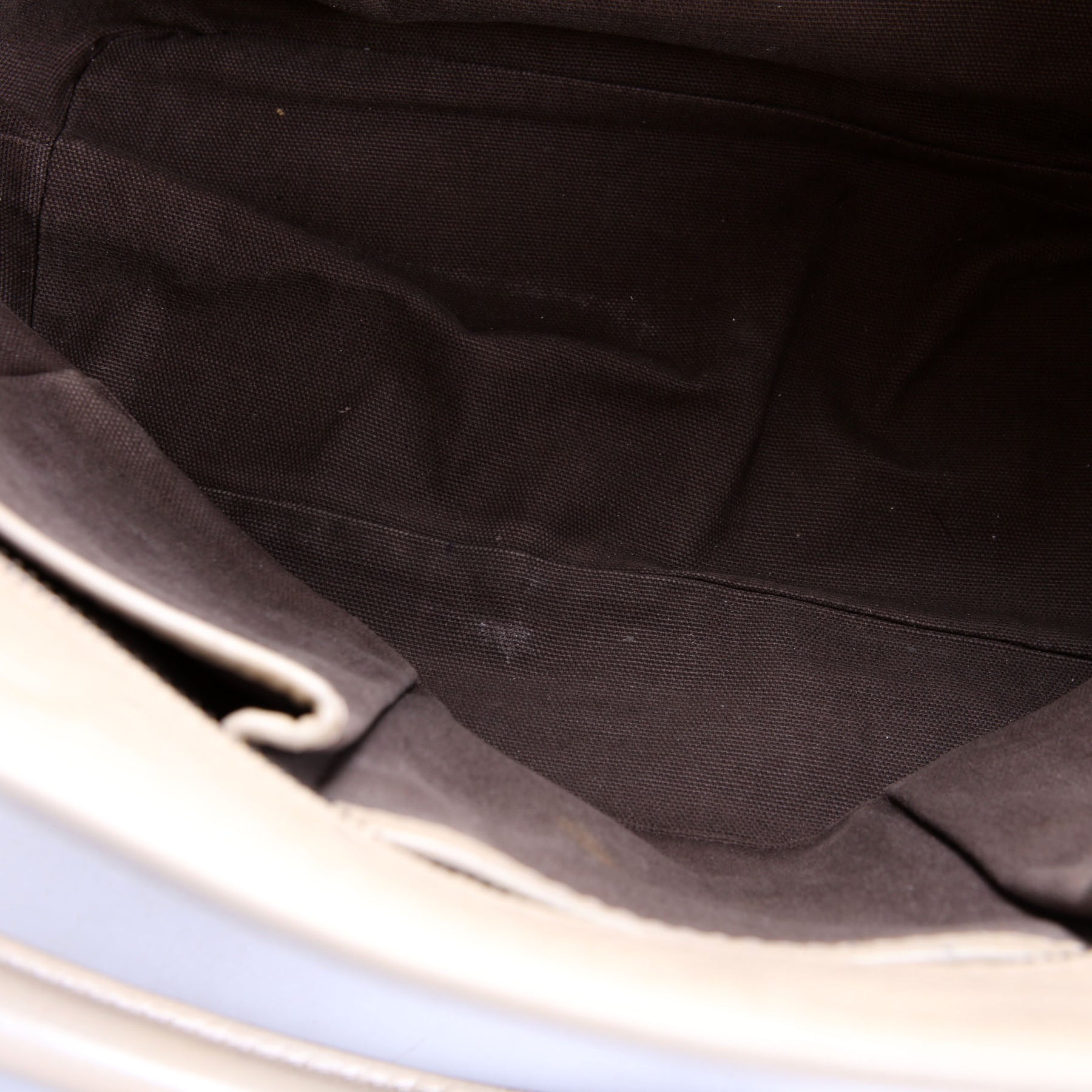 Interior: The interior shows light discoloration to the fabric. It features three open pockets and one zip closure pocket.