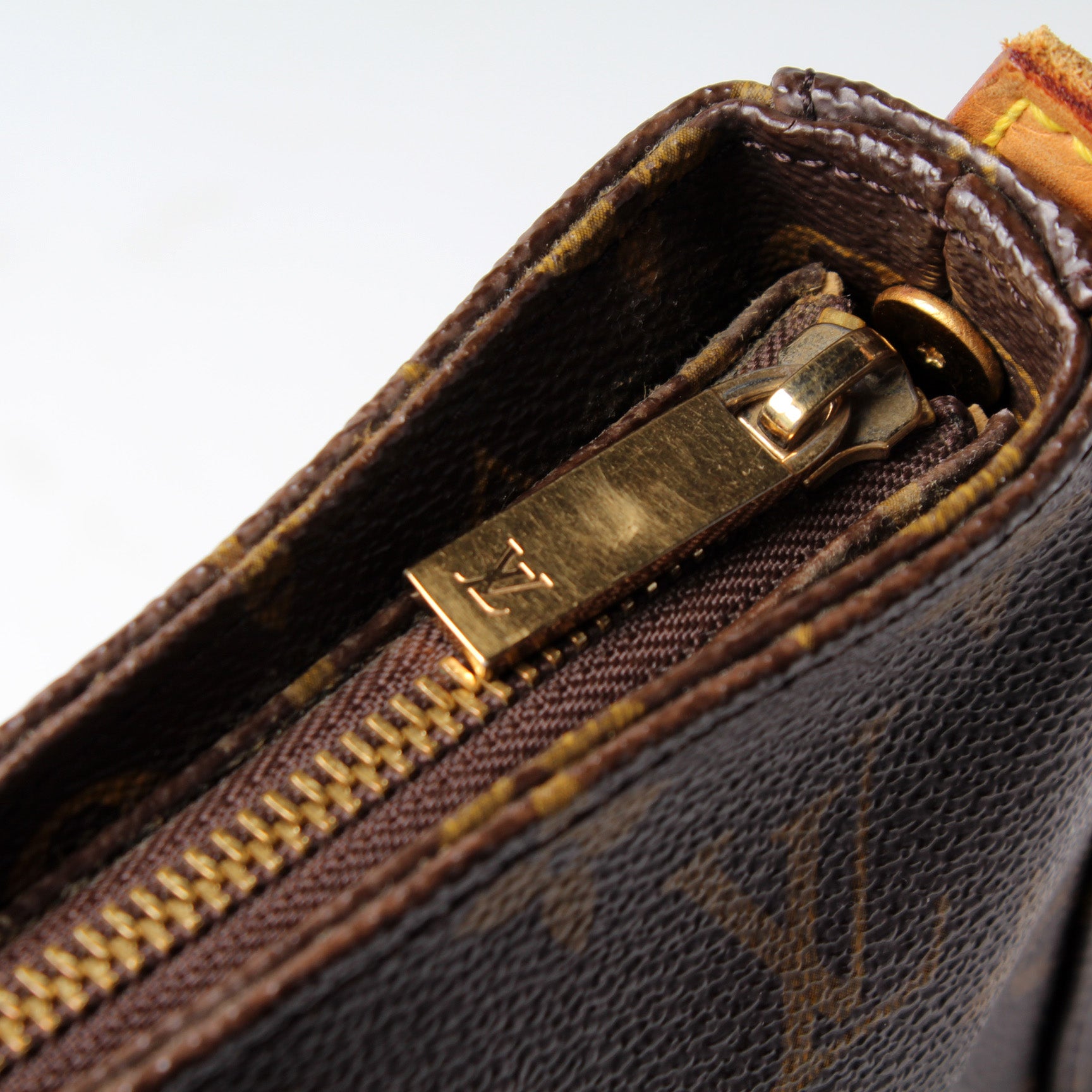 Handle: The leather handle shows wear and discoloration as pictured.