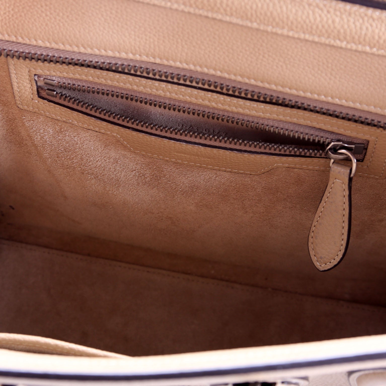 Interior: The interior shows pen marks in one of the corners. It features two open pockets, and one zip closure pocket.