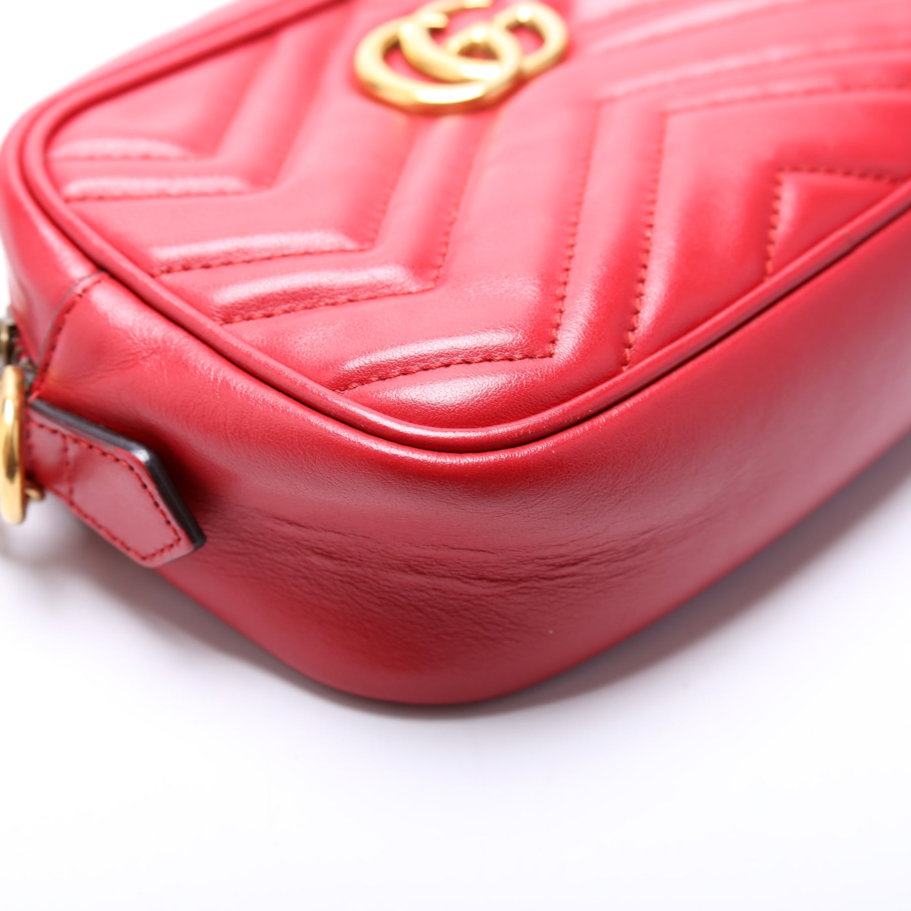This pre-owned Marmont Mini Camera Bag is guaranteed 100% authentic. The exterior is in the classic Gucci Marmont leather.