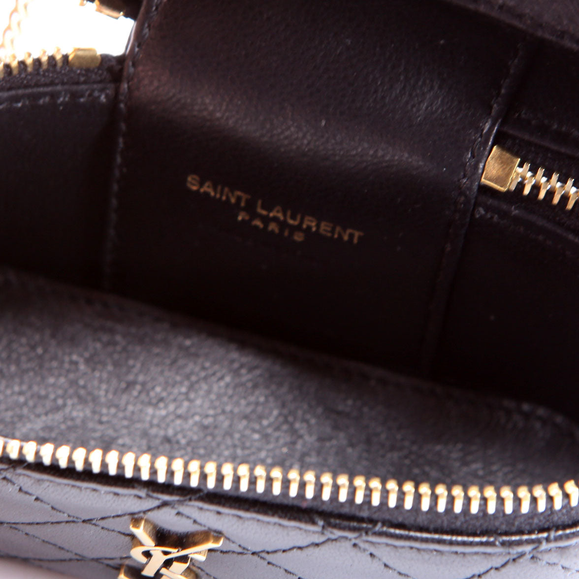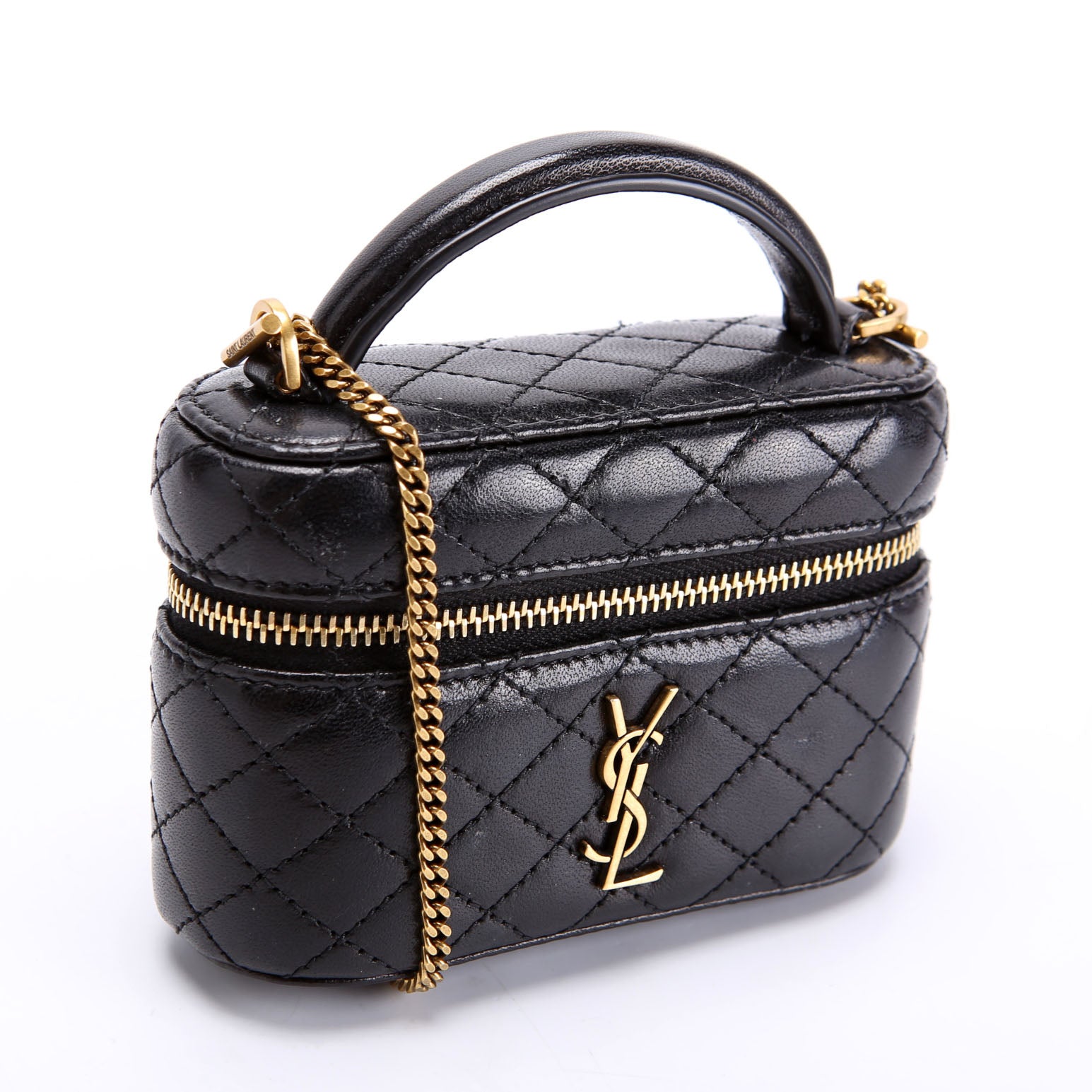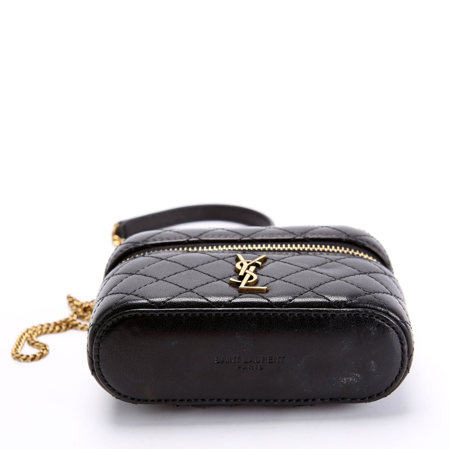 This pre-owned Saint Laurent Micro Gaby Vanity Bag is guaranteed 100% authentic. The exterior is in the classic Lambskin leather.