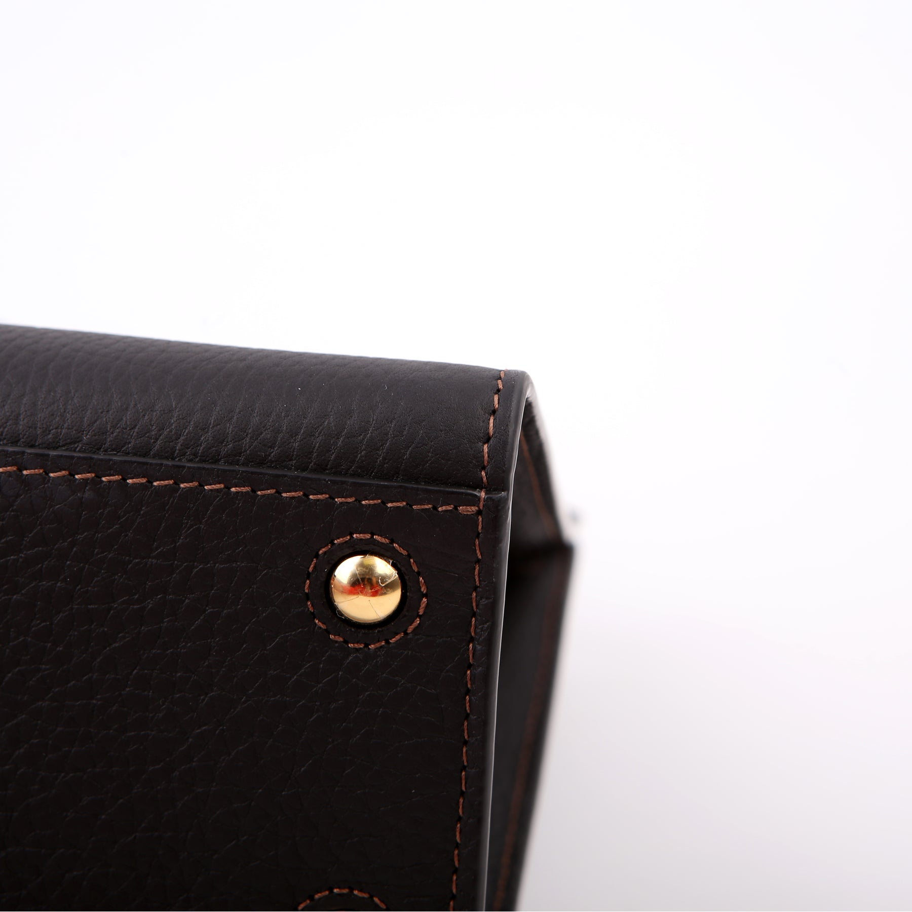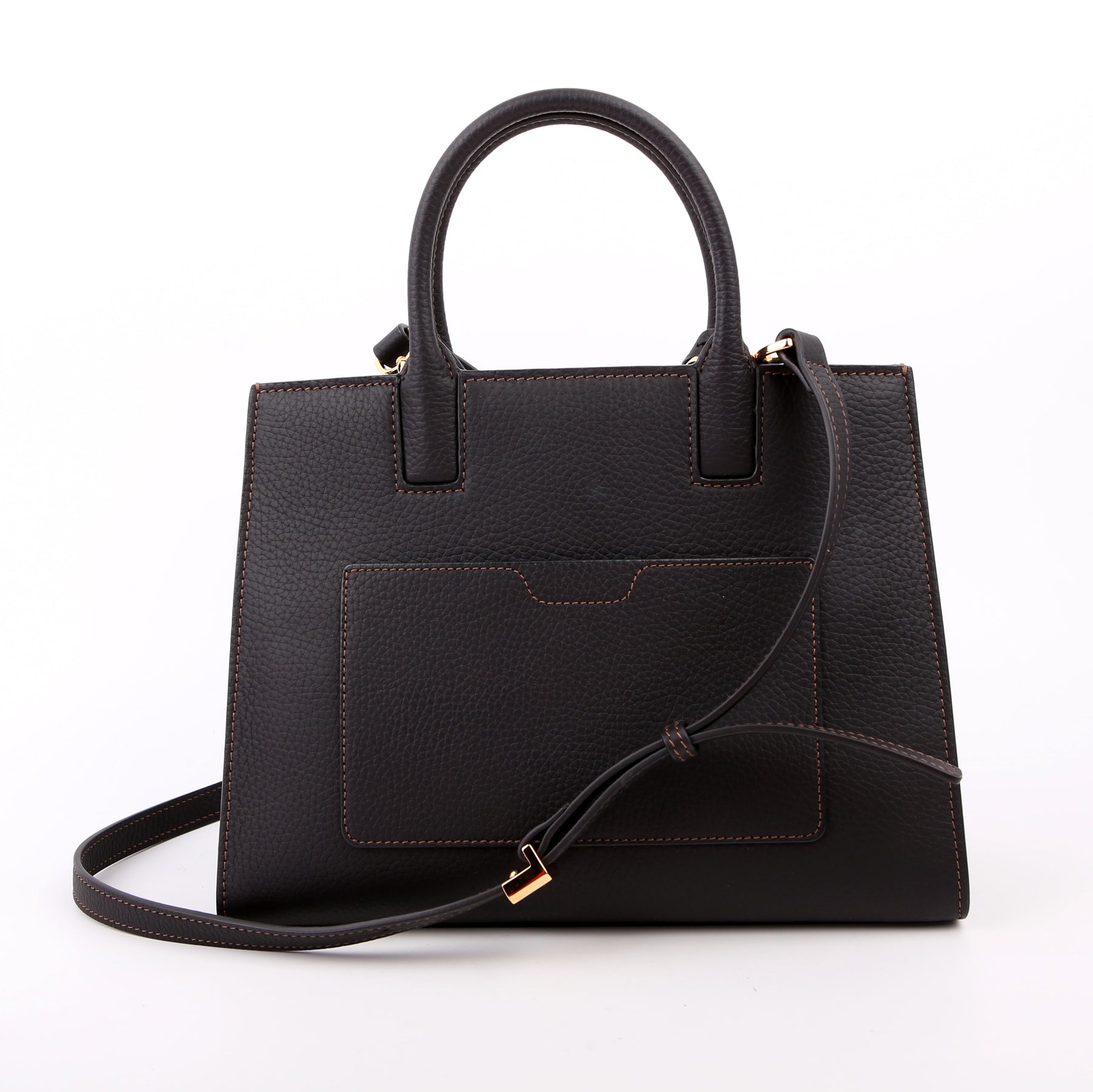 Exterior: The exterior leather has light scuffs throughout. The edges on the base has minor rubbing. The exterior features one open pocket.