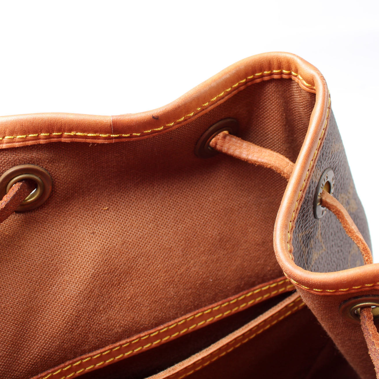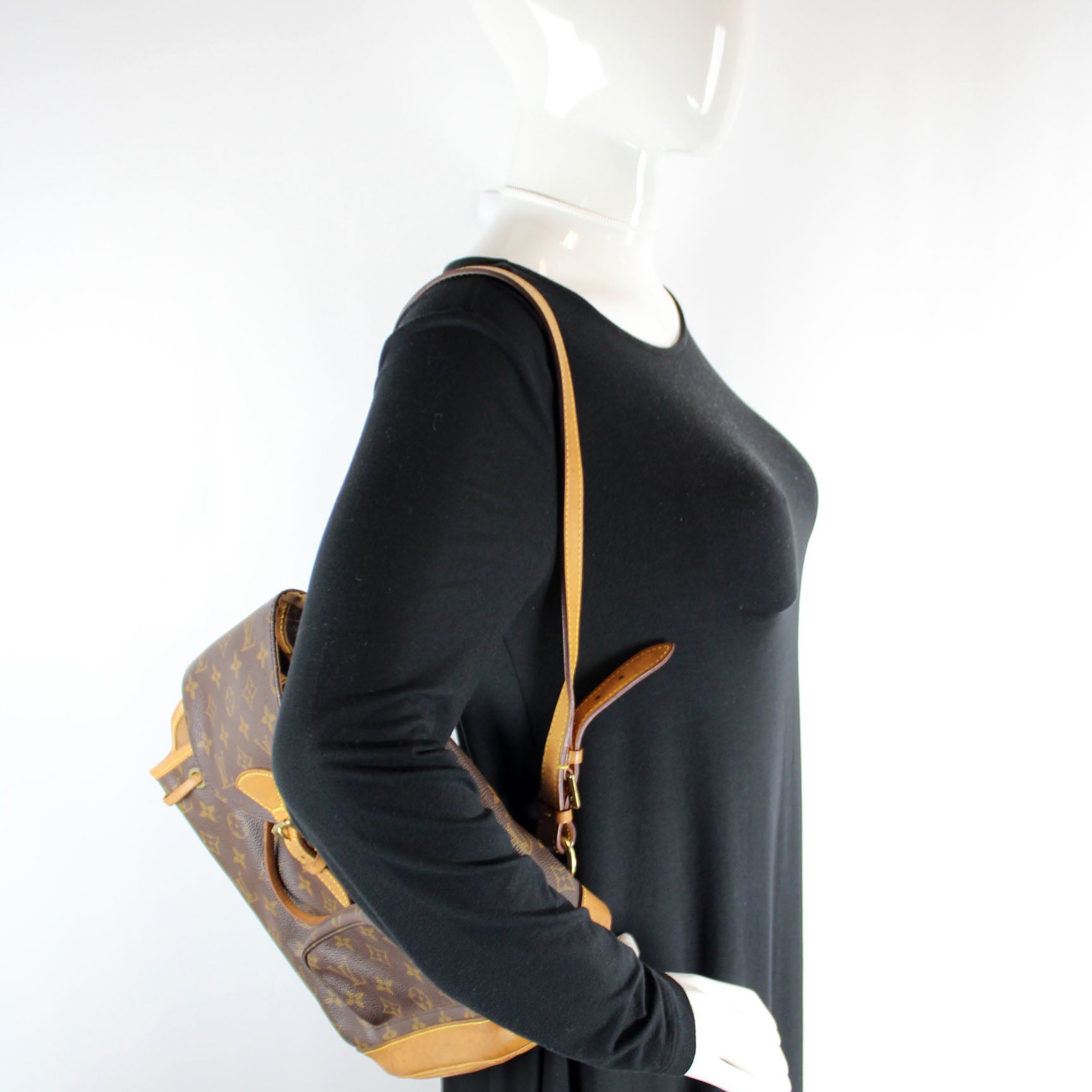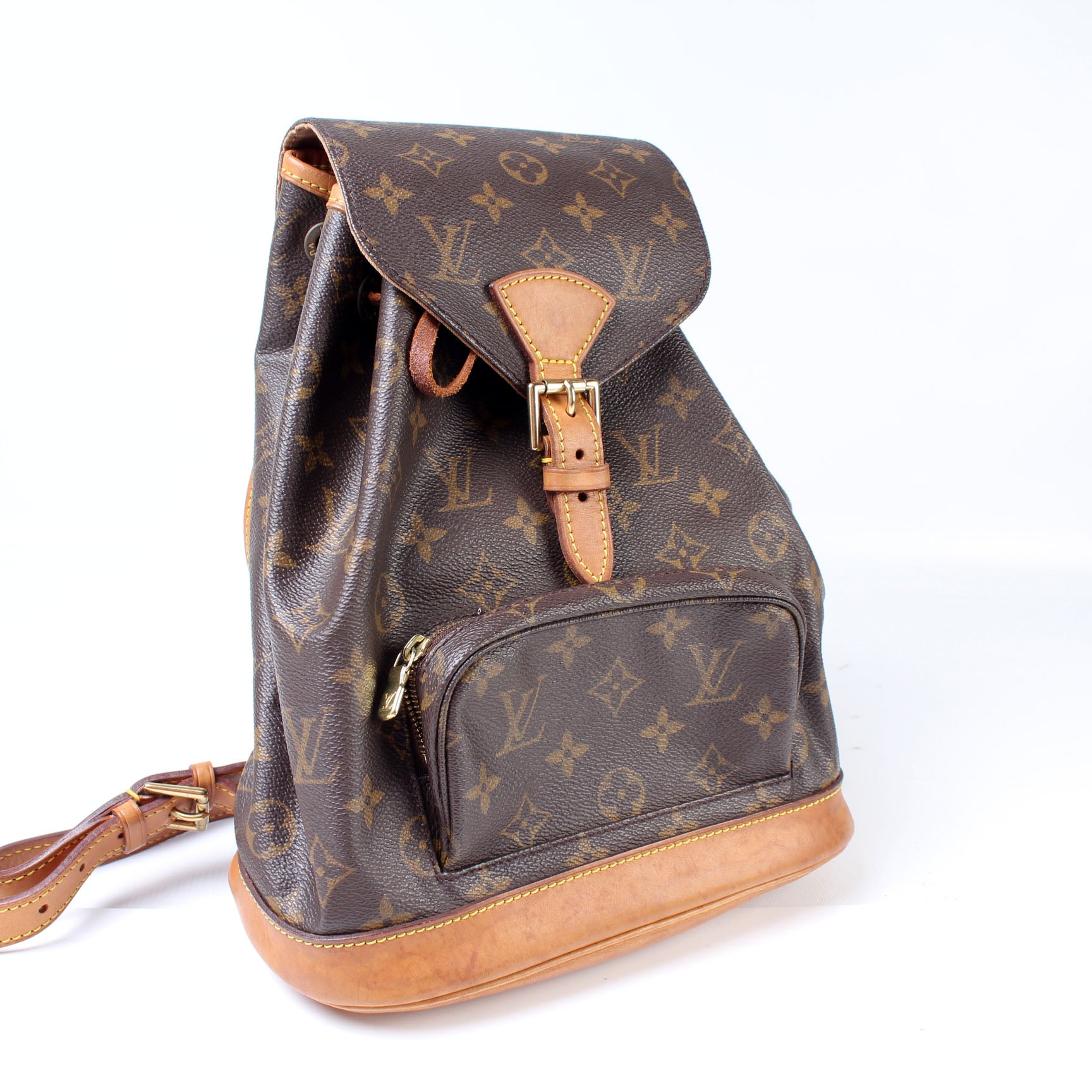 This pre-owned Louis Vuitton Montsouris MM is guaranteed 100% authentic. The exterior is in the classic Louis Vuitton Monogram coated canvas.