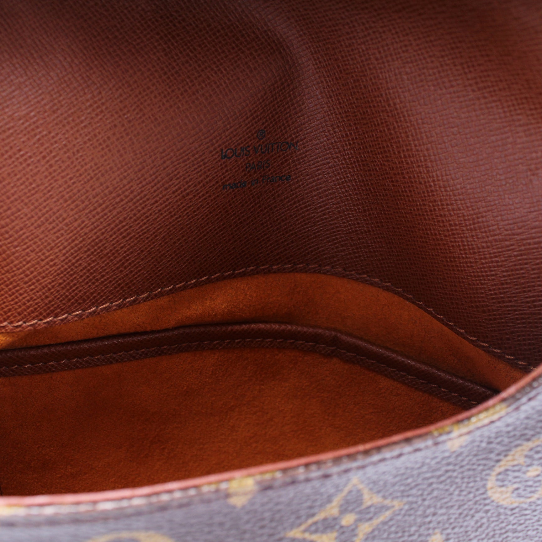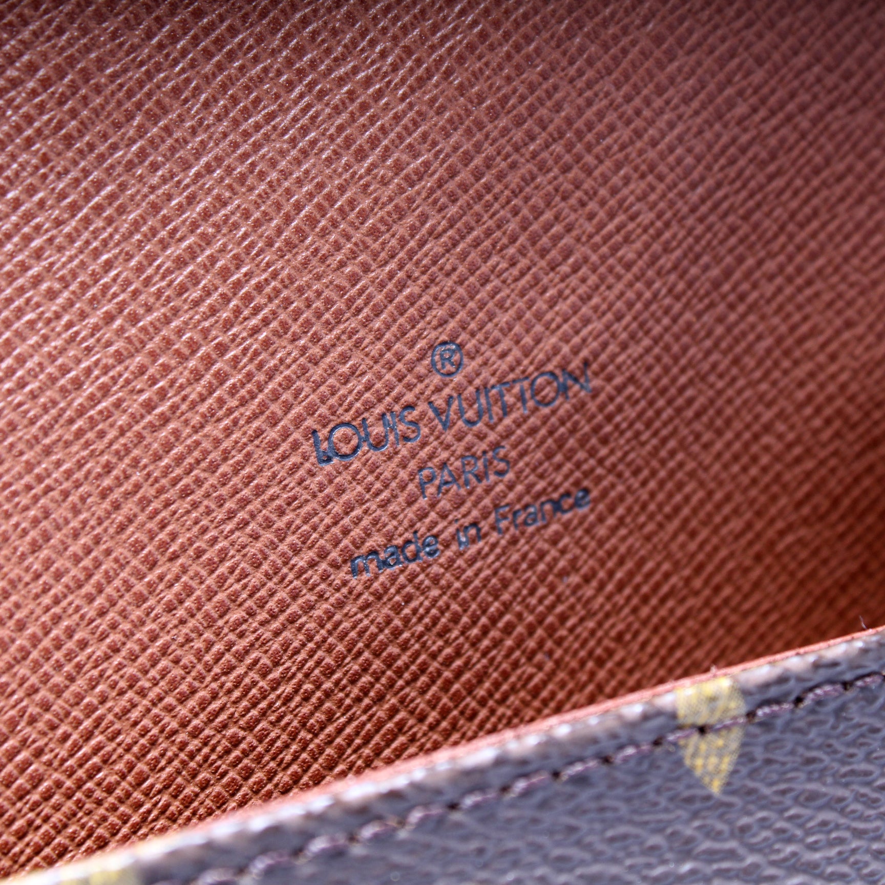 Exterior: The exterior coated canvas is free of any rips or cracks. The corners and leather details show minor wear and discoloration.