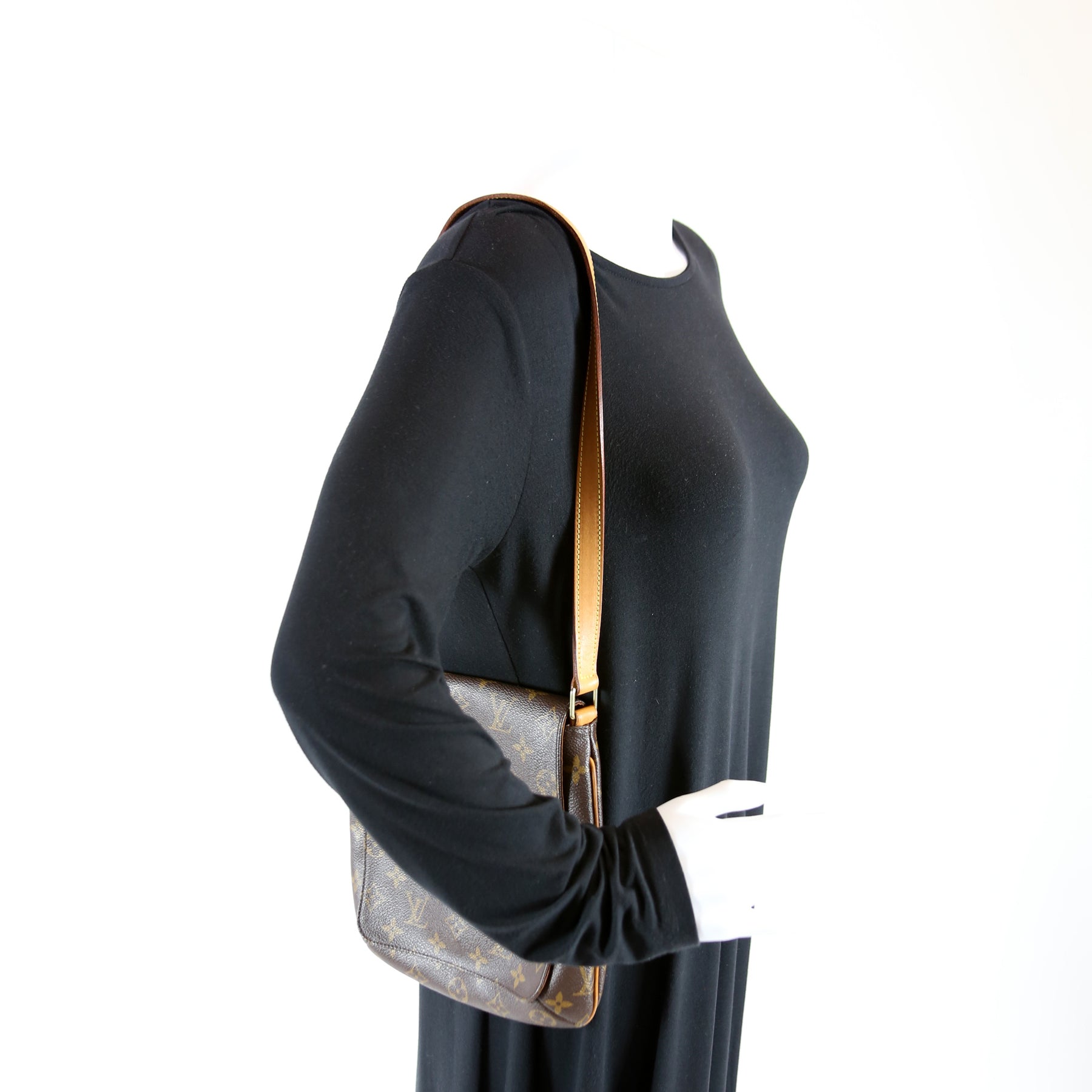This pre-owned Louis Vuitton Musette Salsa Short is guaranteed 100% authentic. The exterior is in the classic Louis Vuitton Monogram coated canvas.