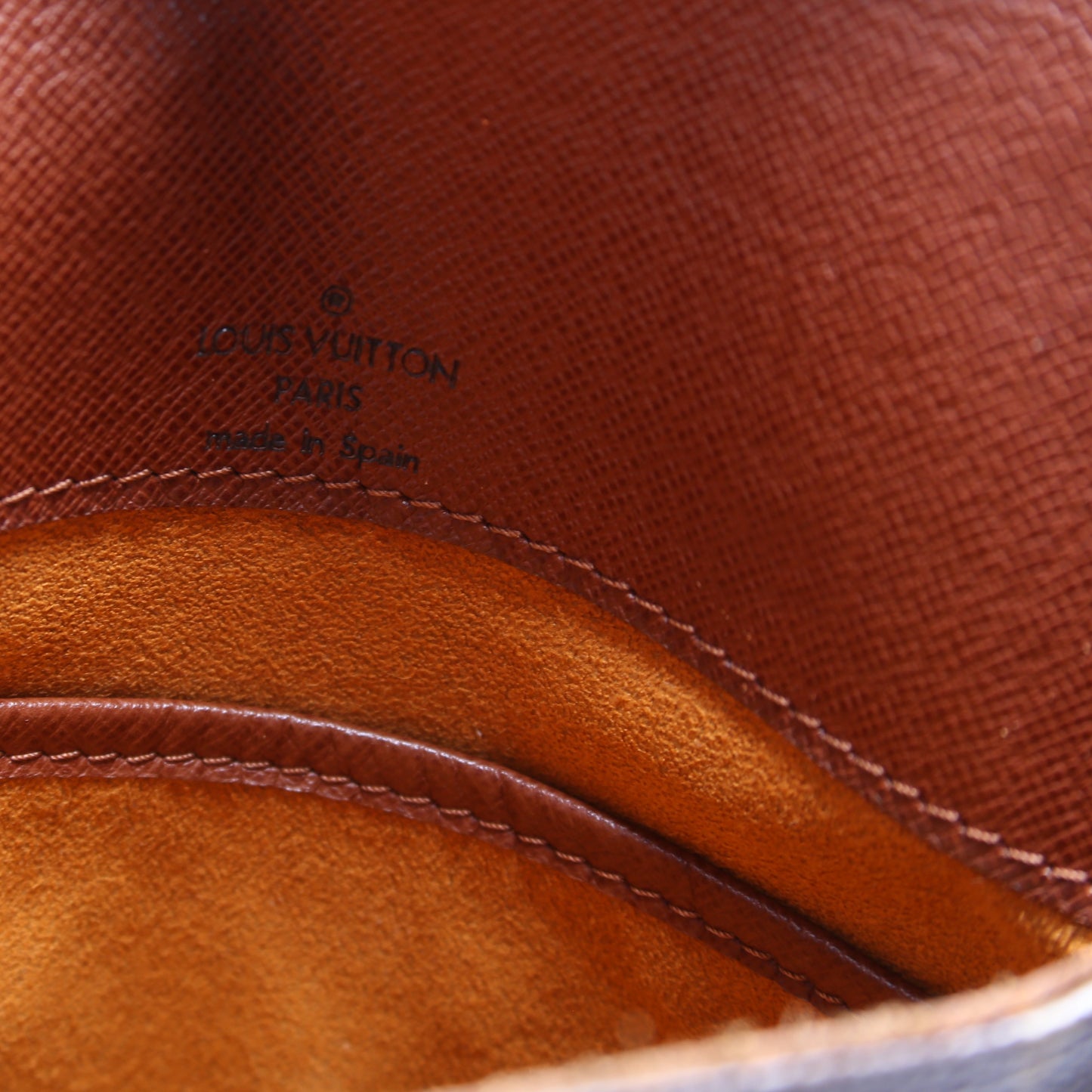 Exterior: The exterior coated canvas is free of any rips or cracks. The leather trim shows minor discoloration and wear.