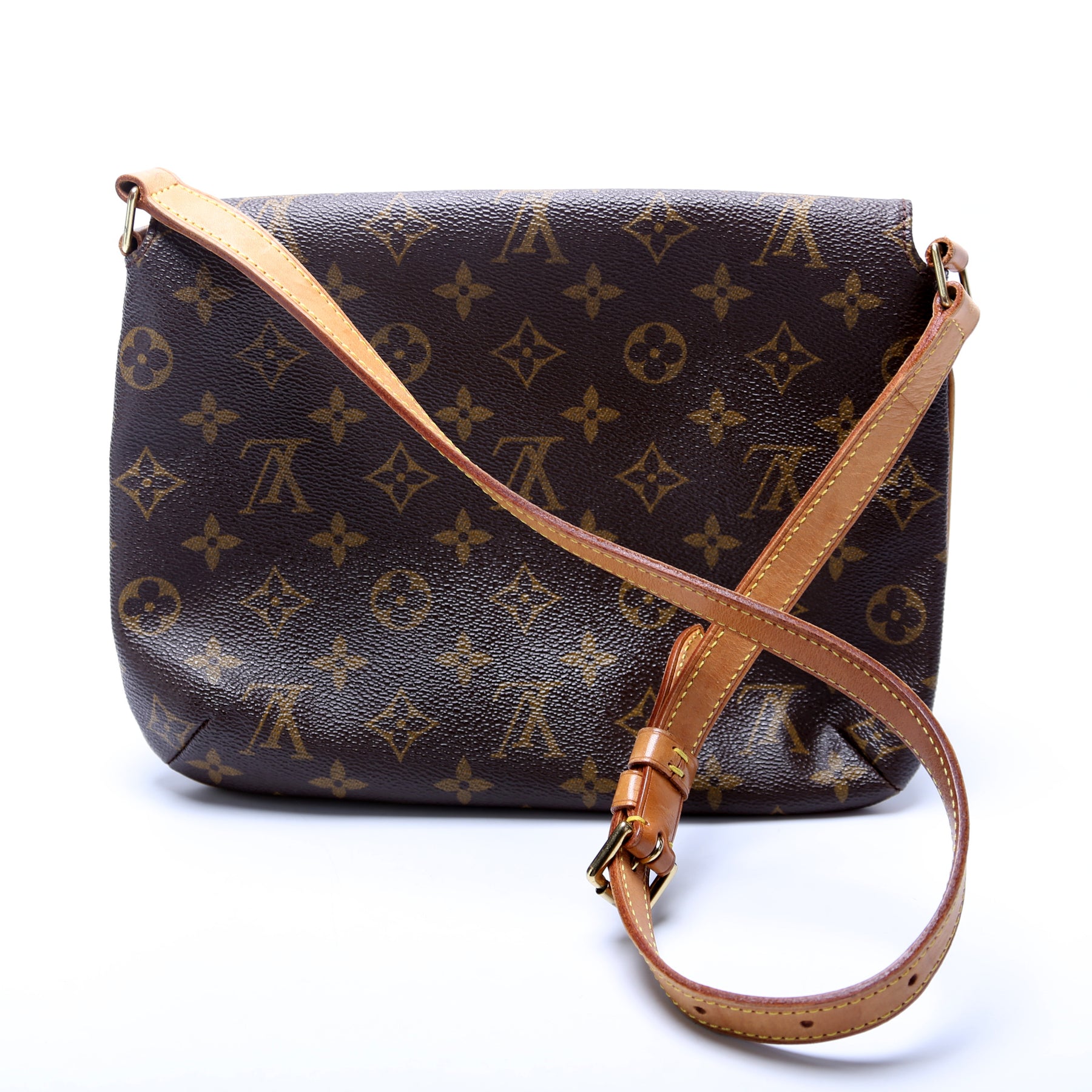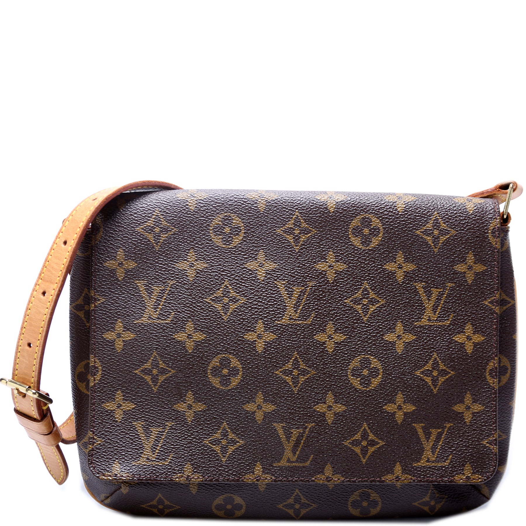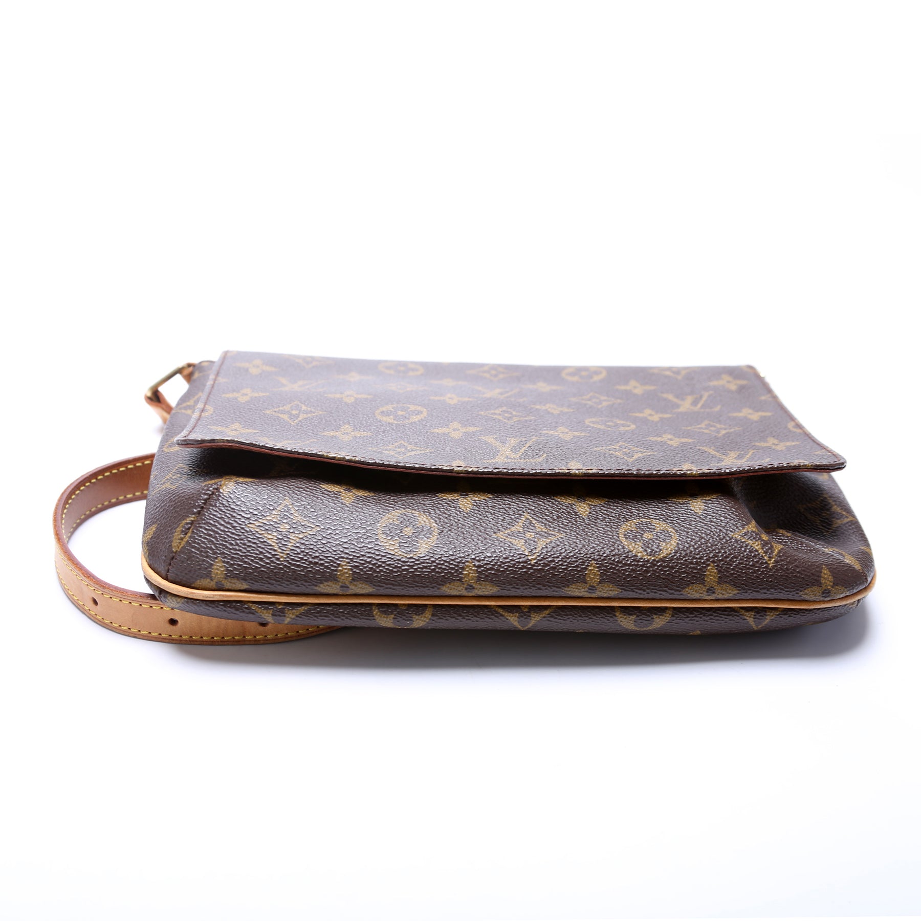 This pre-owned Louis Vuitton Musette Tango Short is guaranteed 100% authentic. The exterior is in the classic Louis Vuitton Monogram coated canvas.