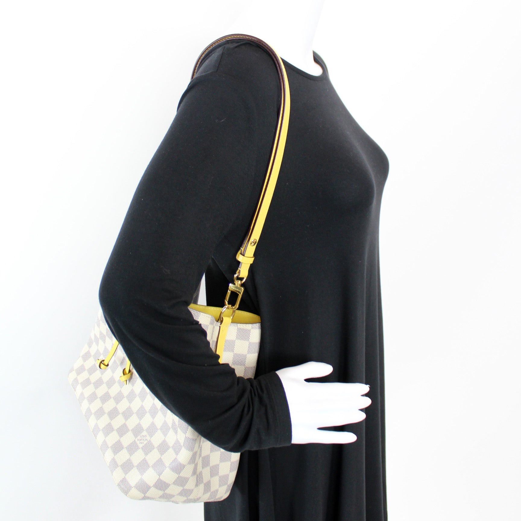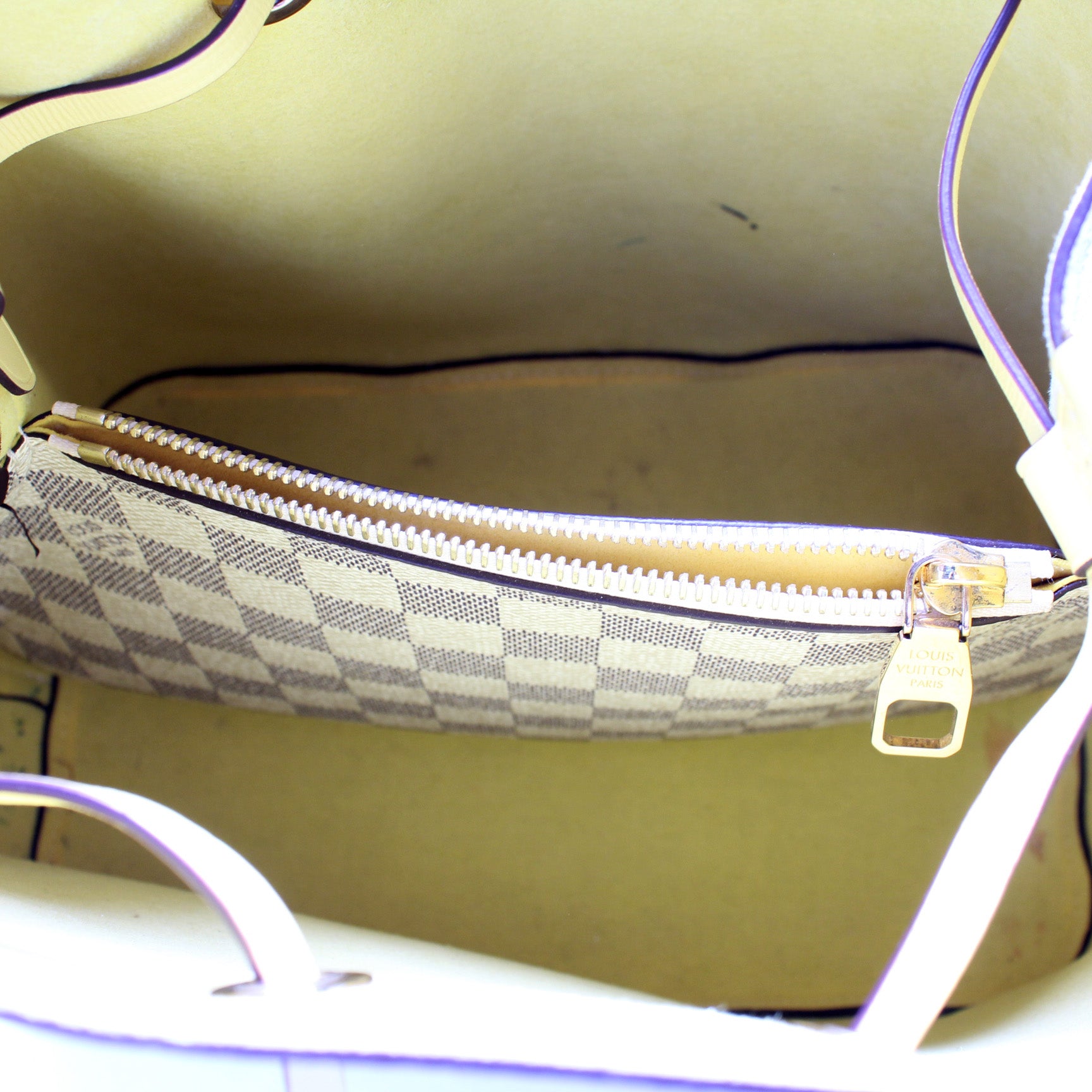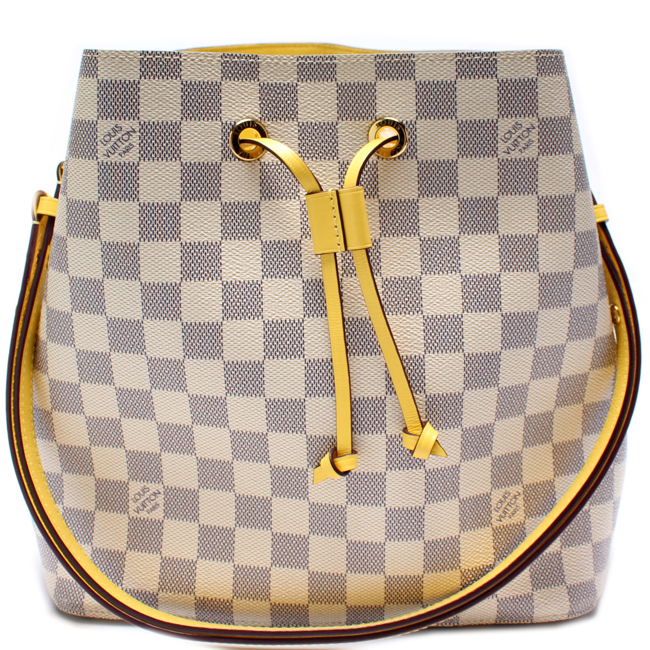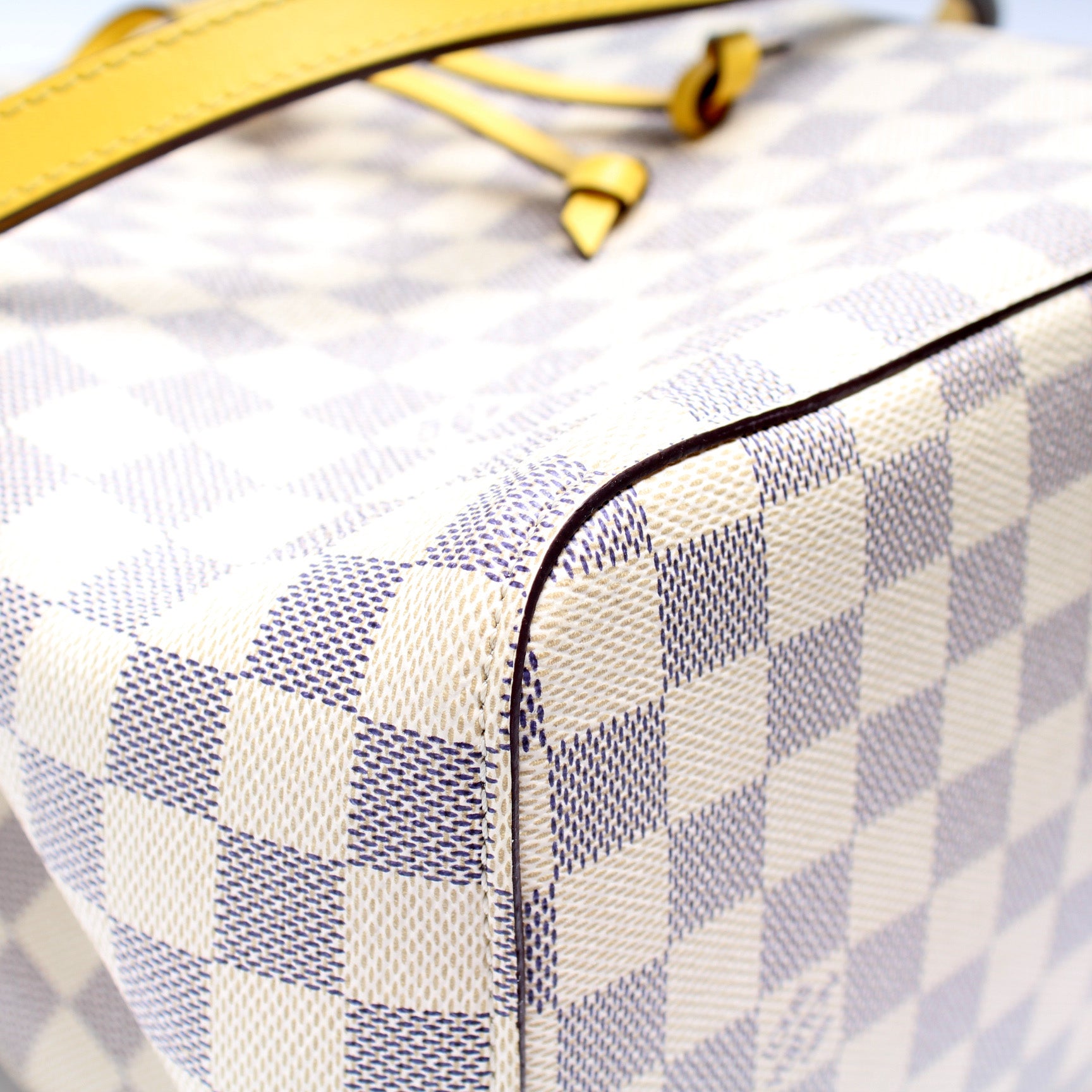 This pre-owned Louis Vuitton Neonoe is guaranteed 100% authentic. The exterior is in the classic Damier Azur coated canvas.