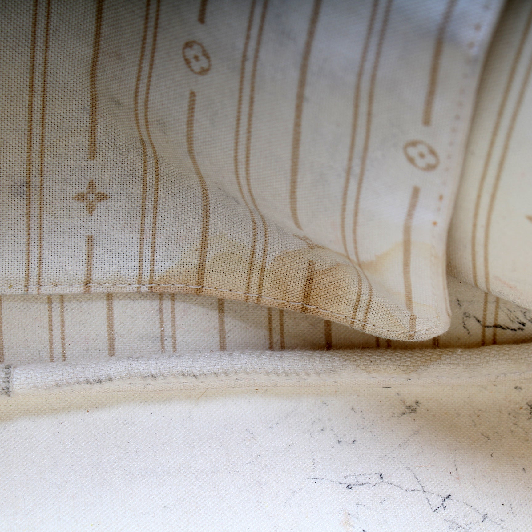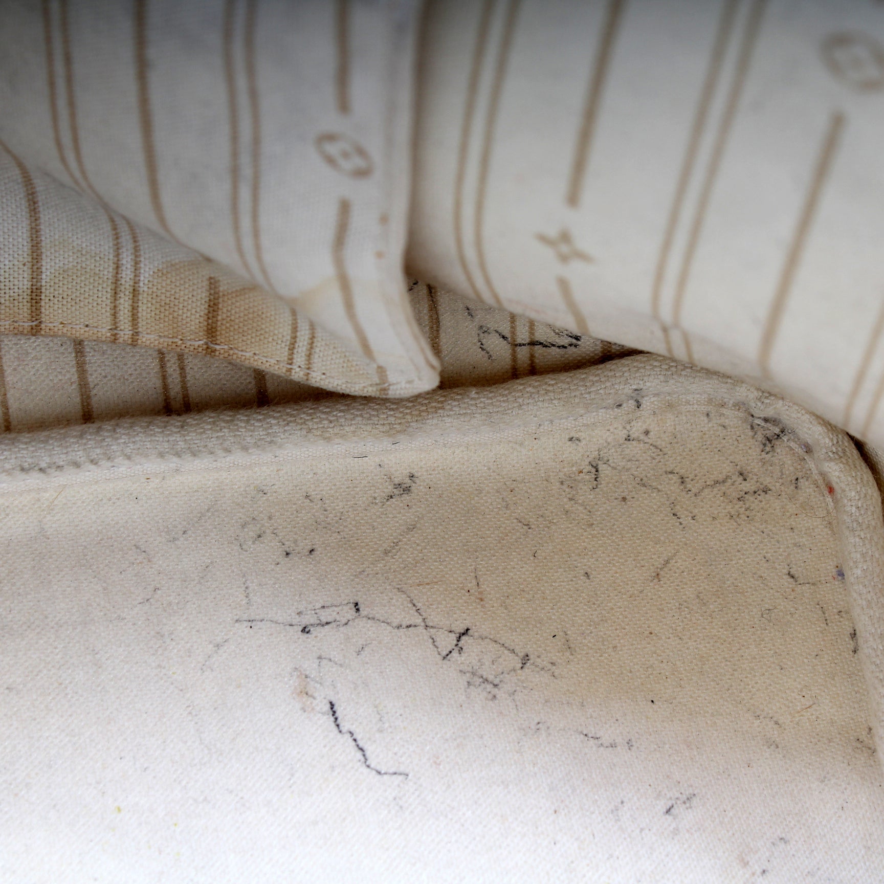 Exterior: The exterior coated canvas is free of any rips or cracks, there are minor discoloration spots throughout. The corners show minor rubbing. The leather trim shows minor discoloration and wear throughout.