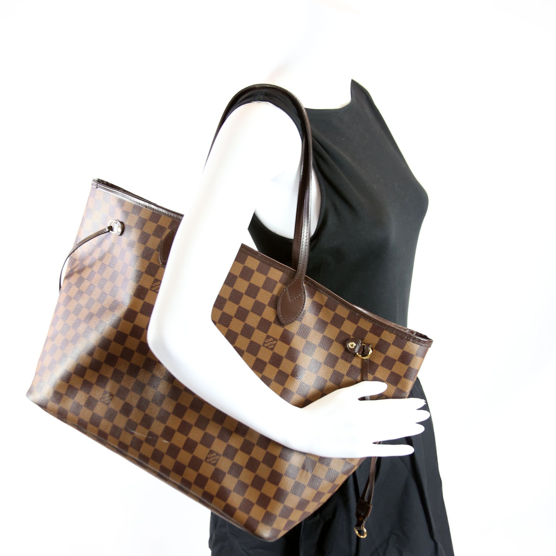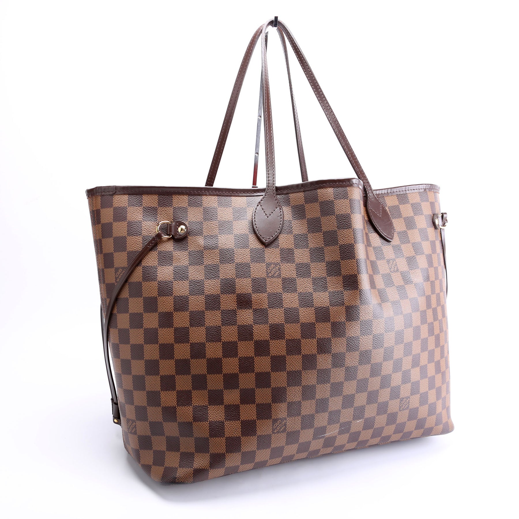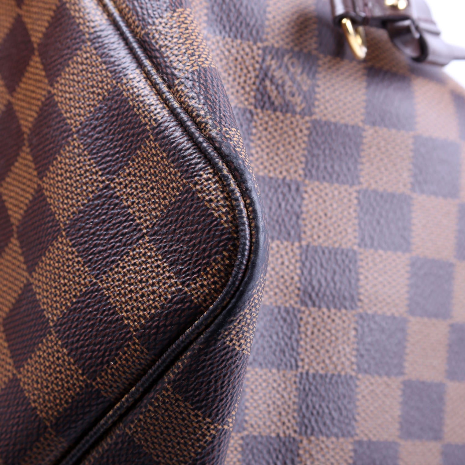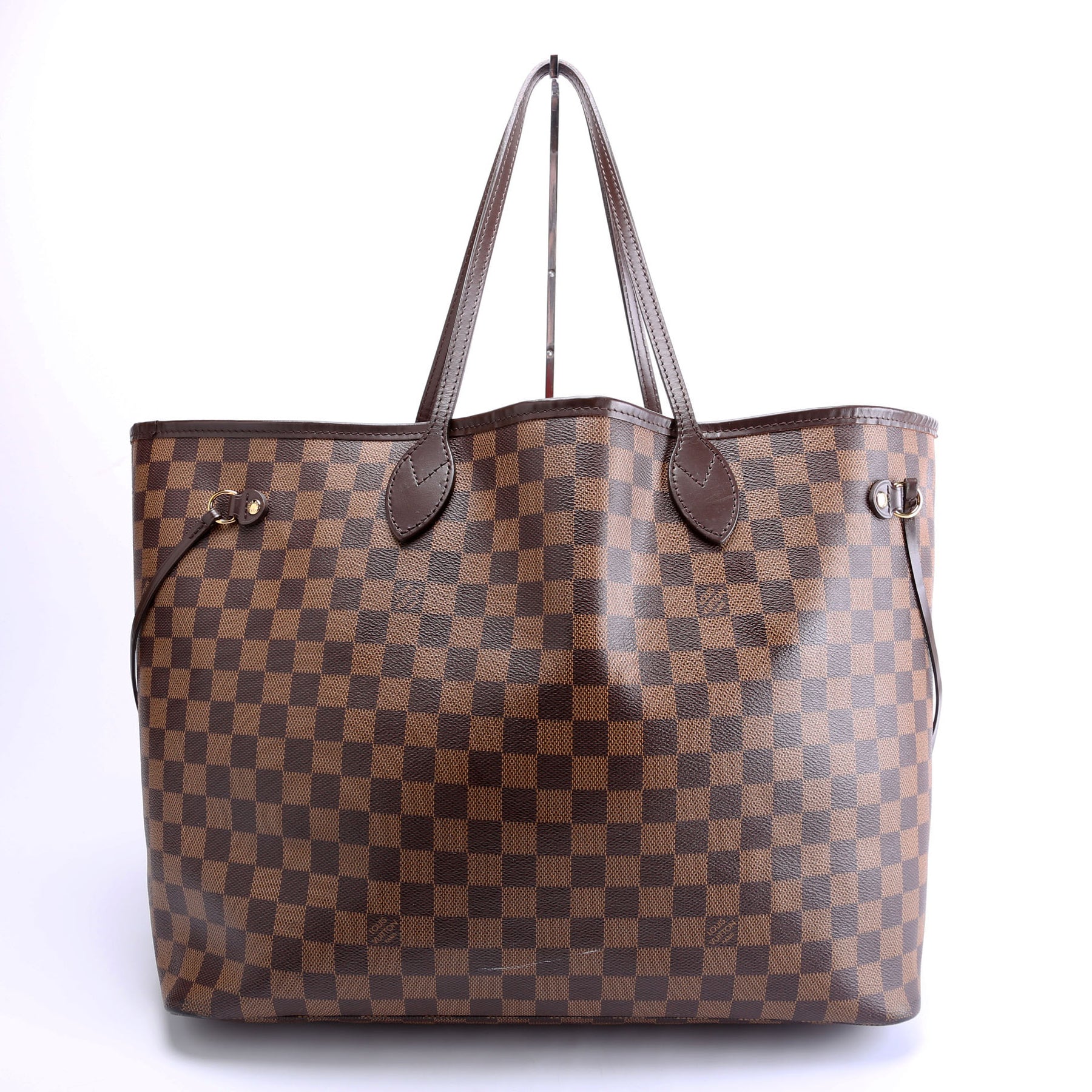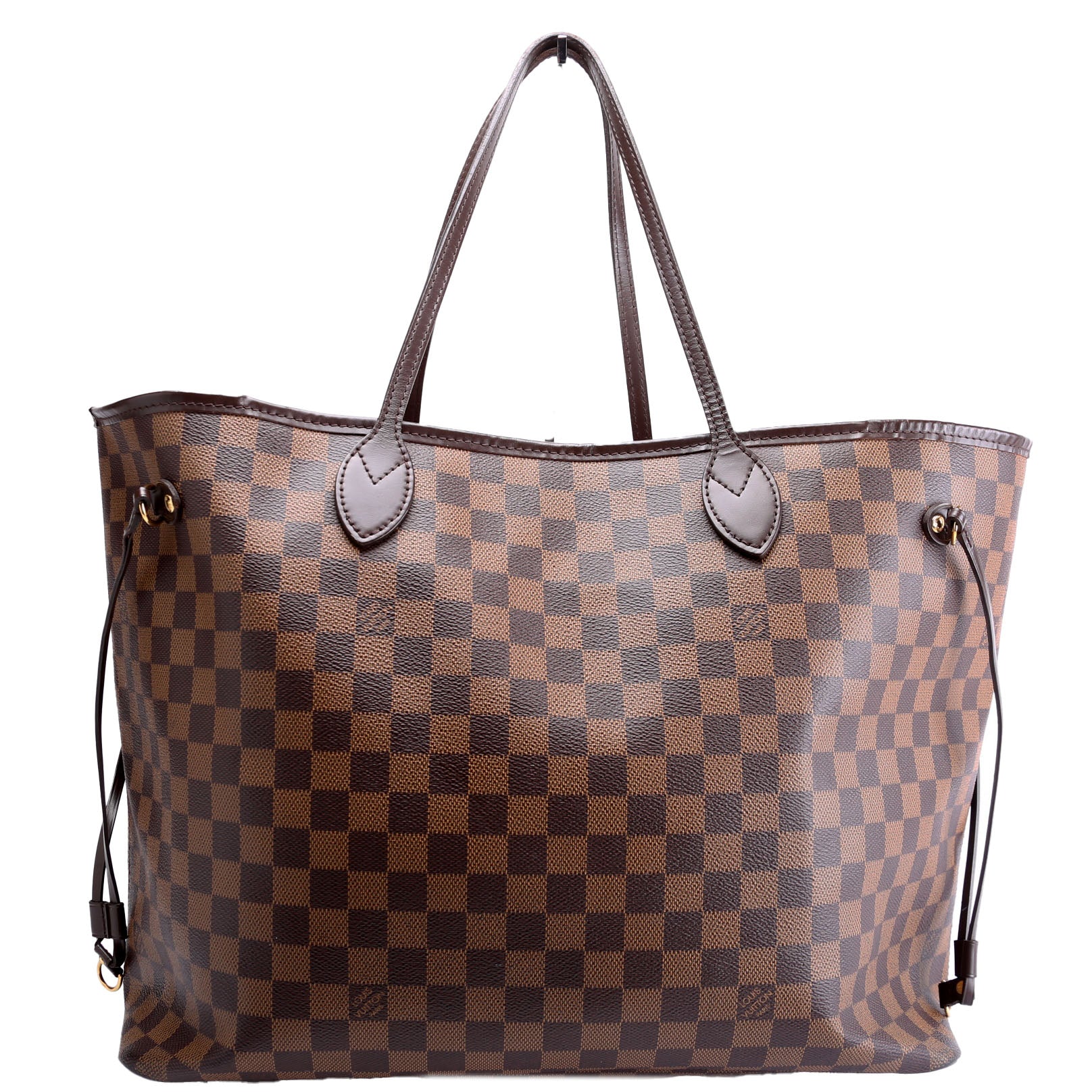 This pre-owned Louis Vuitton Neverfull W/Wallet GM is guaranteed 100% authentic. The exterior is in the classic Louis Vuitton Damier Ebene coated canvas.
