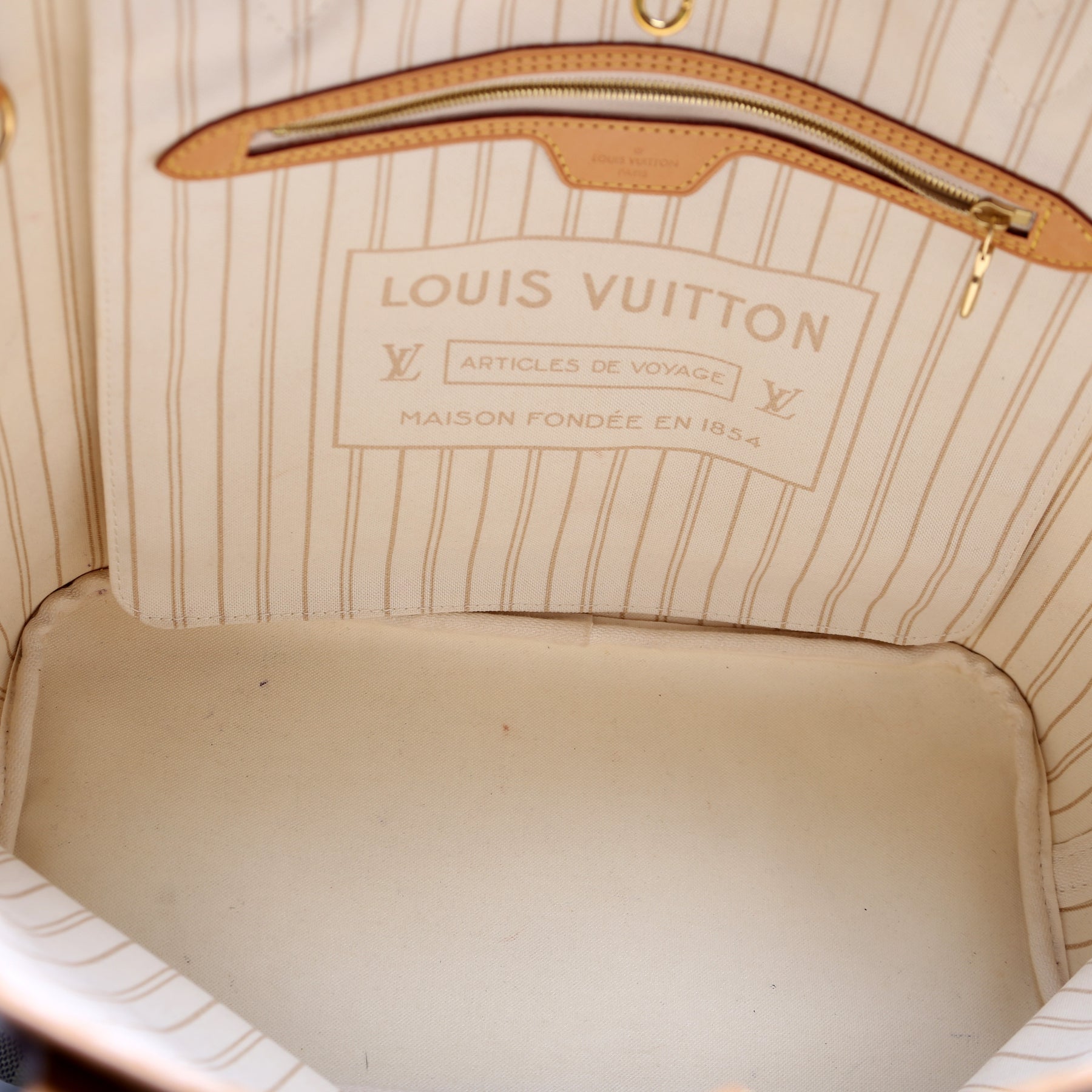 Interior: The interior shows light stains throughout. The interior features one zip closure pocket.