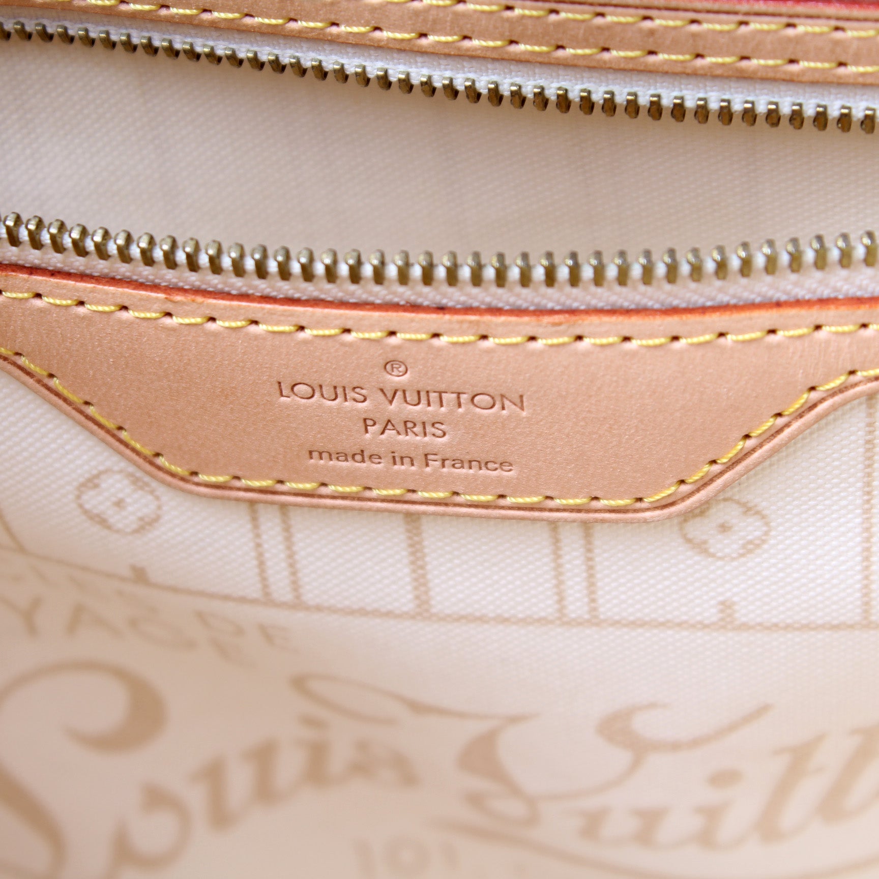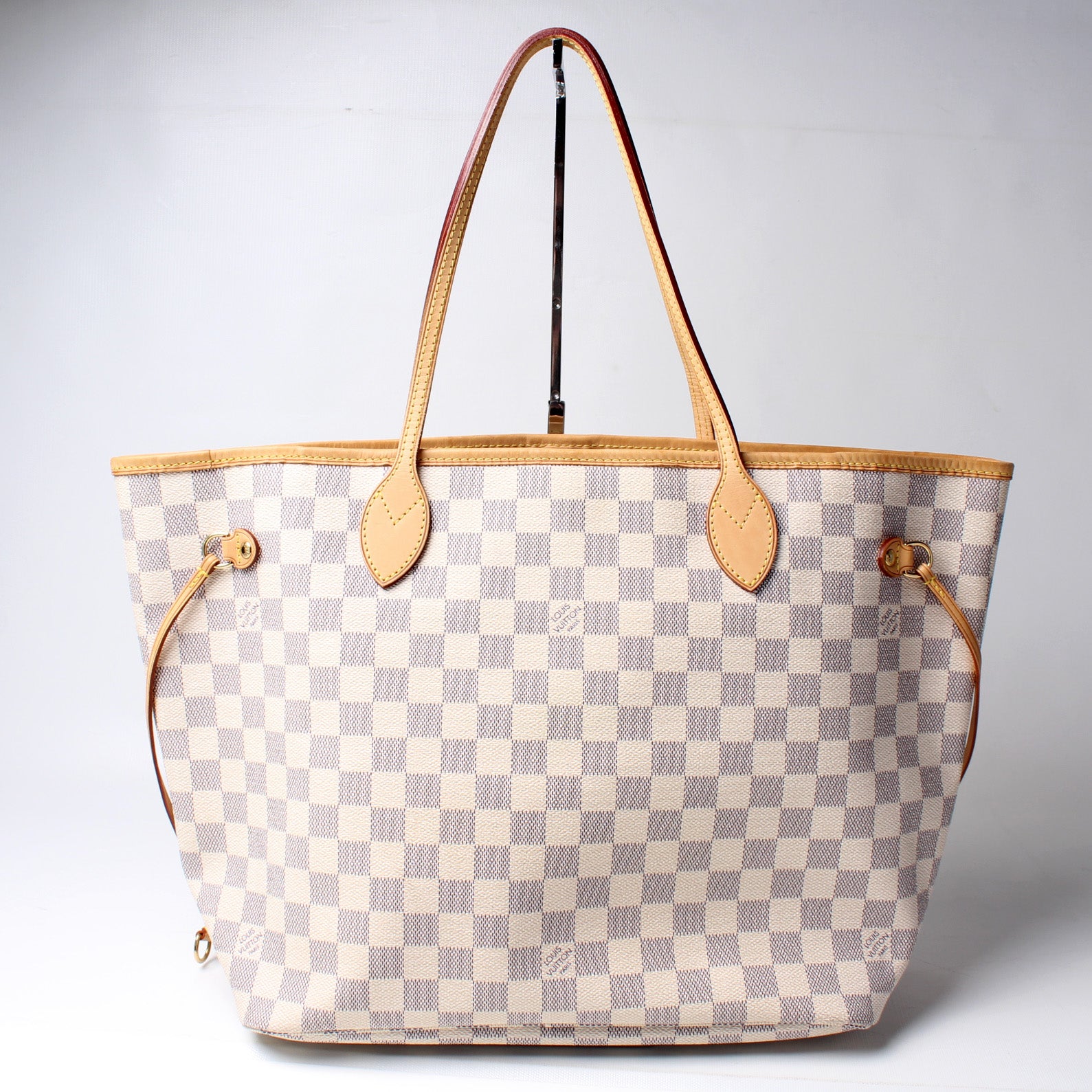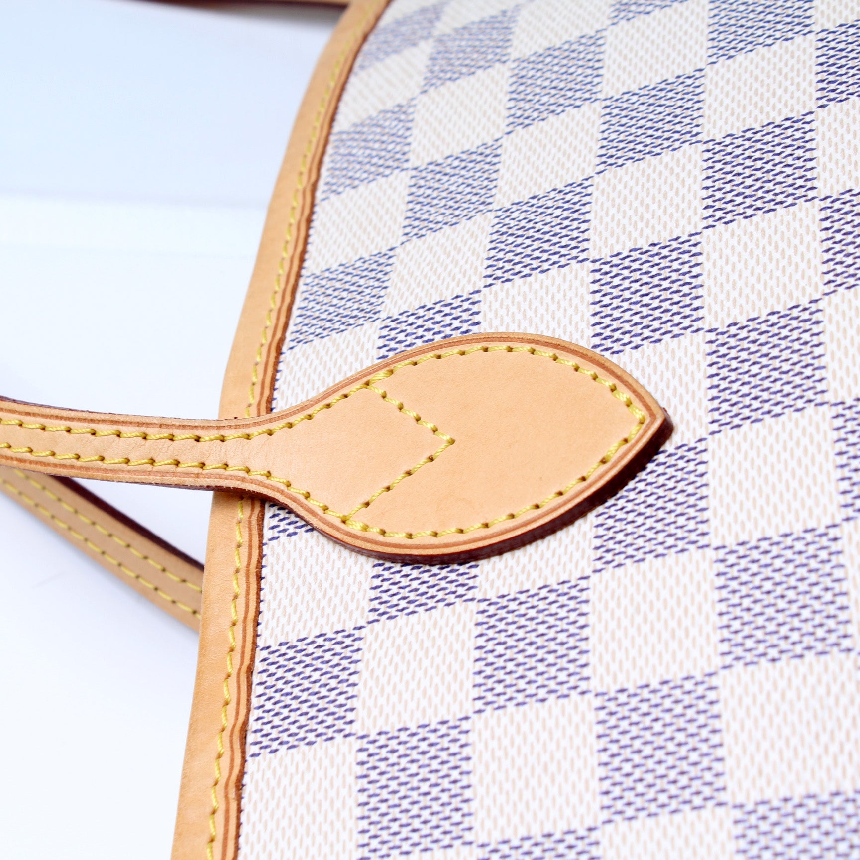 This pre-owned Louis Vuitton Neverfull MM is guaranteed 100% authentic. The exterior is in the classic Louis Vuitton Damier Azur coated canvas.