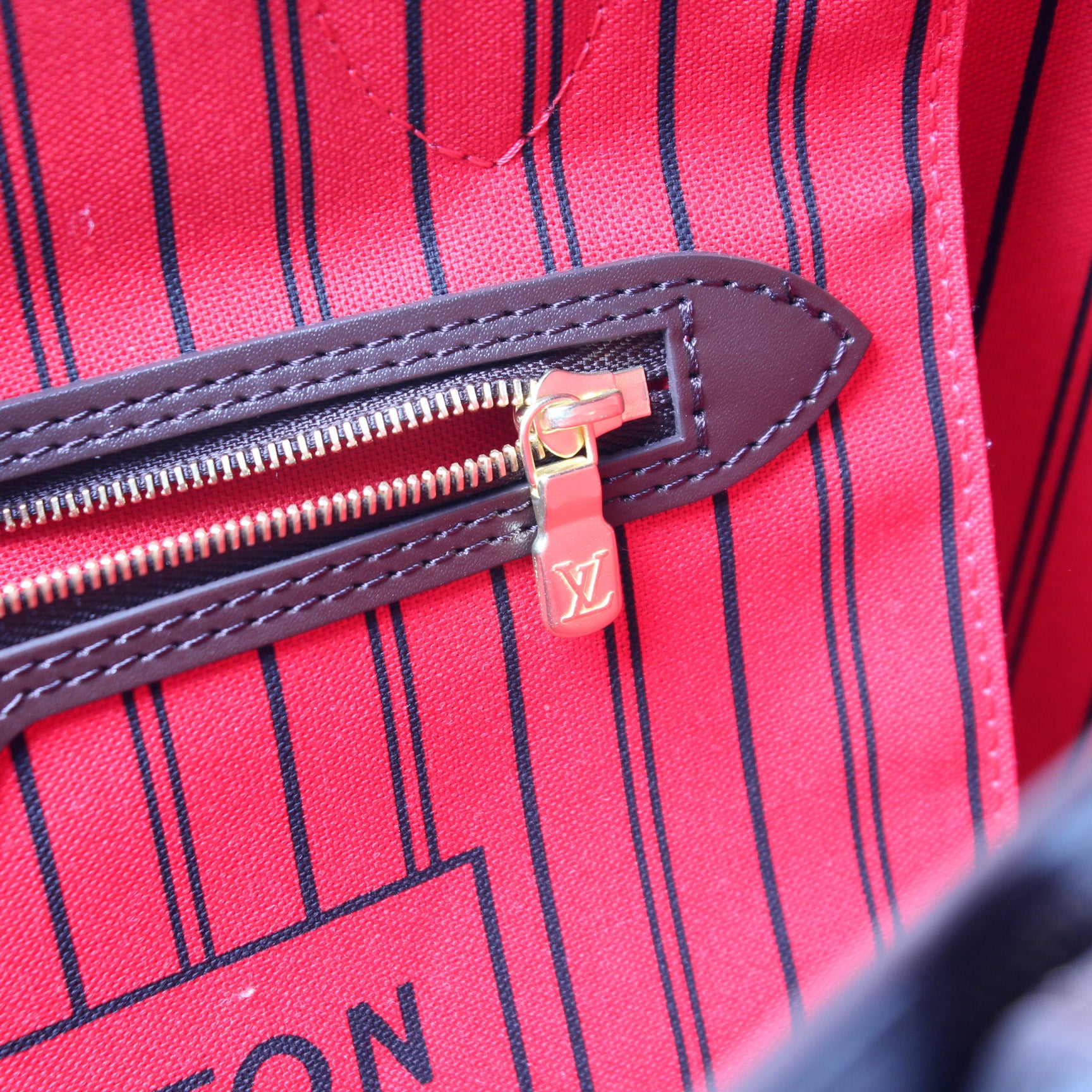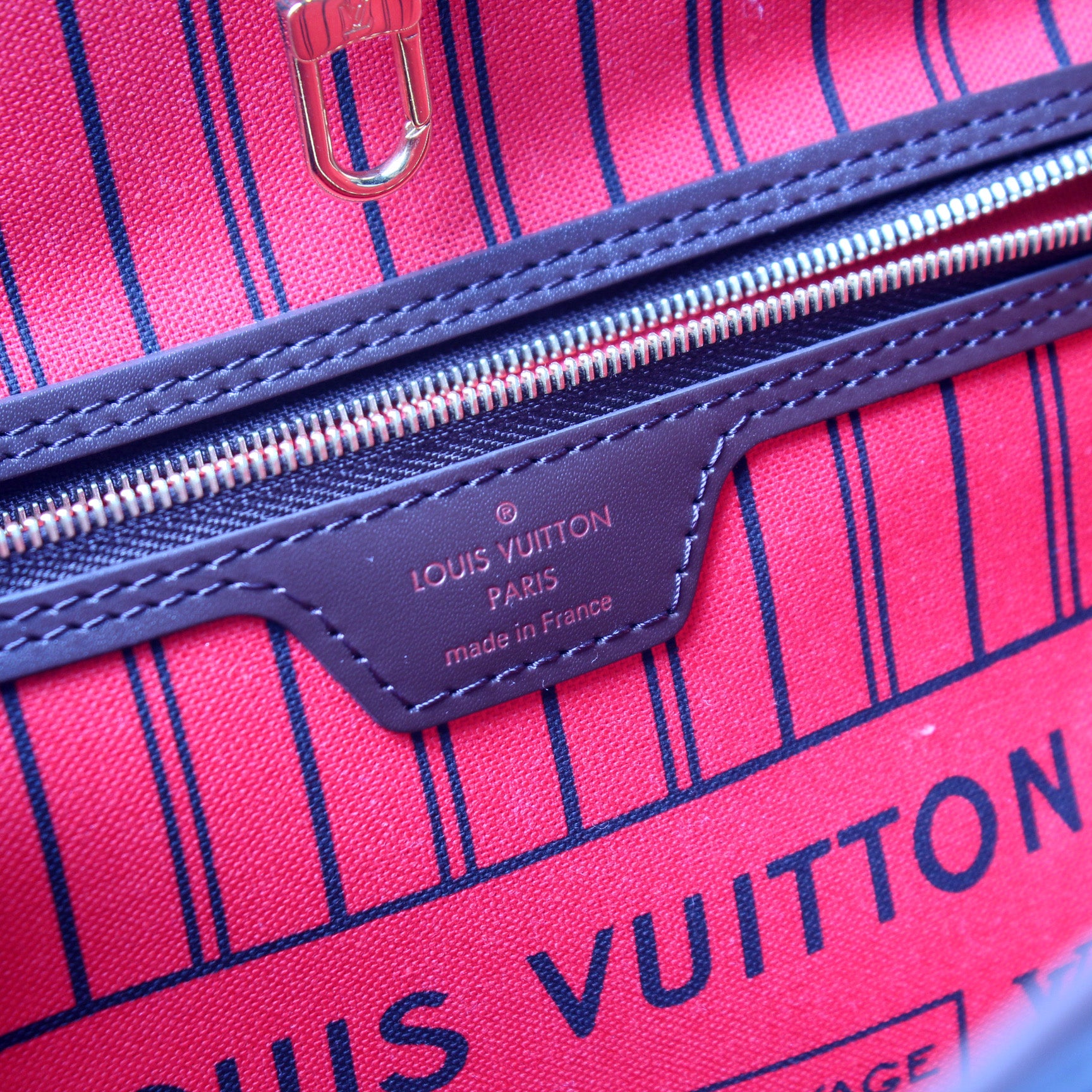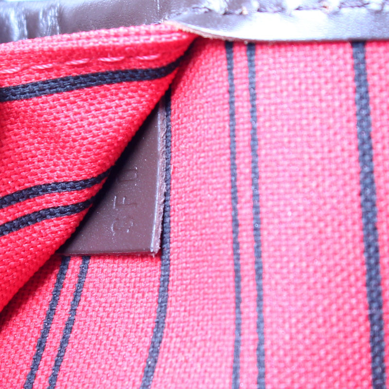 This pre-owned Louis Vuitton Neverfull MM is guaranteed 100% authentic. The exterior is in the classic Louis Vuitton Damier Ebene coated canvas.