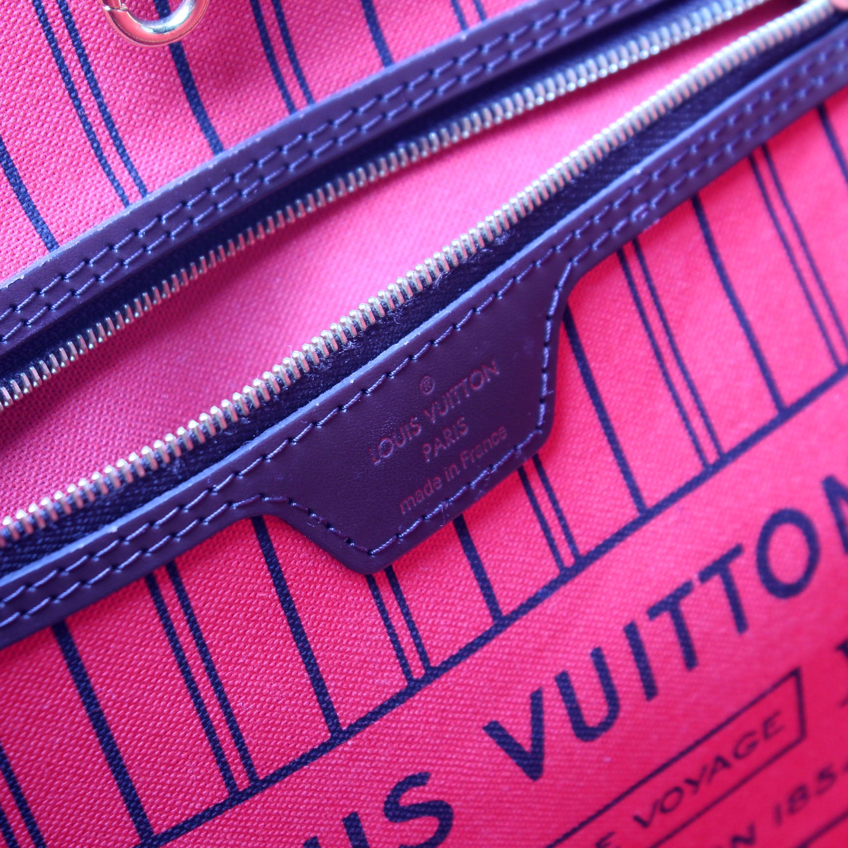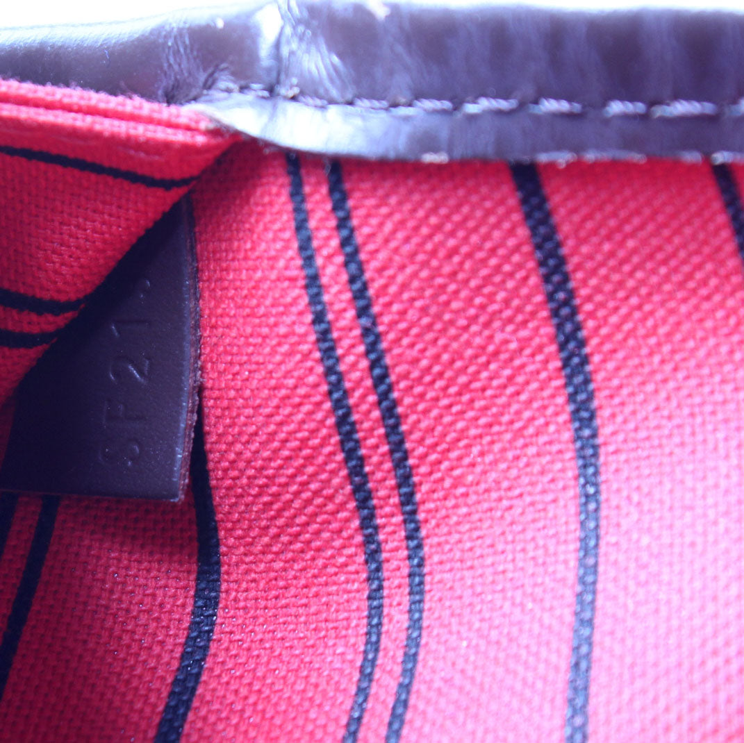 This pre-owned Louis Vuitton Neverfull MM is guaranteed 100% authentic. The exterior is in the classic Louis Vuitton Damier Ebene coated canvas.
