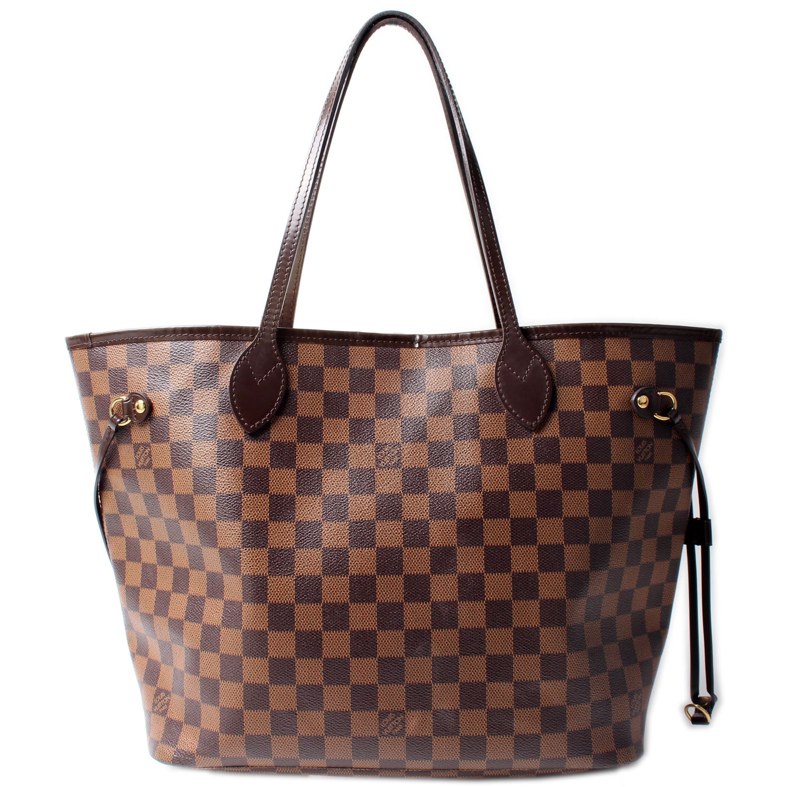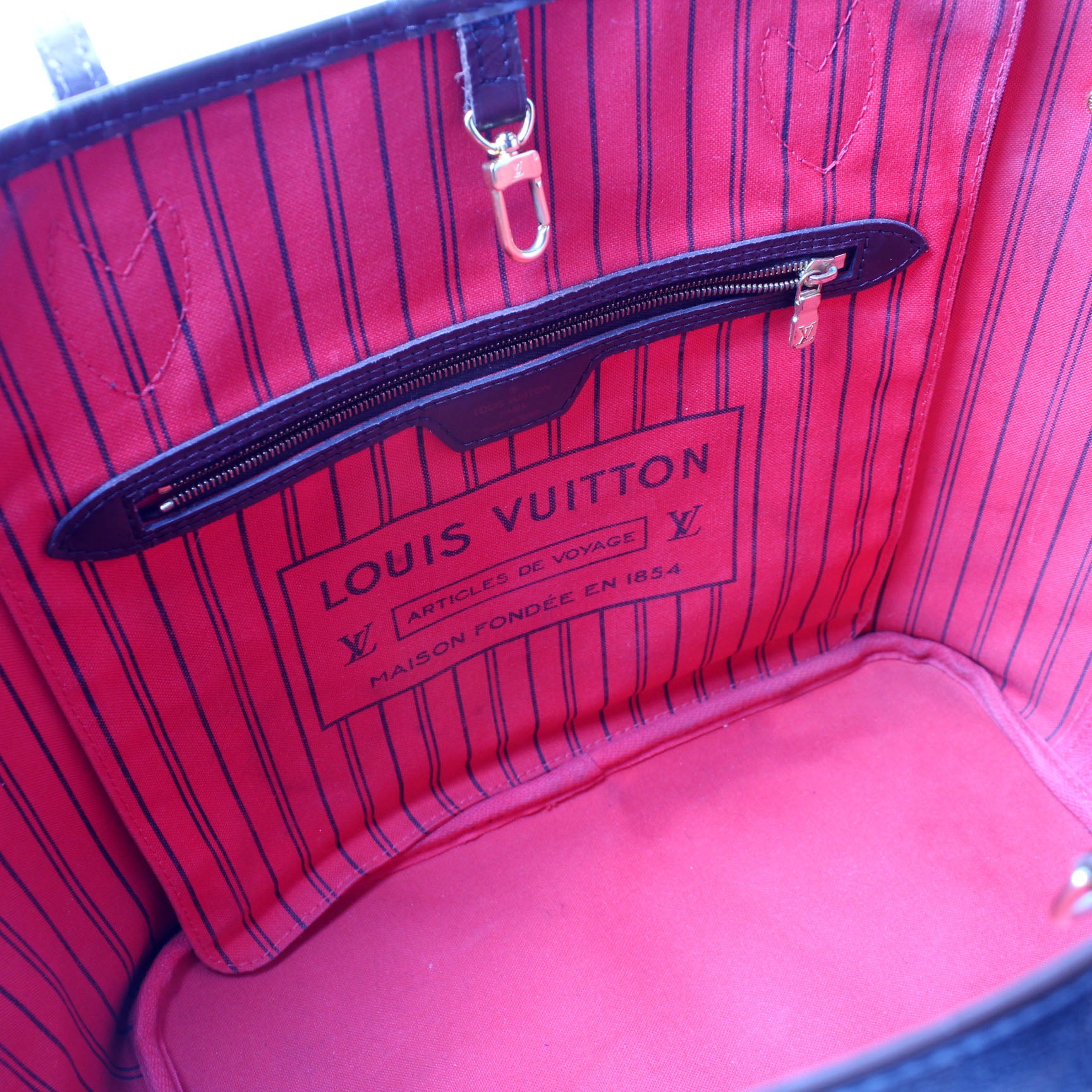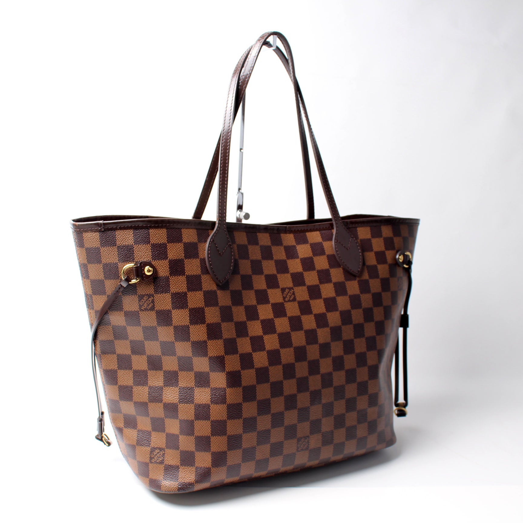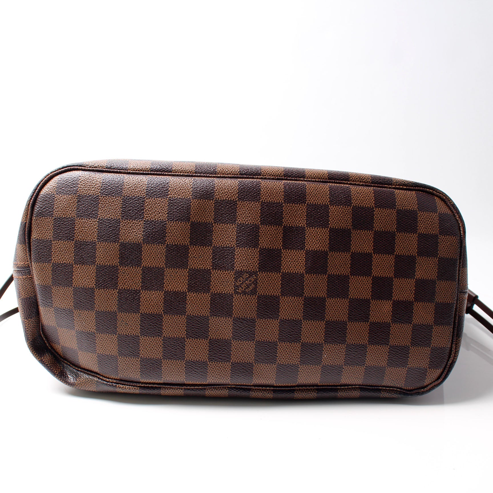 This pre-owned Louis Vuitton Neverfull MM is guaranteed 100% authentic. The exterior is in the classic Louis Vuitton Damier Ebene coated canvas.