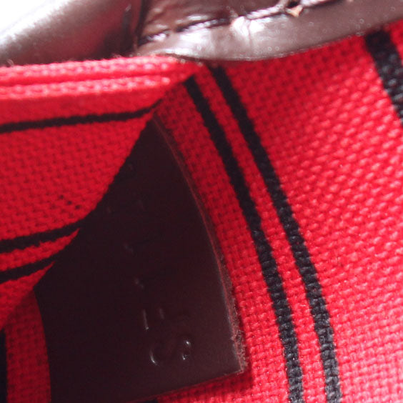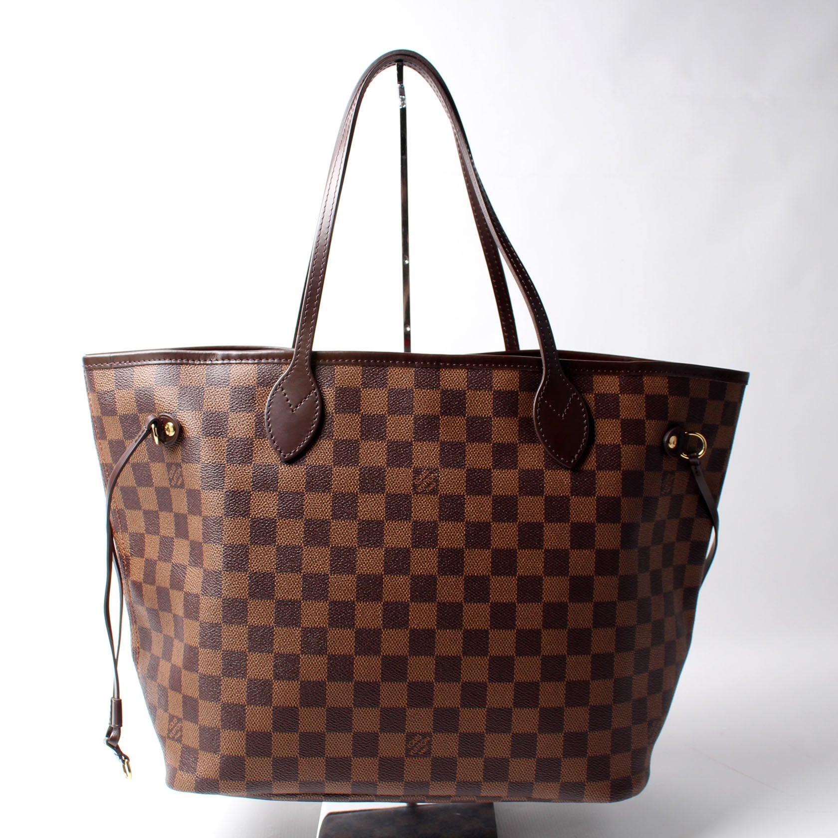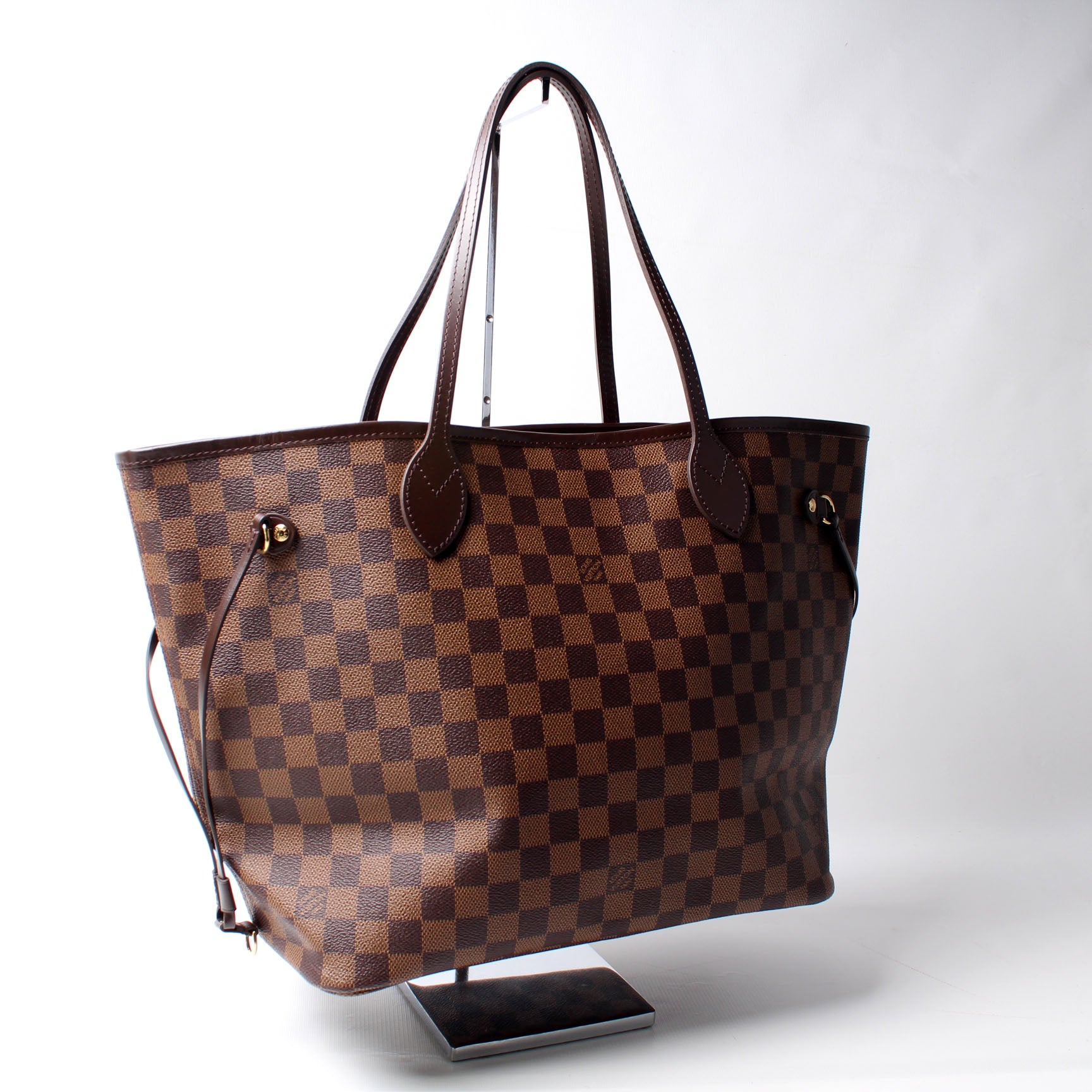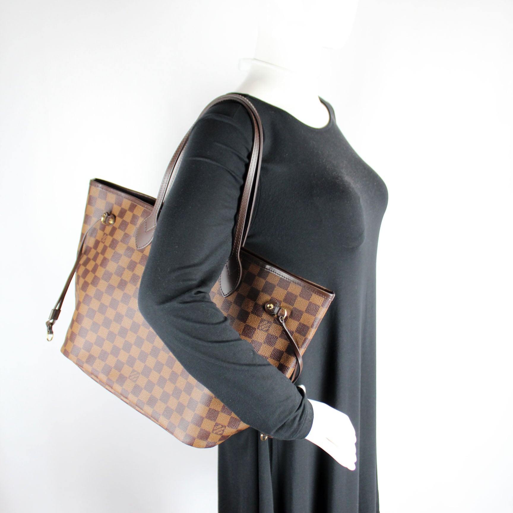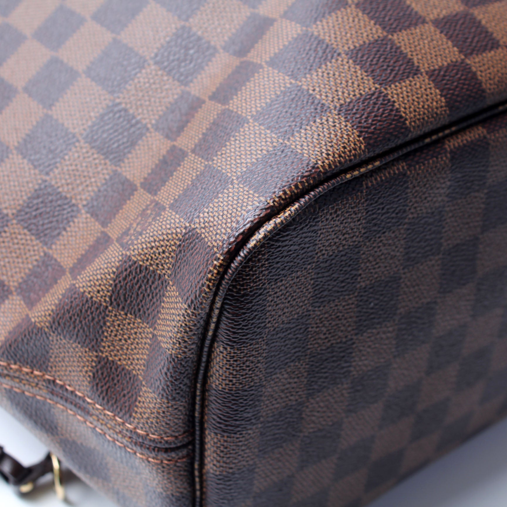 This pre-owned Louis Vuitton Neverfull MM is guaranteed 100% authentic. The exterior is in the classic Louis Vuitton Damier Ebene coated canvas.