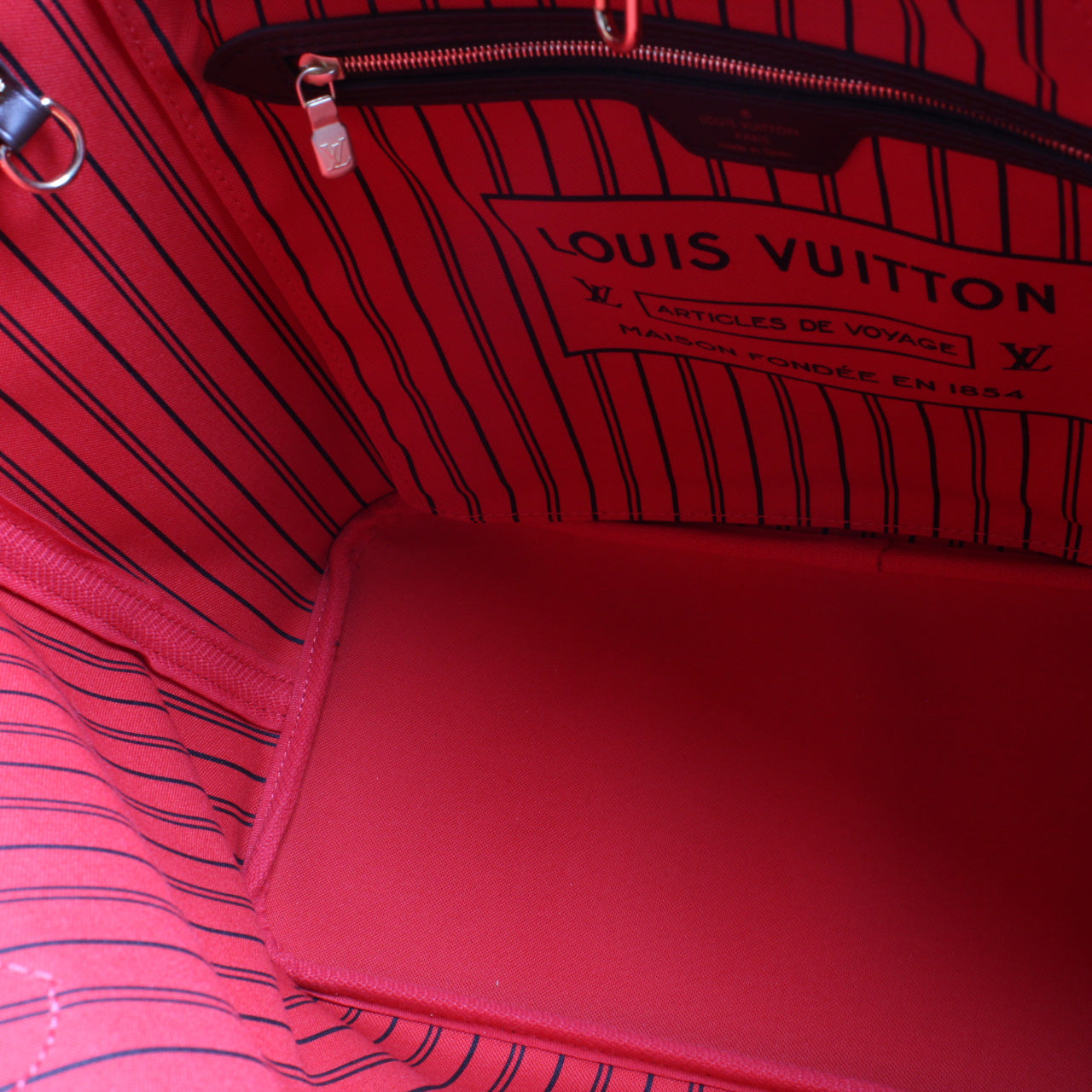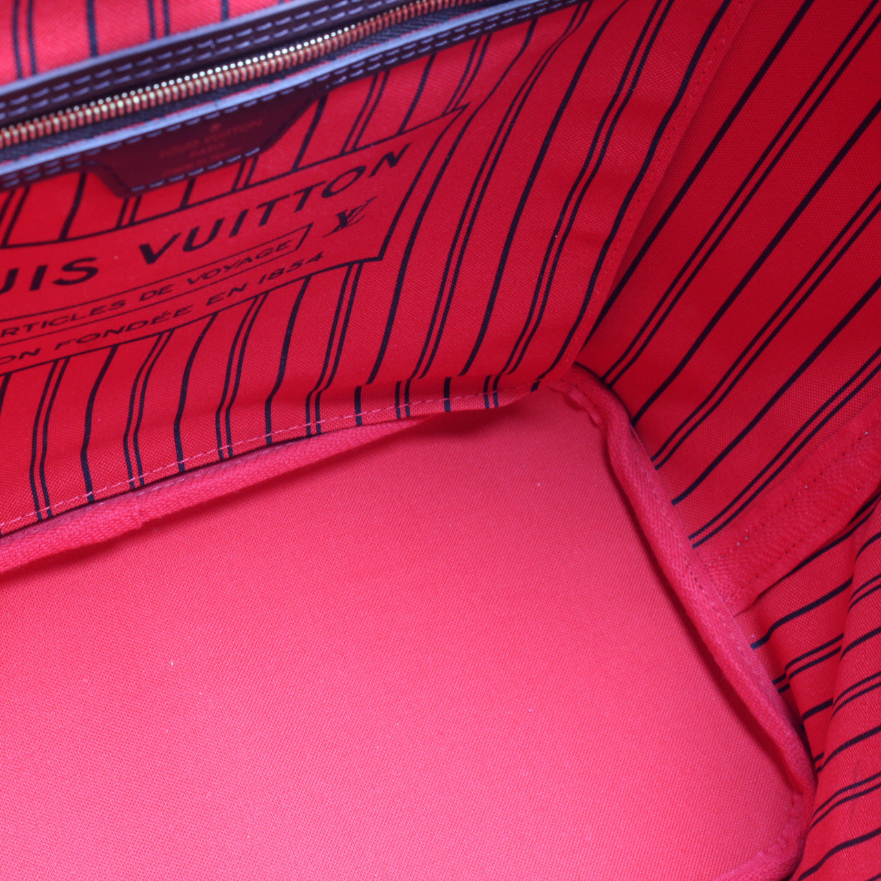 This pre-owned Louis Vuitton Neverfull MM is guaranteed 100% authentic. The exterior is in the classic Louis Vuitton Damier Ebene coated canvas.