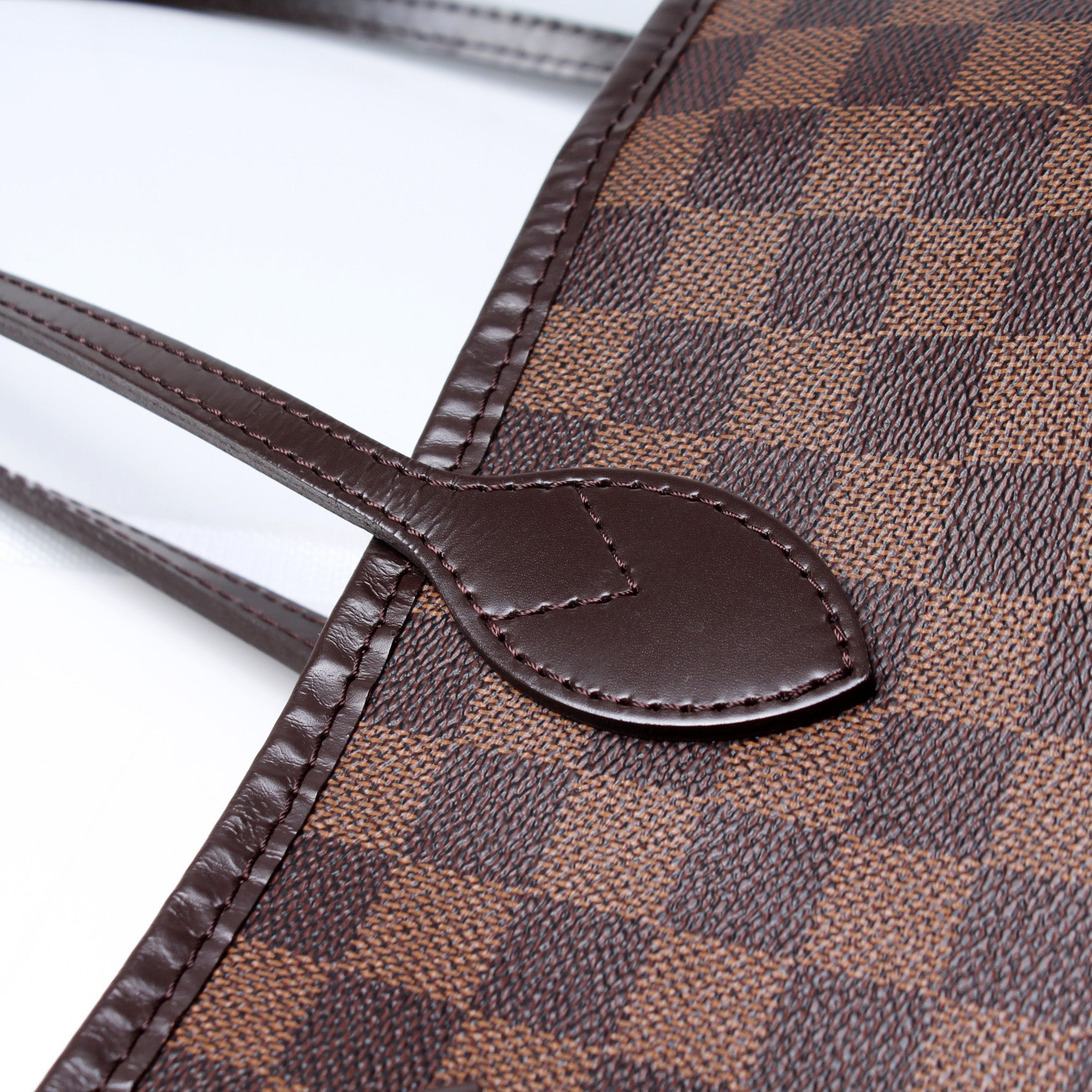 This pre-owned Louis Vuitton Neverfull MM is guaranteed 100% authentic. The exterior is in the classic Louis Vuitton Damier Ebene coated canvas.