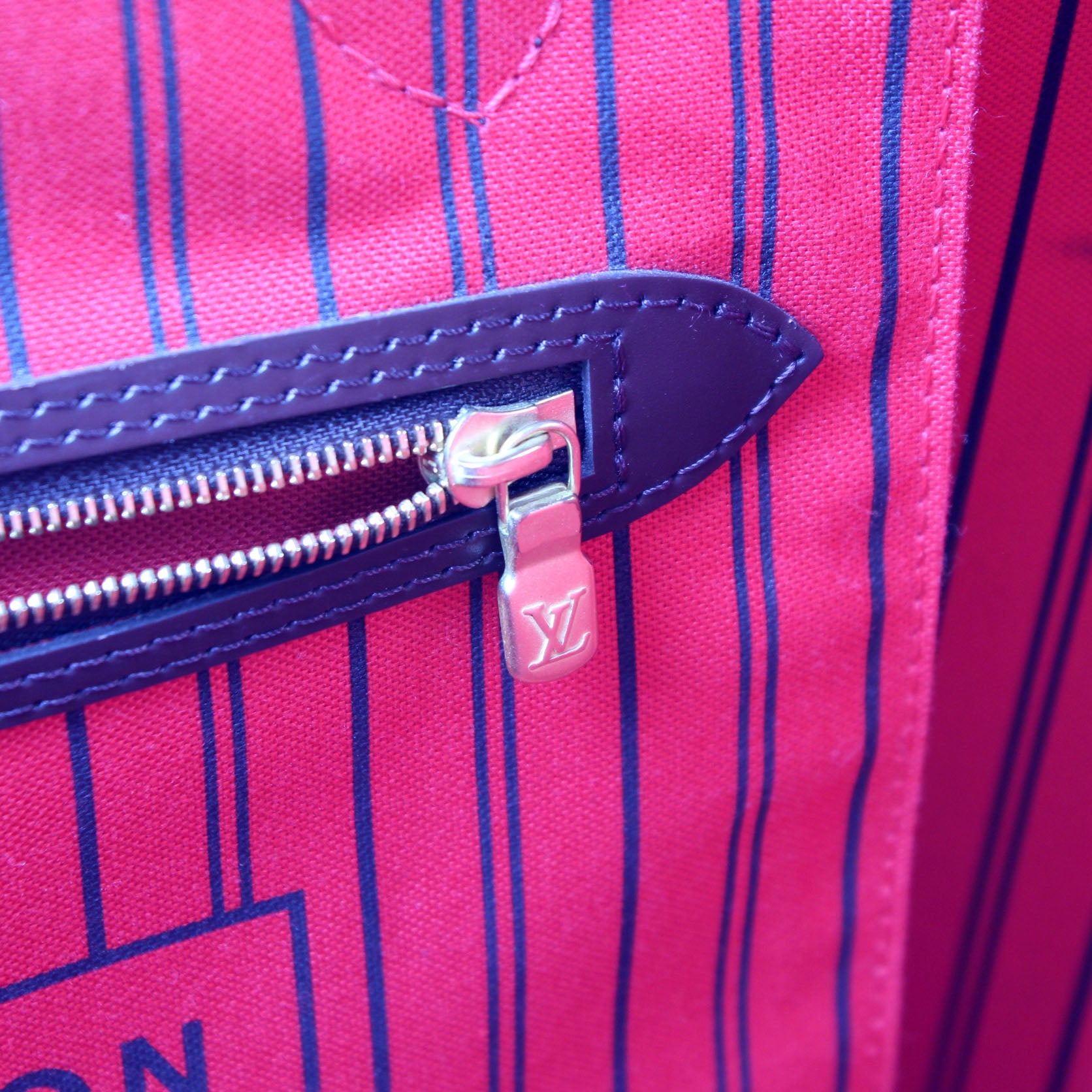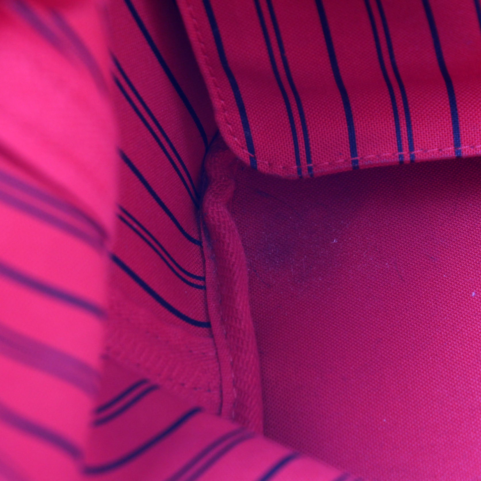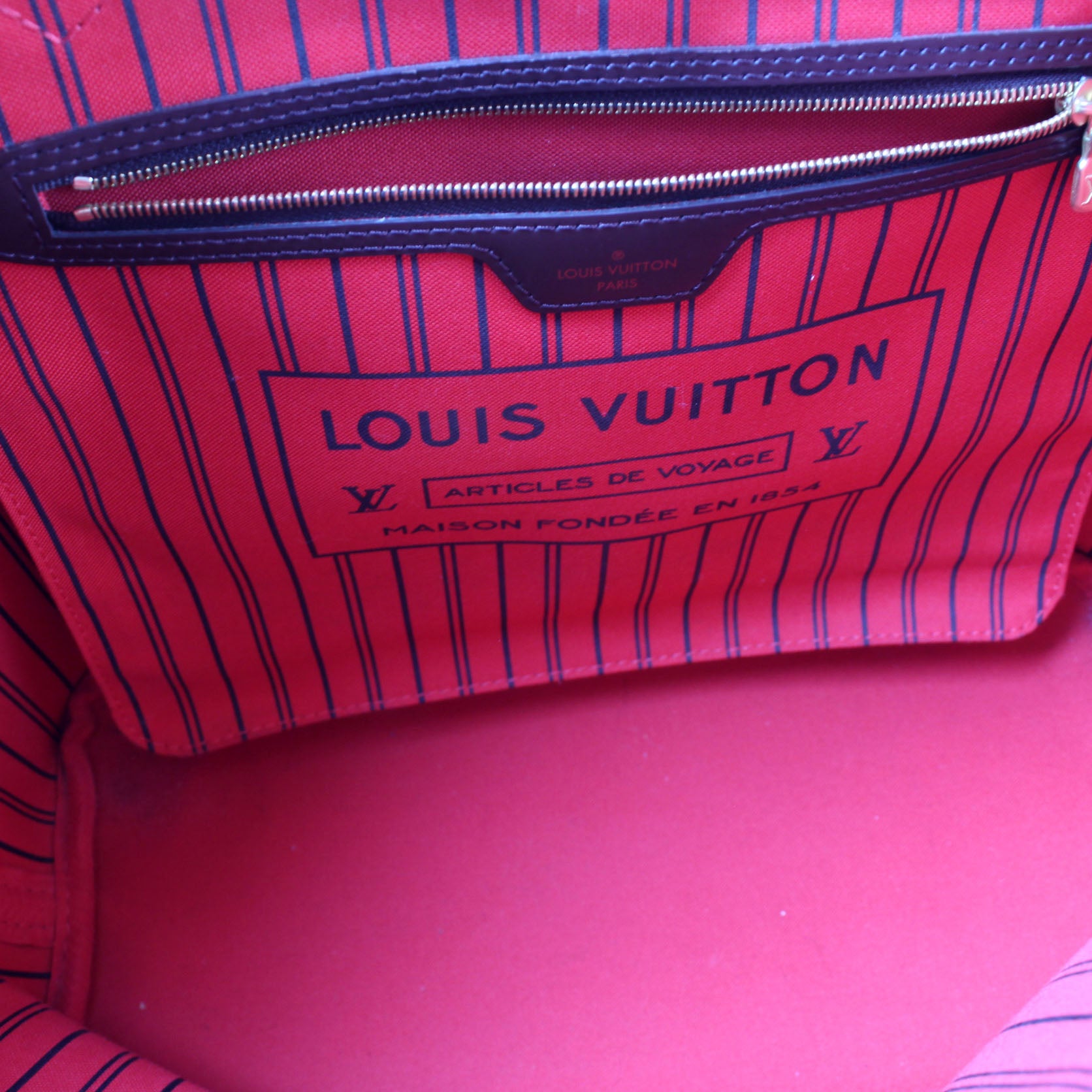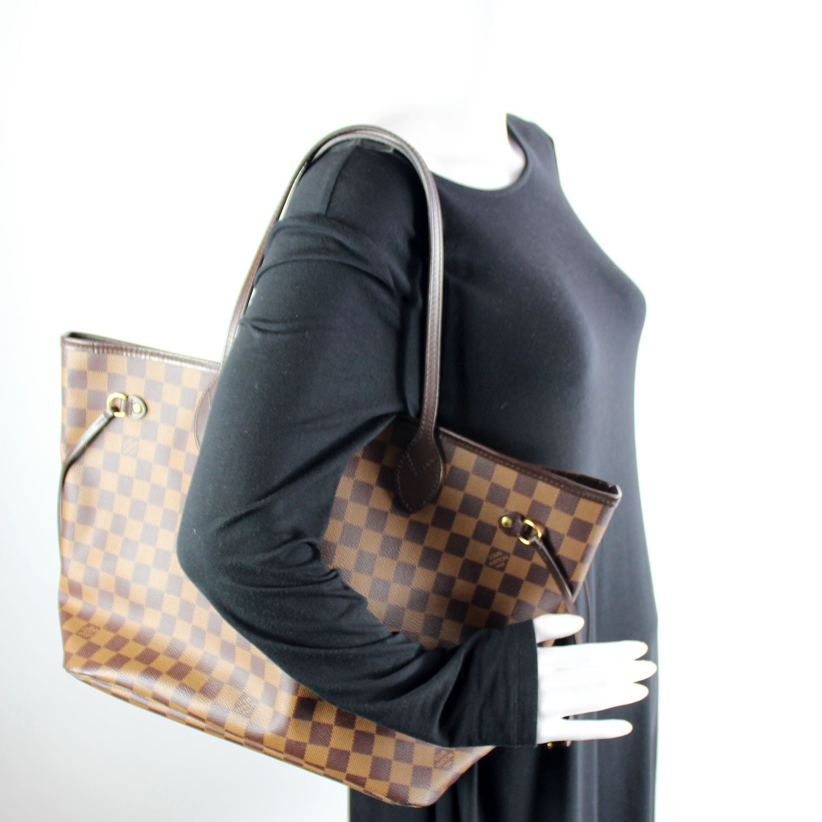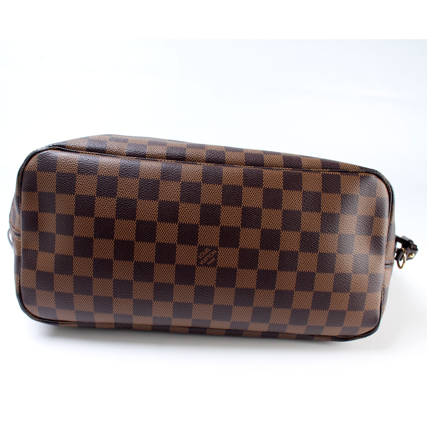 This pre-owned Louis Vuitton Neverfull MM is guaranteed 100% authentic. The exterior is in the classic Louis Vuitton Damier Ebene coated canvas.