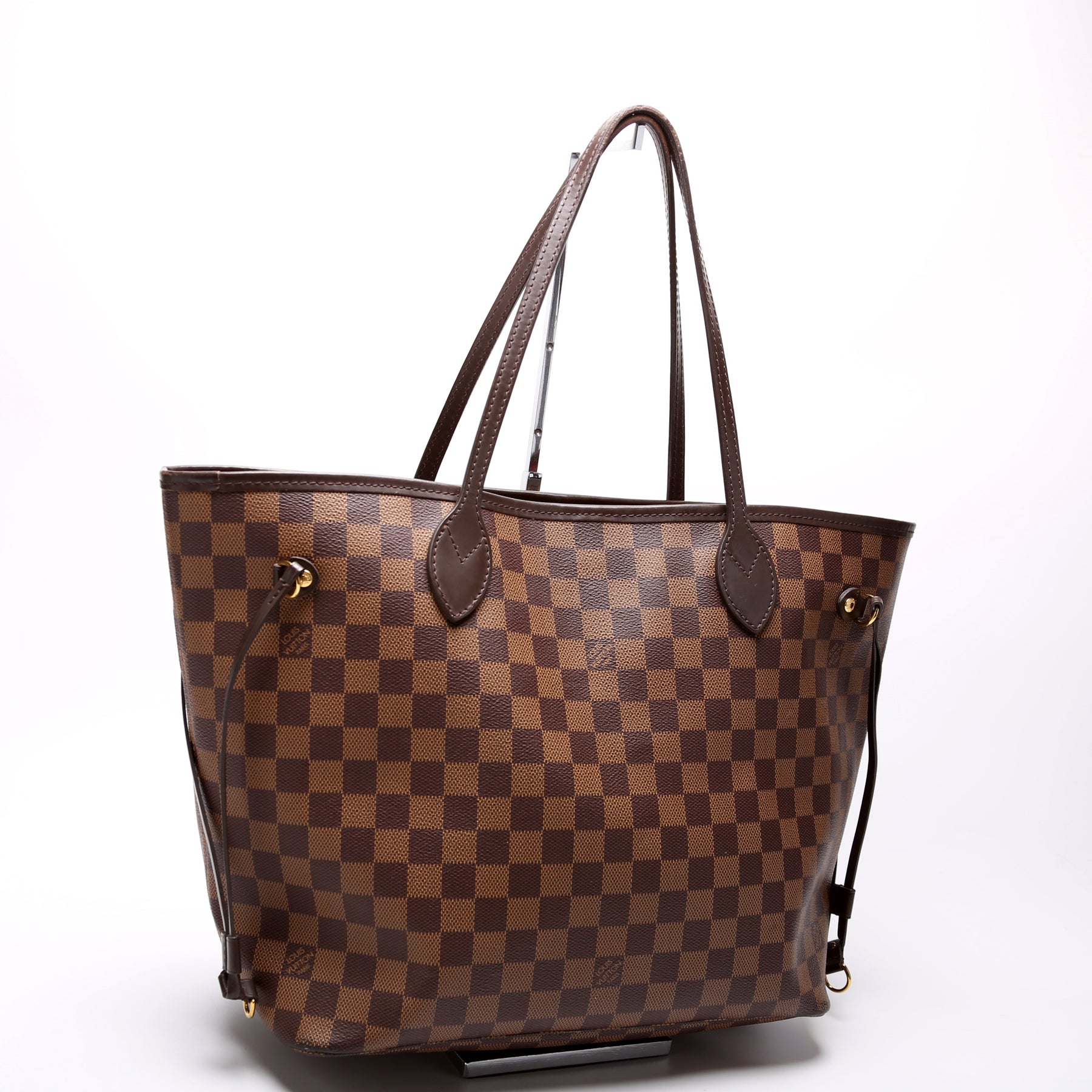 This pre-owned Louis Vuitton Neverfull MM is guaranteed 100% authentic. The exterior is in the classic Louis Vuitton Damier Ebene coated canvas.