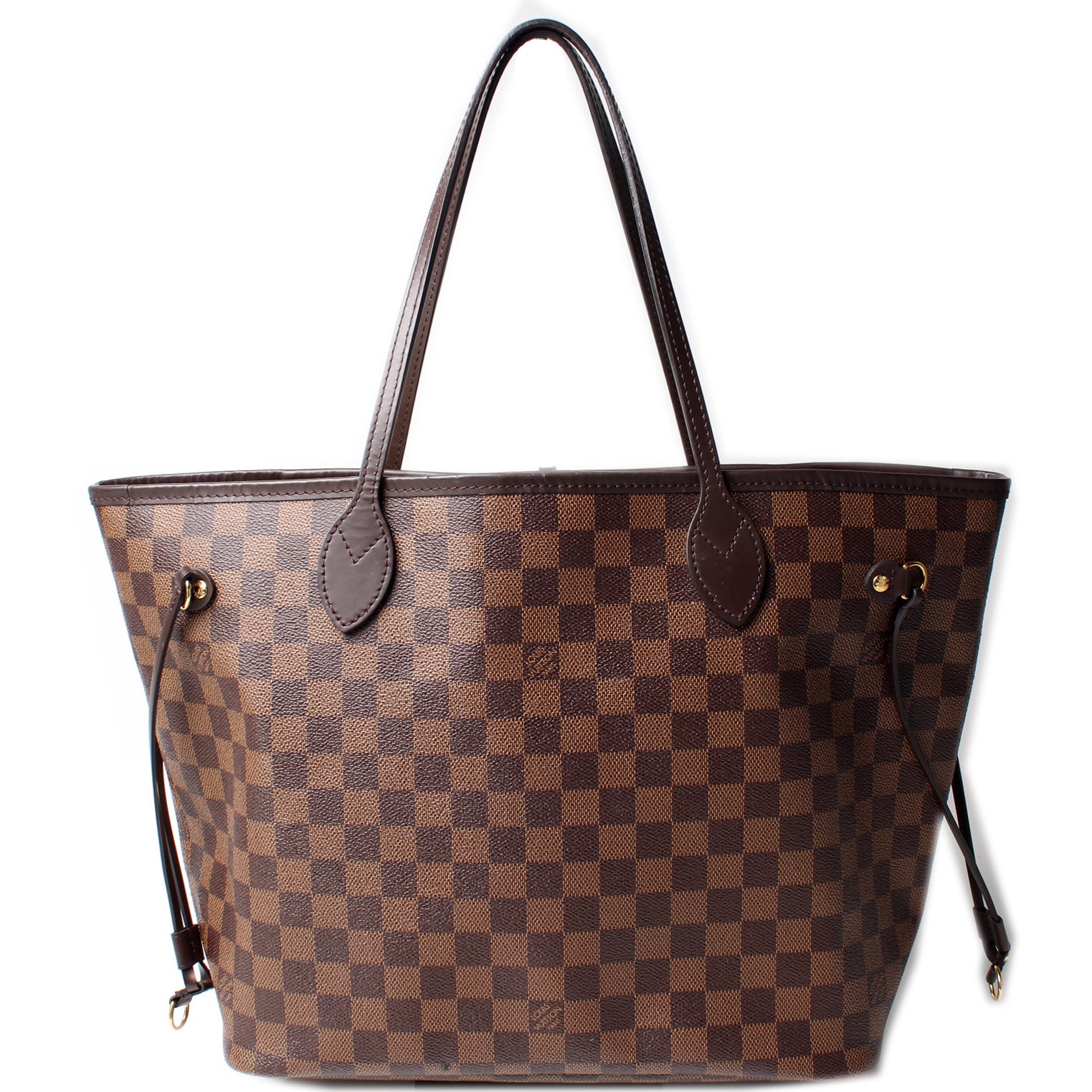 This pre-owned Louis Vuitton Neverfull MM is guaranteed 100% authentic. The exterior is in the classic Louis Vuitton Damier Ebene coated canvas.