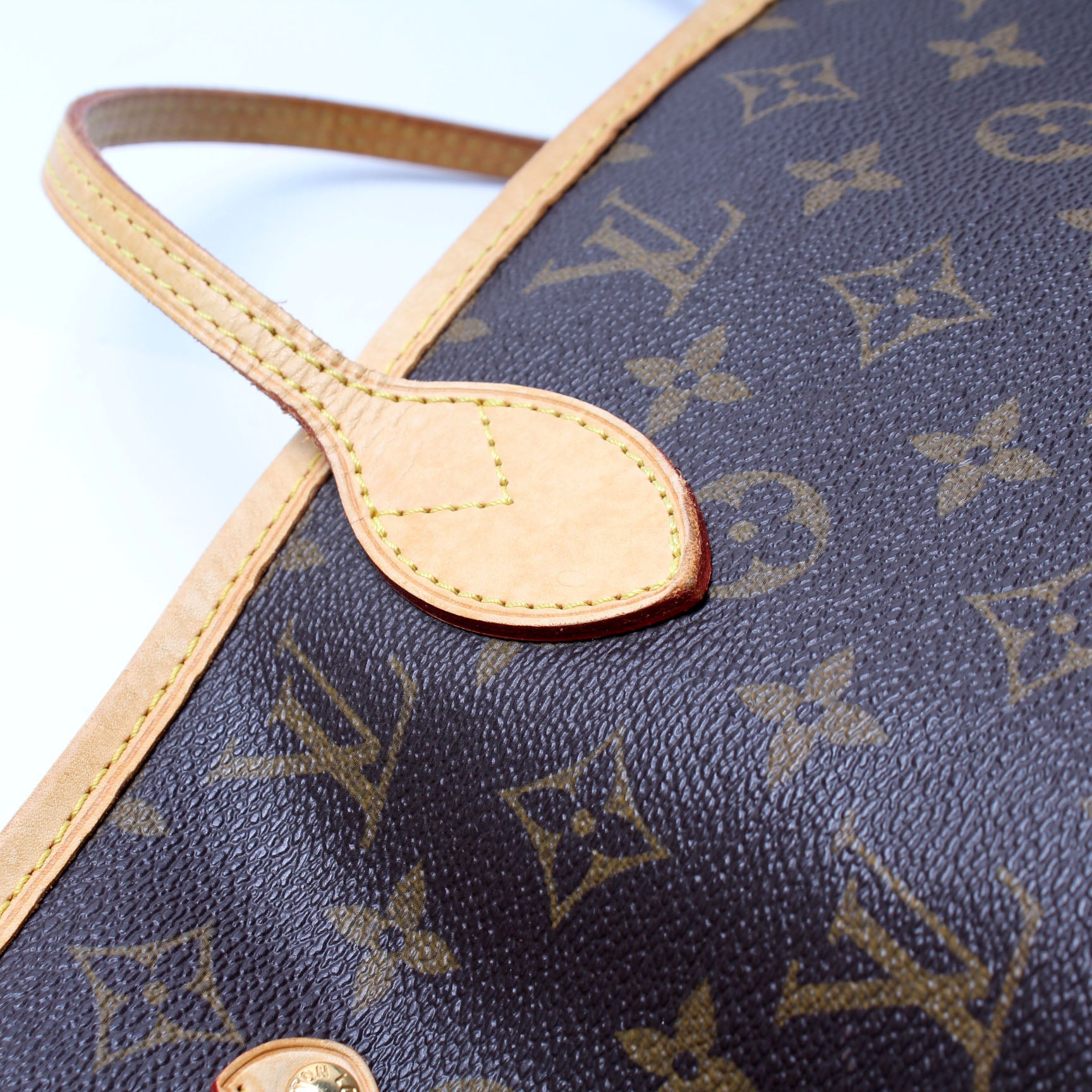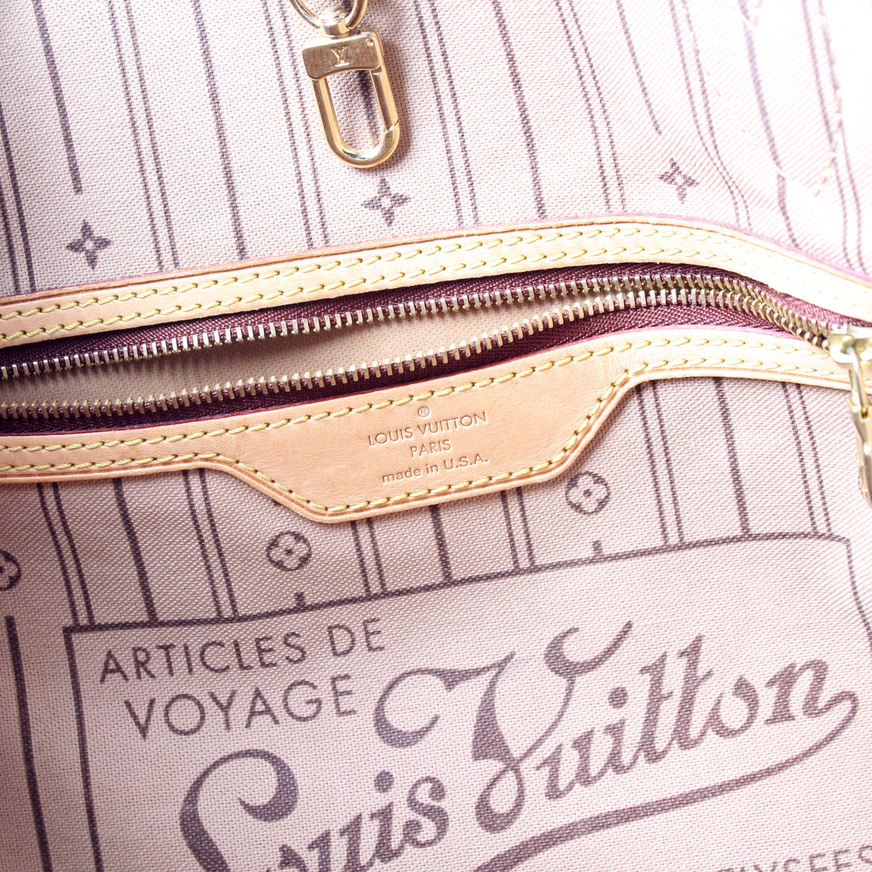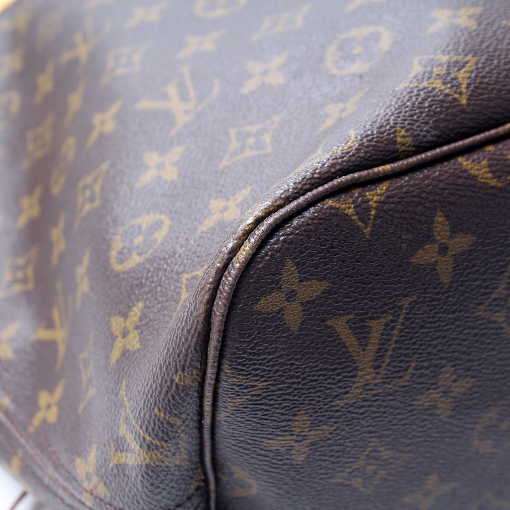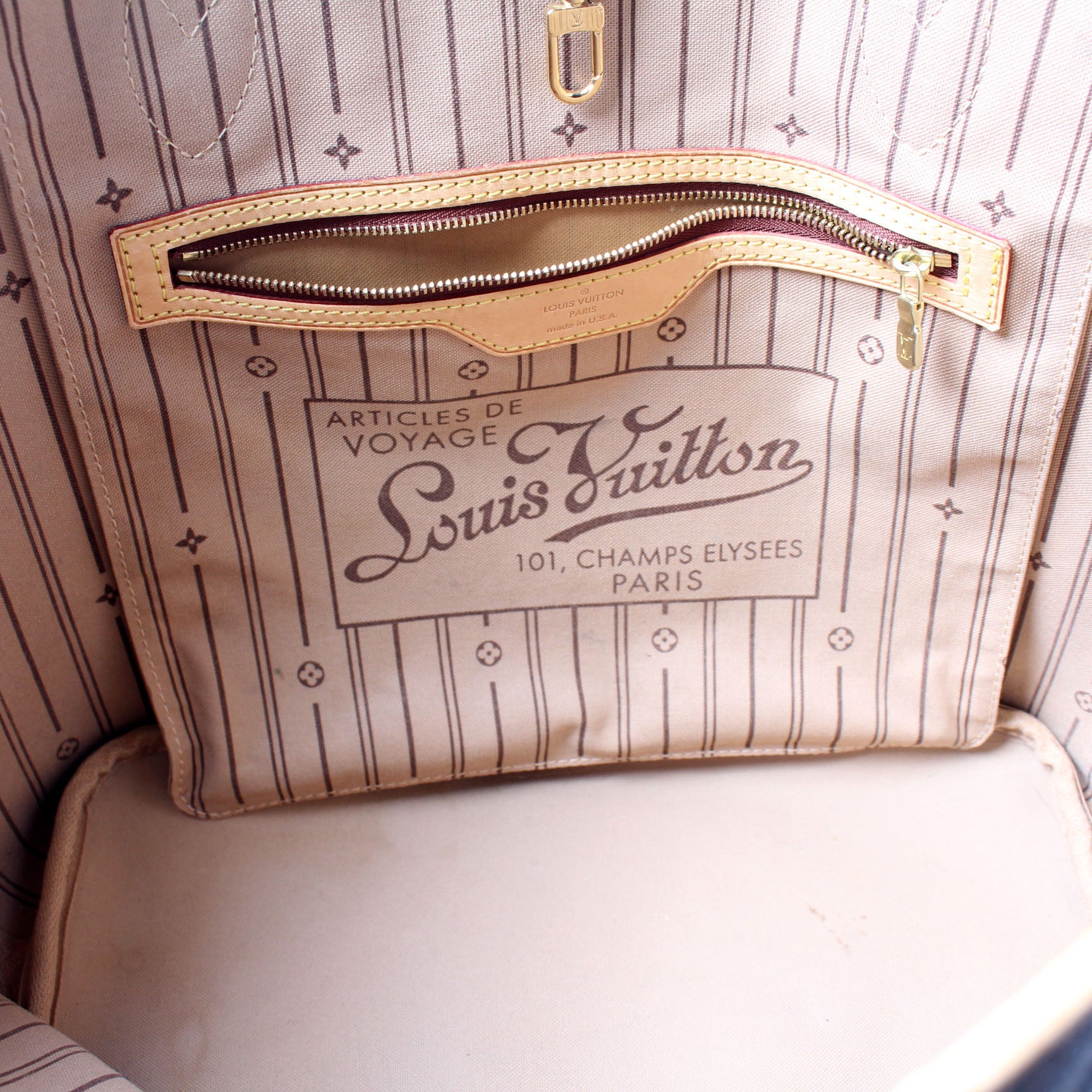 This pre-owned Louis Vuitton Neverfull MM is guaranteed 100% authentic. The exterior is in the classic Louis Vuitton Monogram coated canvas.