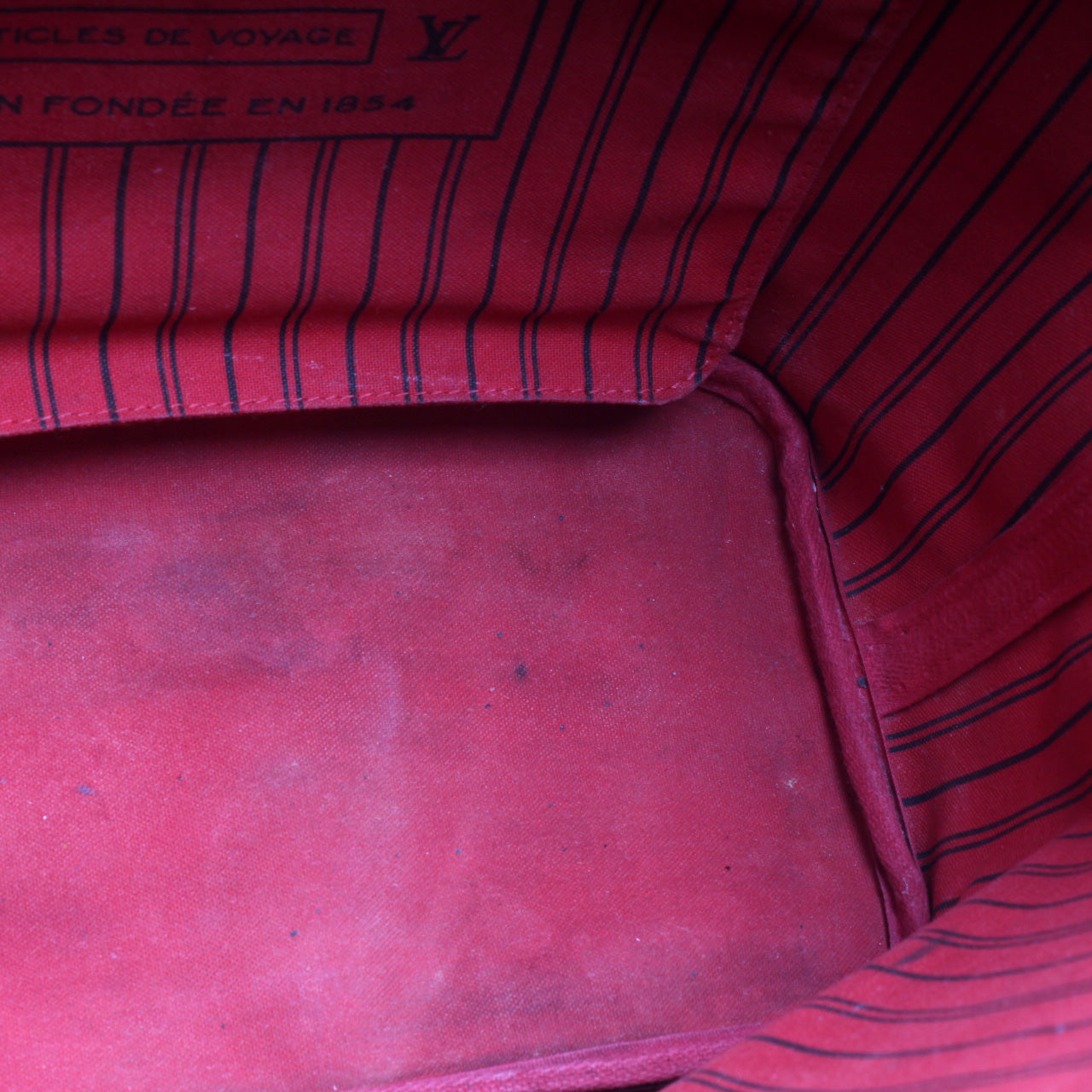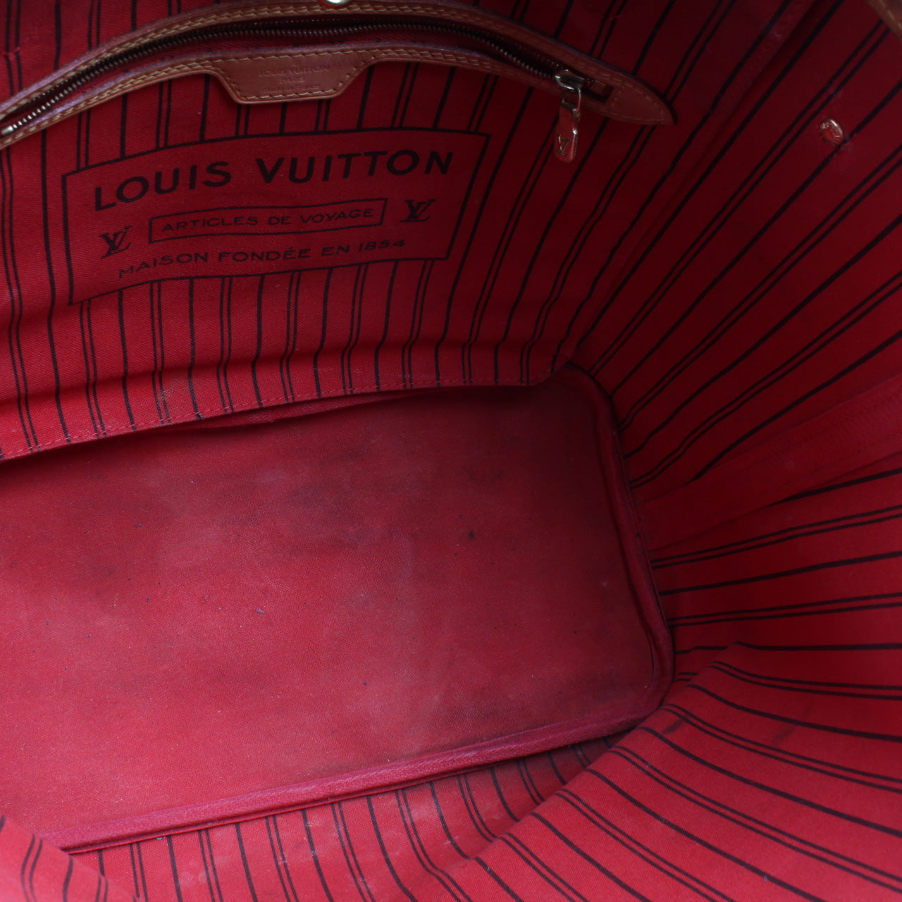 Interior: The interior is free of rips or tears. The interior features one zip closure pocket. There is heavy discoloration and staining to the interior.