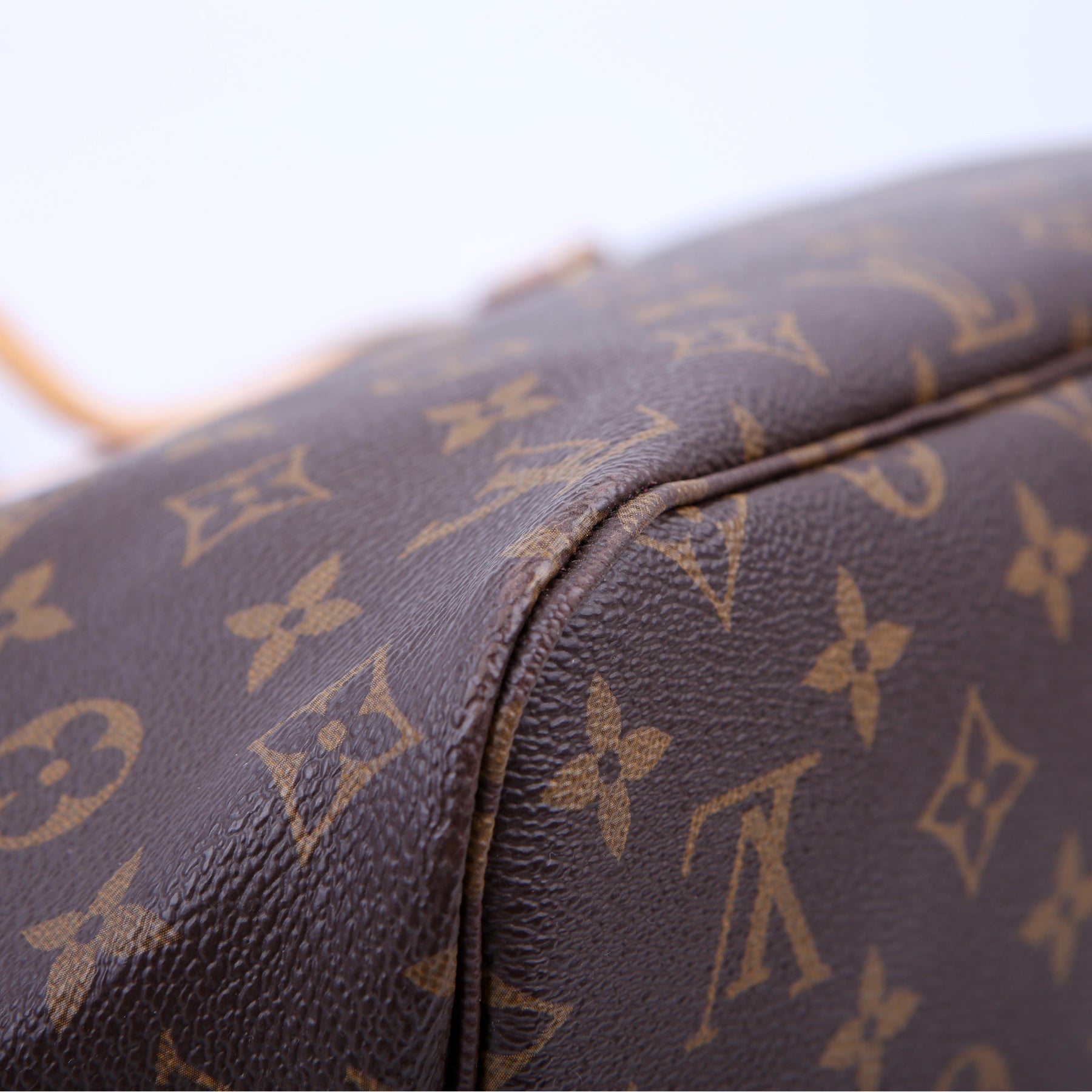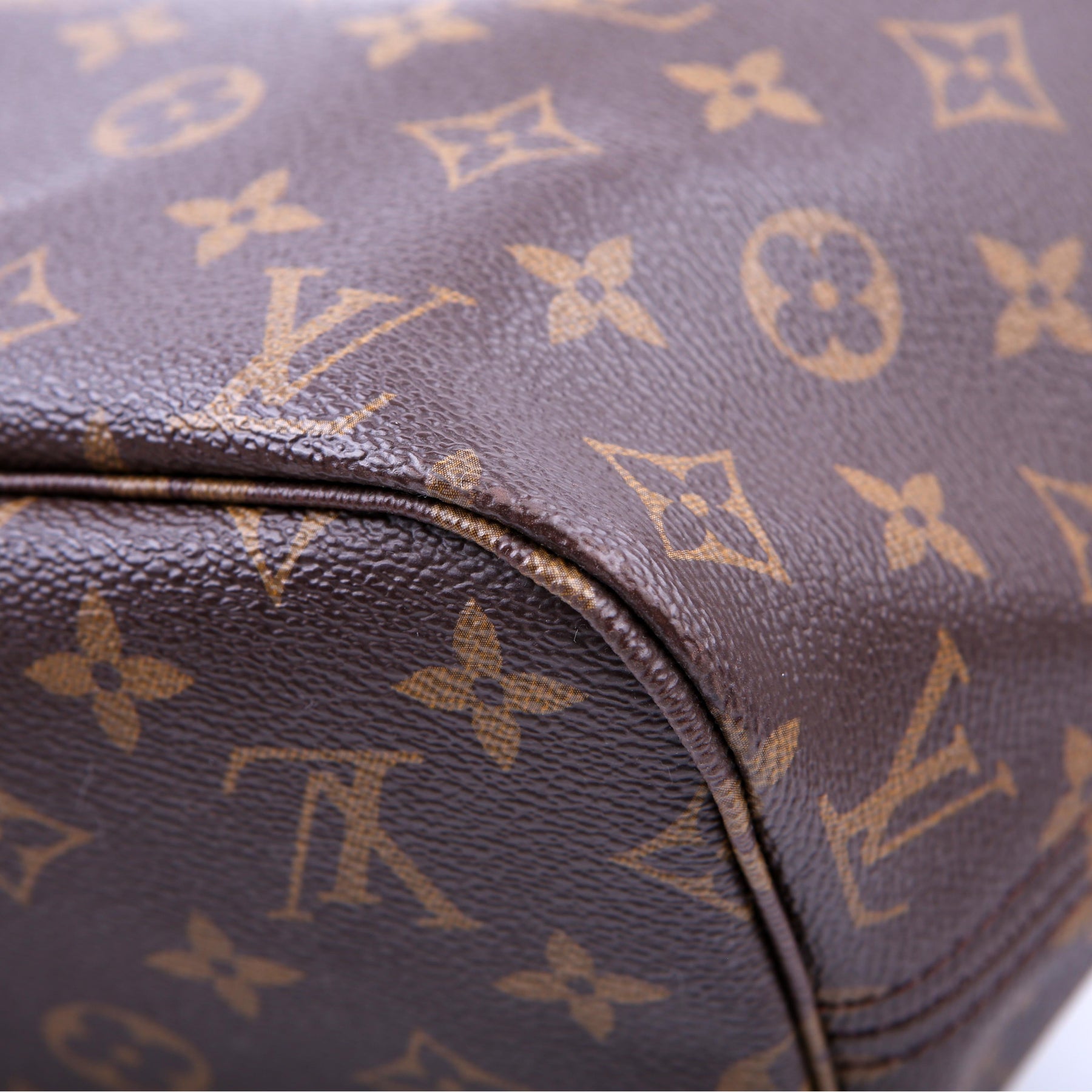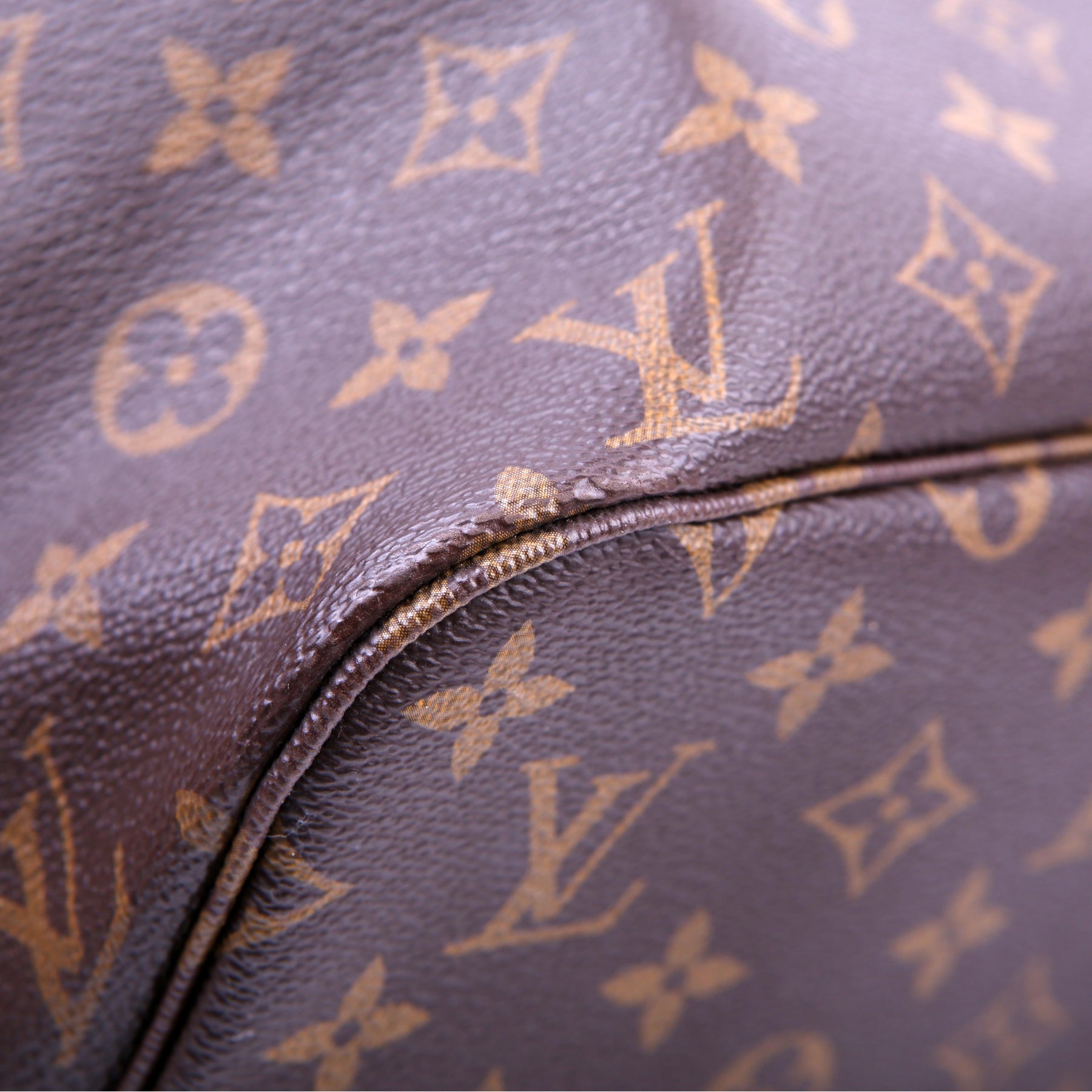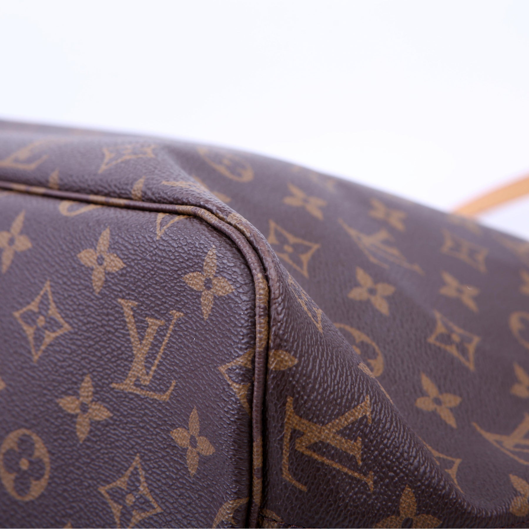 This pre-owned Louis Vuitton Neverfull MM is guaranteed 100% authentic. The exterior is in the classic Louis Vuitton Monogram coated canvas.