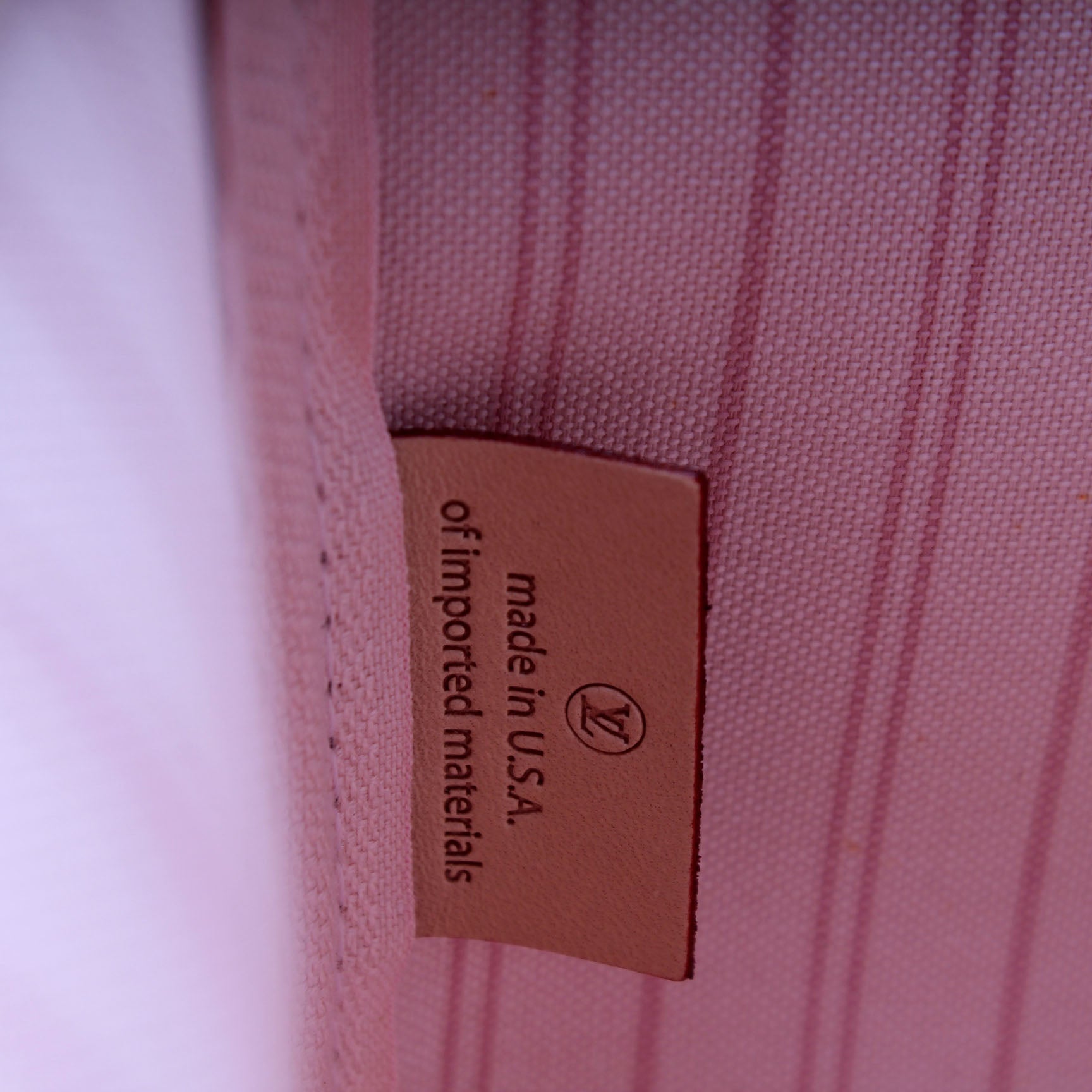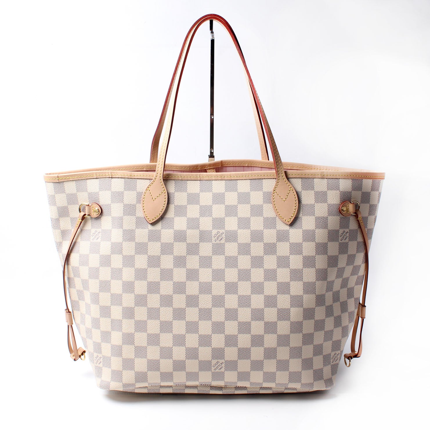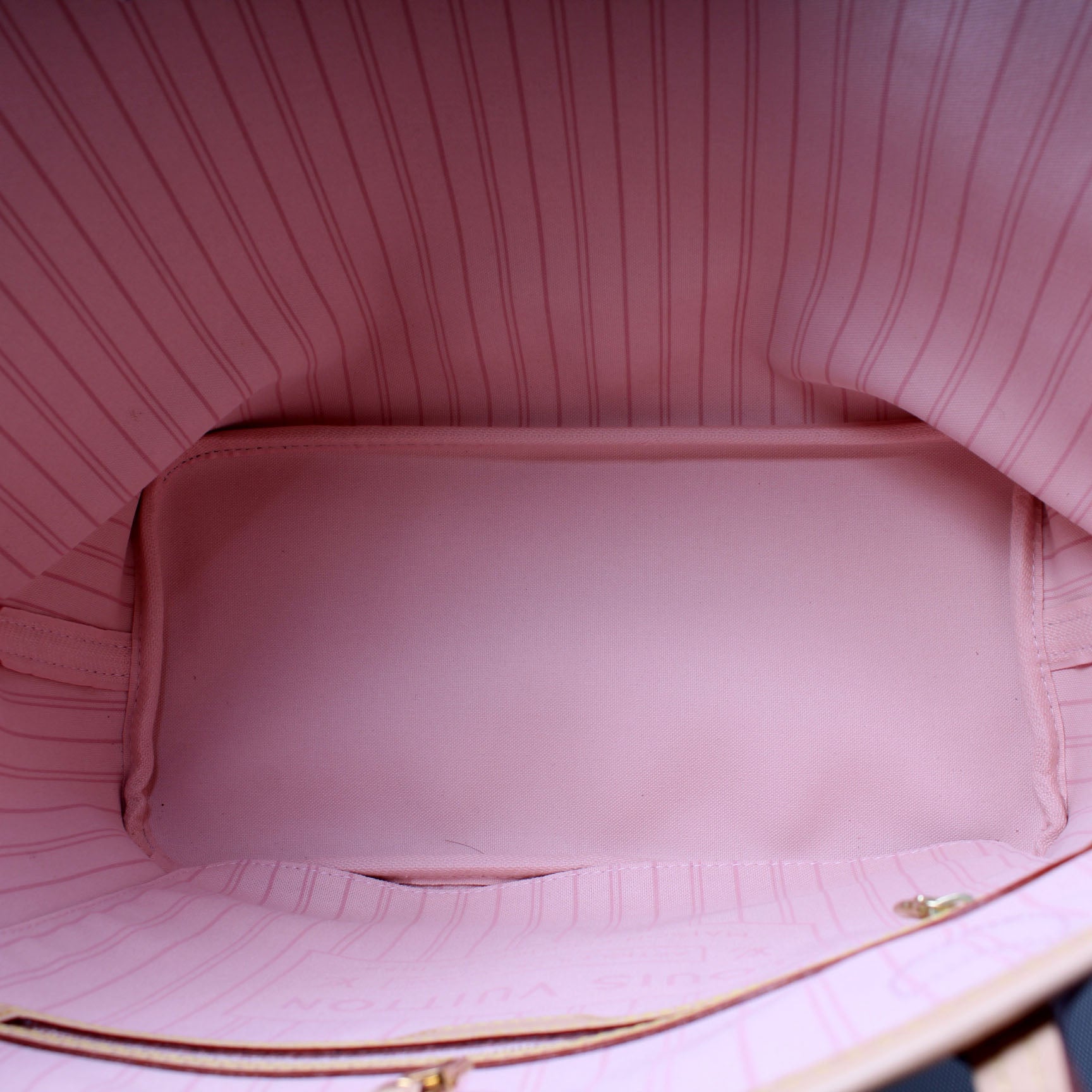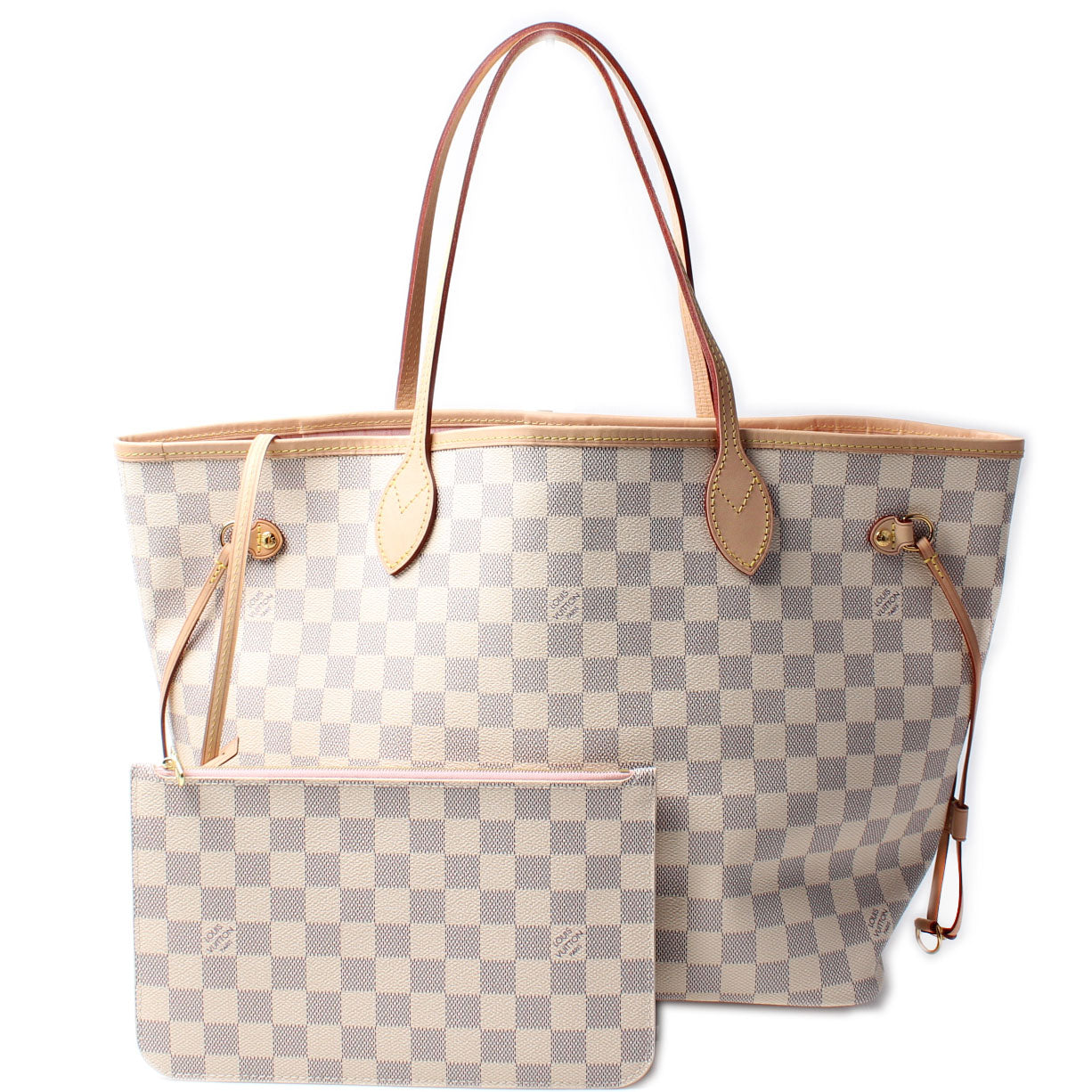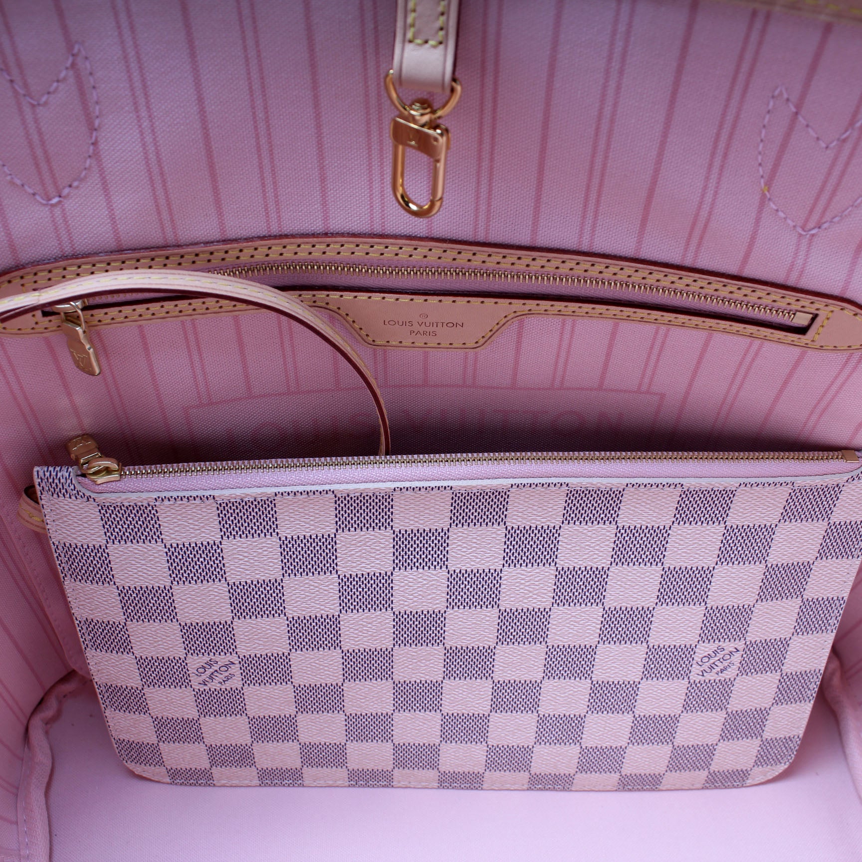 This pre-owned Louis Vuitton Neverfull MM W/Wallet is guaranteed 100% authentic. The exterior is in the classic Louis Vuitton Damier Azur coated canvas.