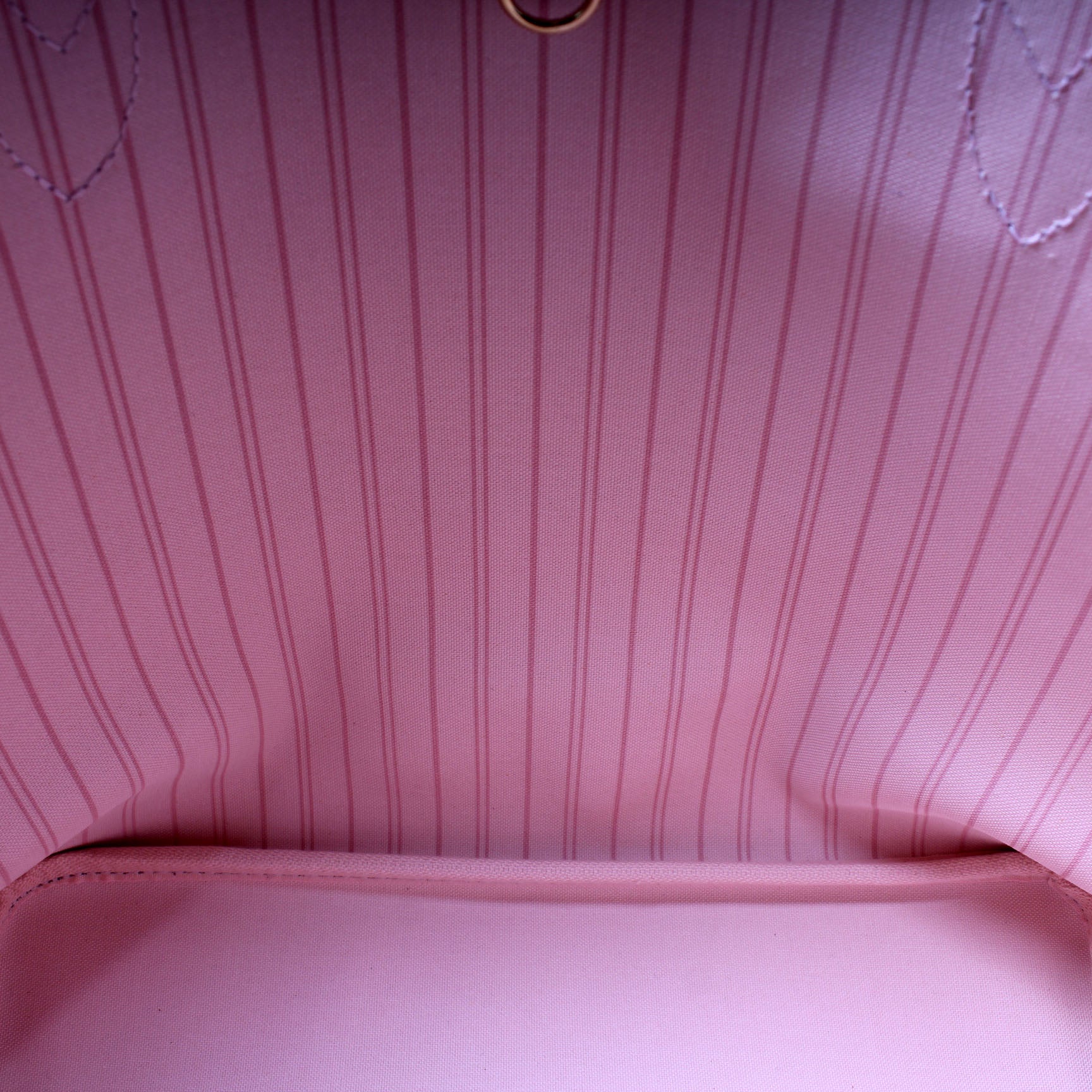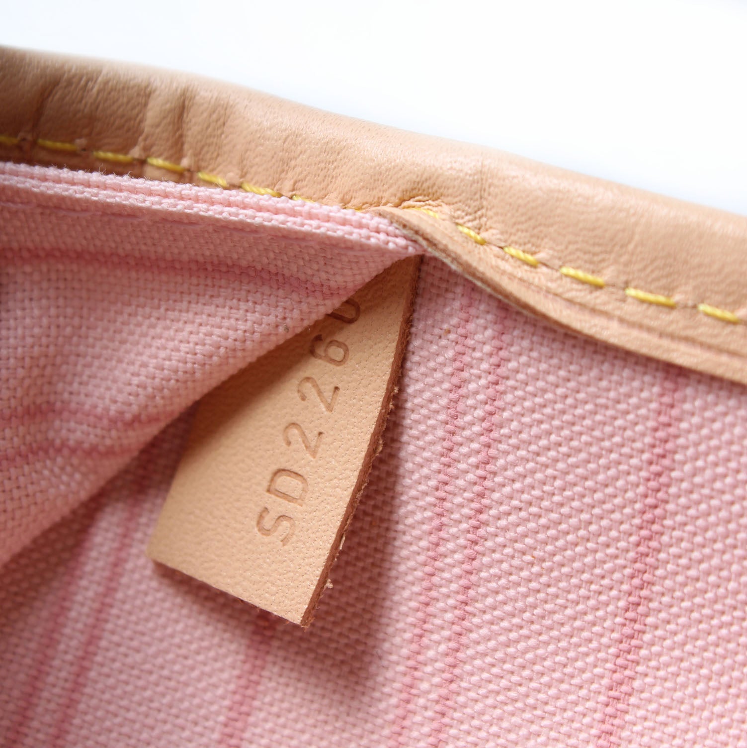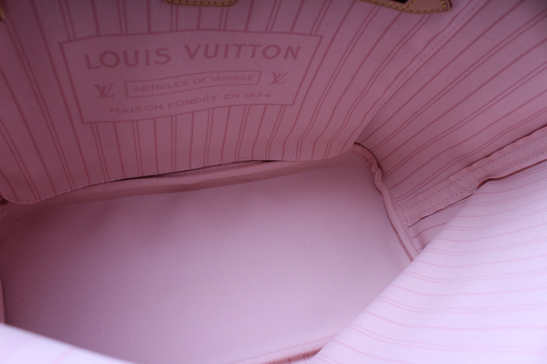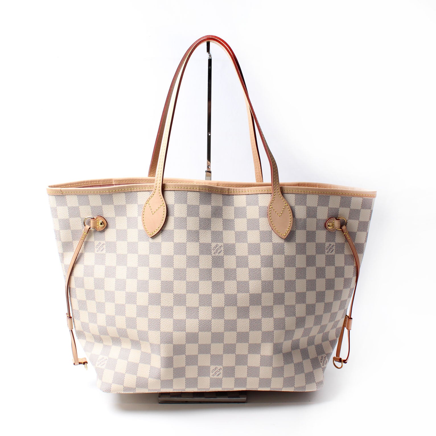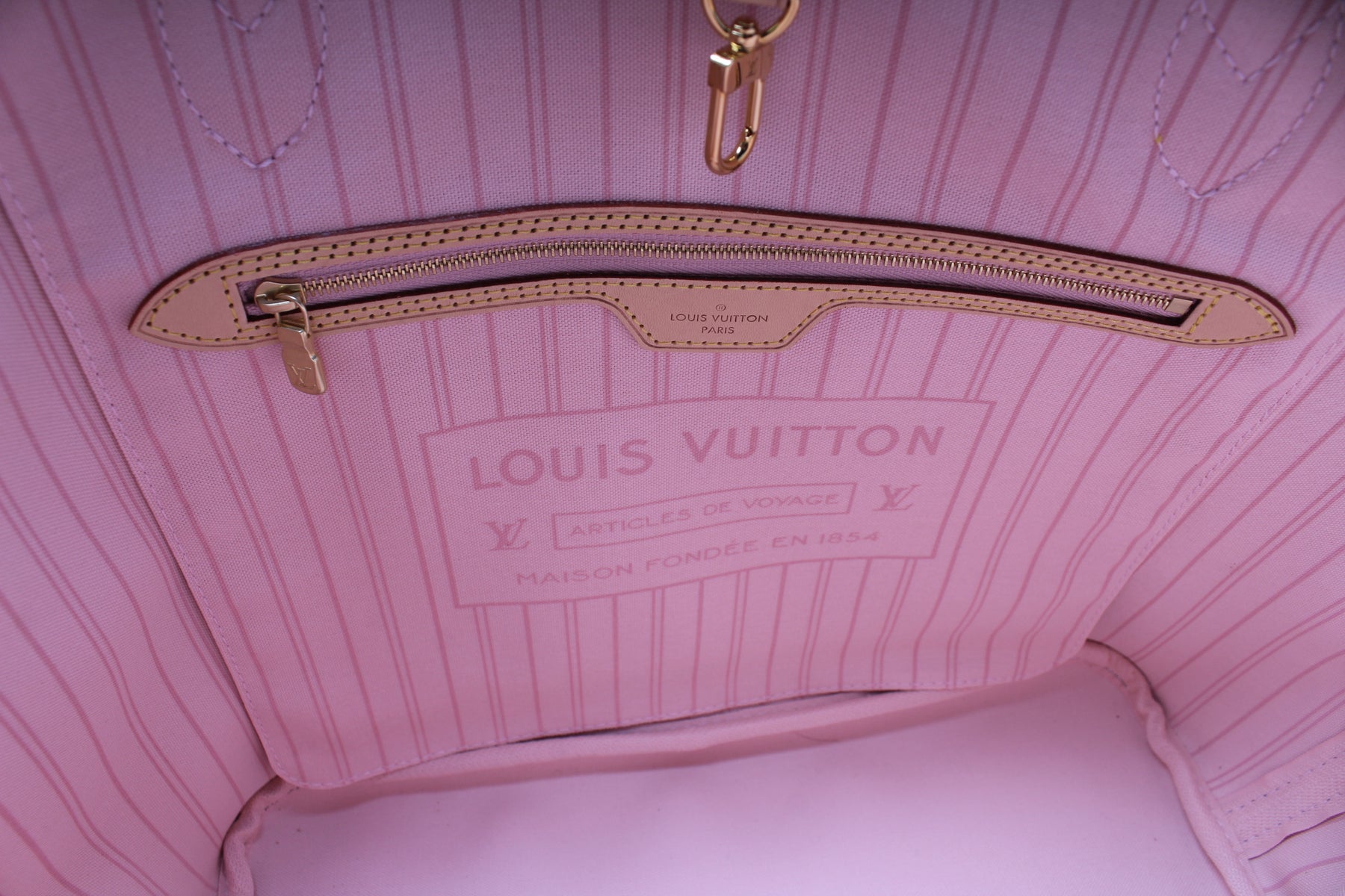 This pre-owned Louis Vuitton Neverfull MM W/Wallet is guaranteed 100% authentic. The exterior is in the classic Louis Vuitton Damier Azur coated canvas.