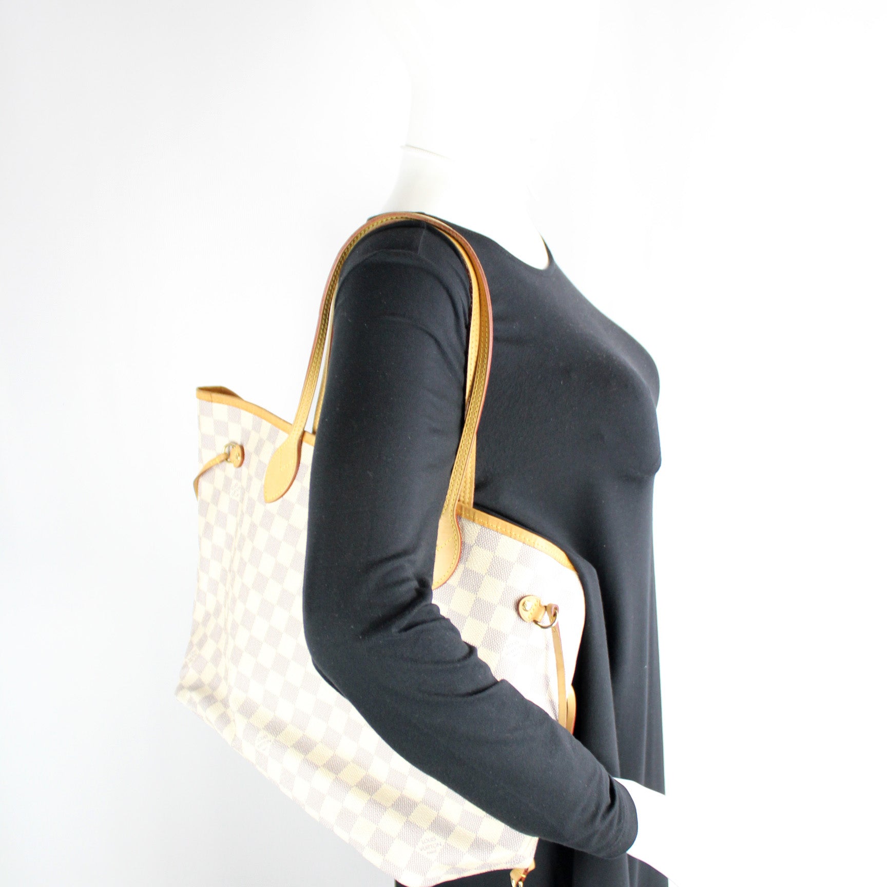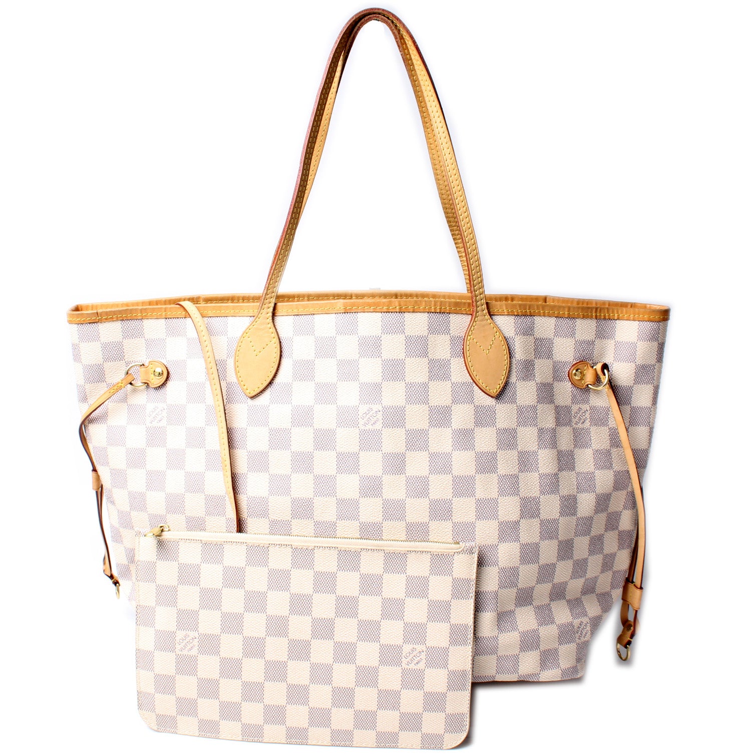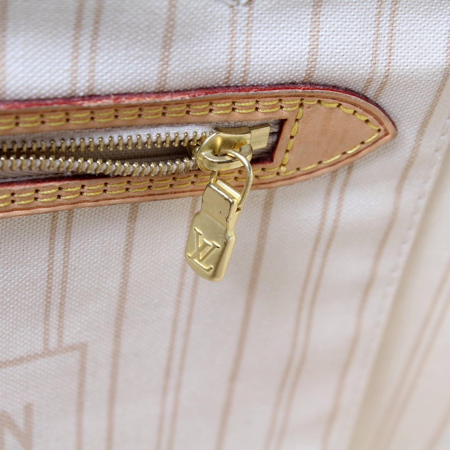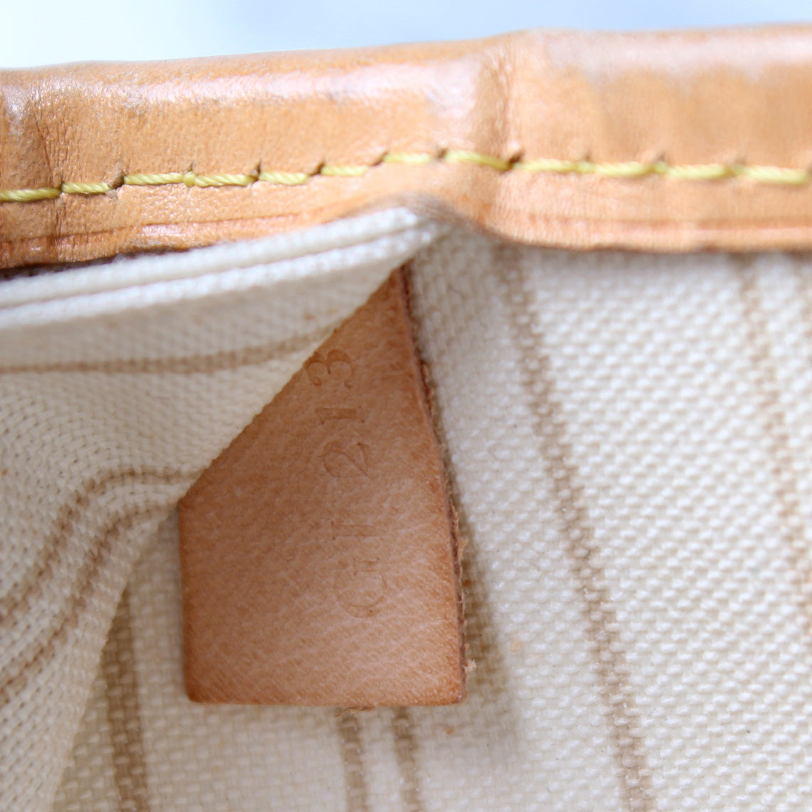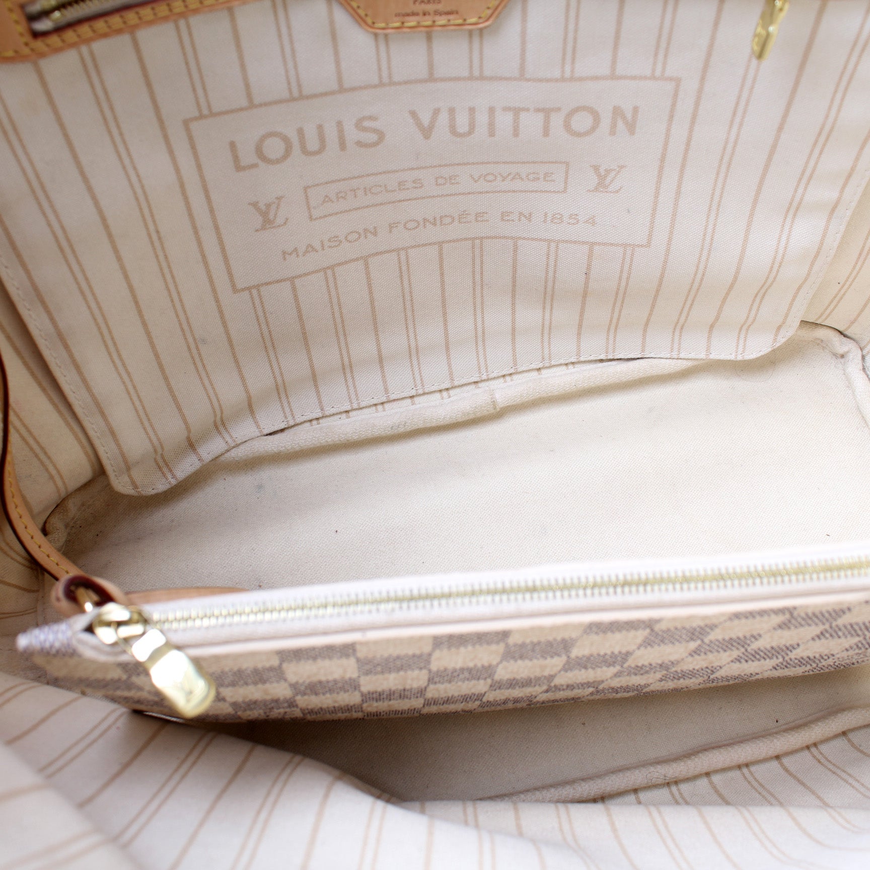 This pre-owned Louis Vuitton Neverfull MM W/ Wallet is guaranteed 100% authentic. The exterior is in the classic Louis Vuitton Damier Azur coated canvas.