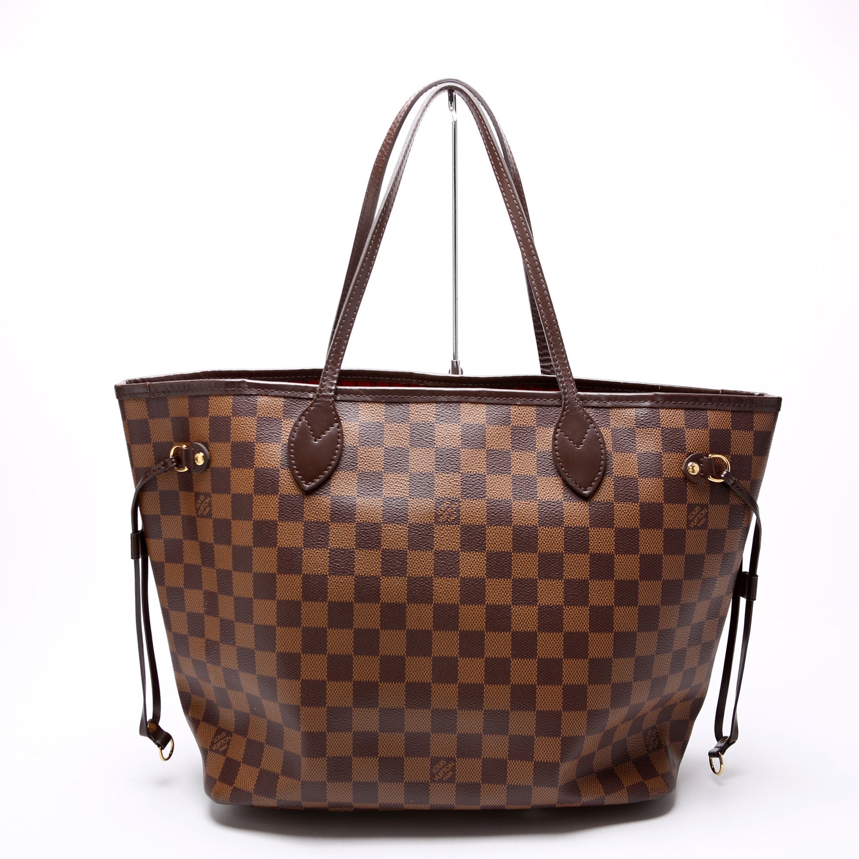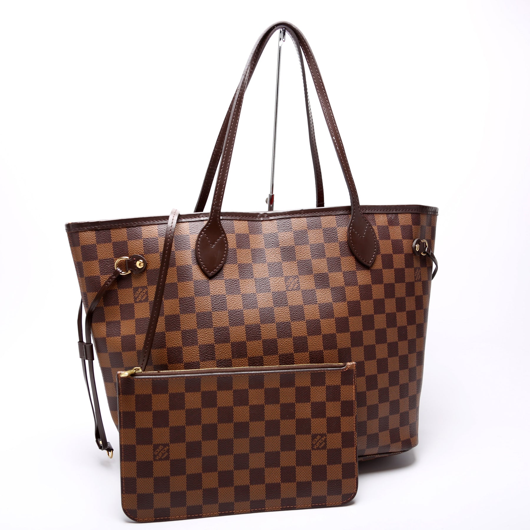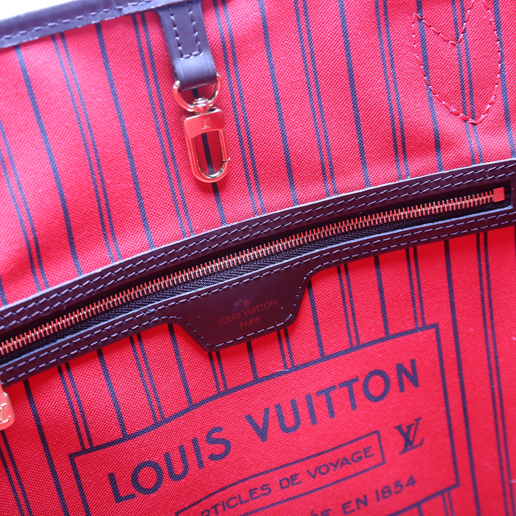 This pre-owned Louis Vuitton Neverfull MM W/Wallet is guaranteed 100% authentic. The exterior is in the classic Louis Vuitton Damier Ebene coated canvas.