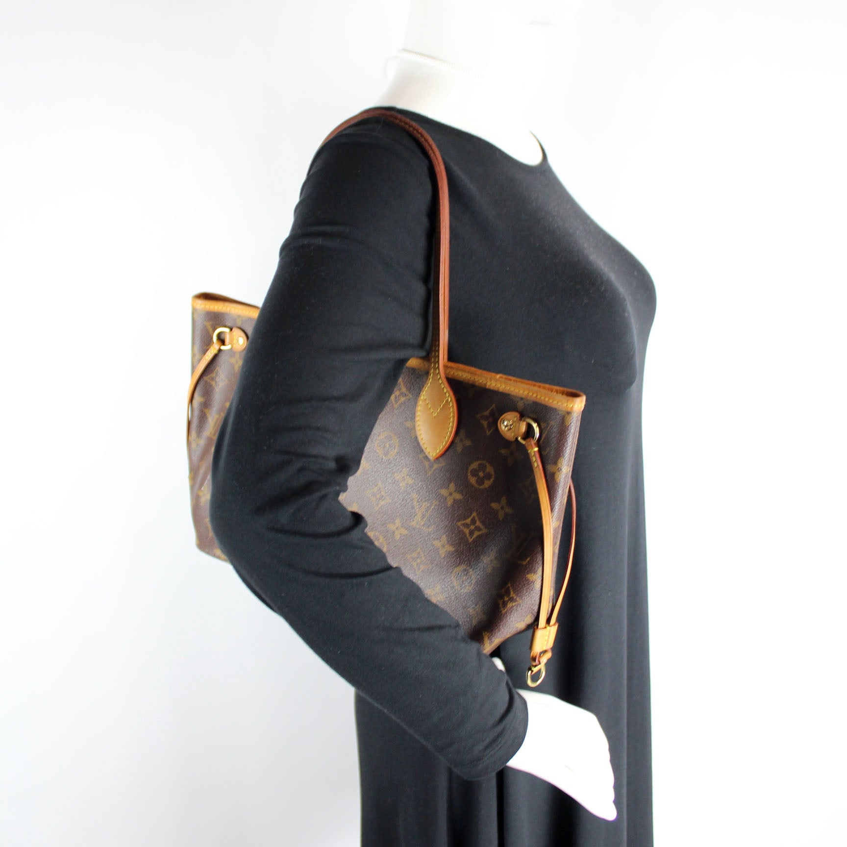 This pre-owned Louis Vuitton Neverfull PM is guaranteed 100% authentic. The exterior is in the classic Louis Vuitton Monogram coated canvas.