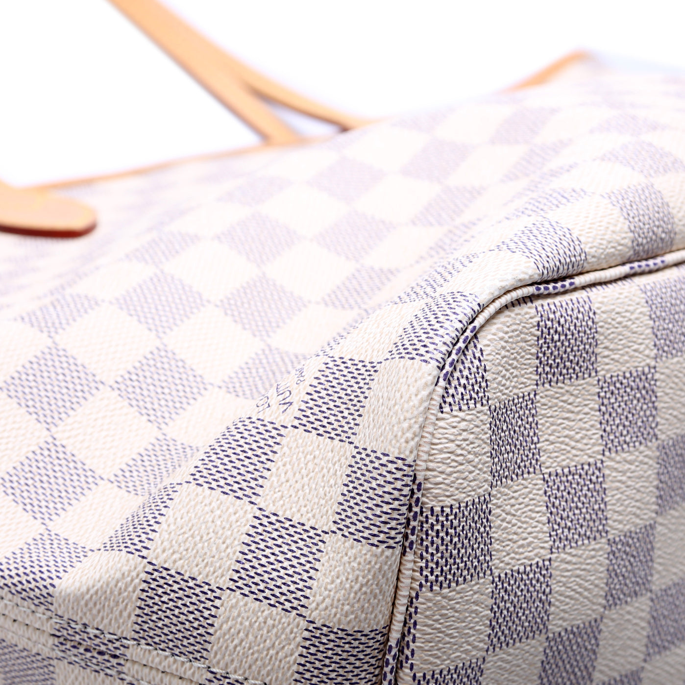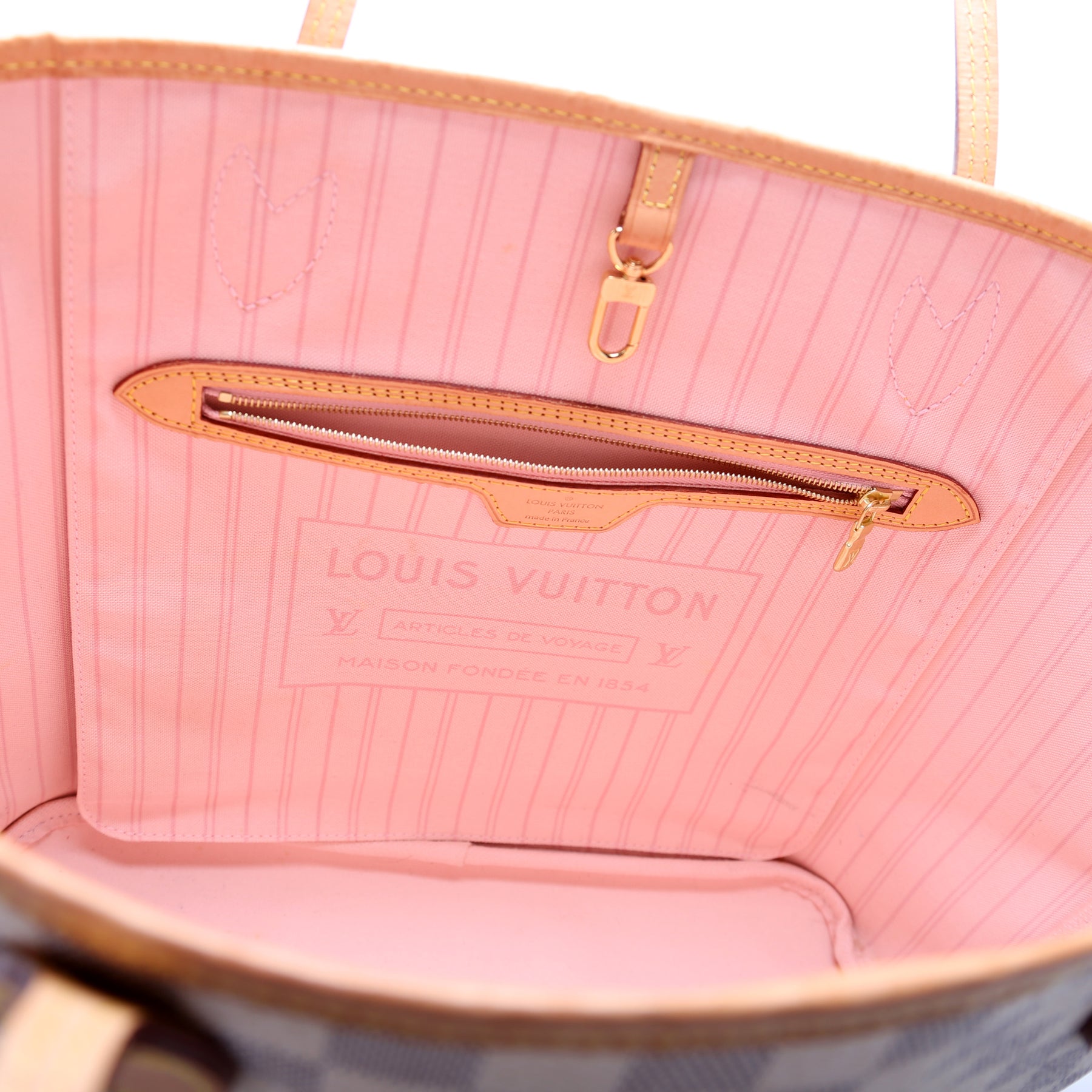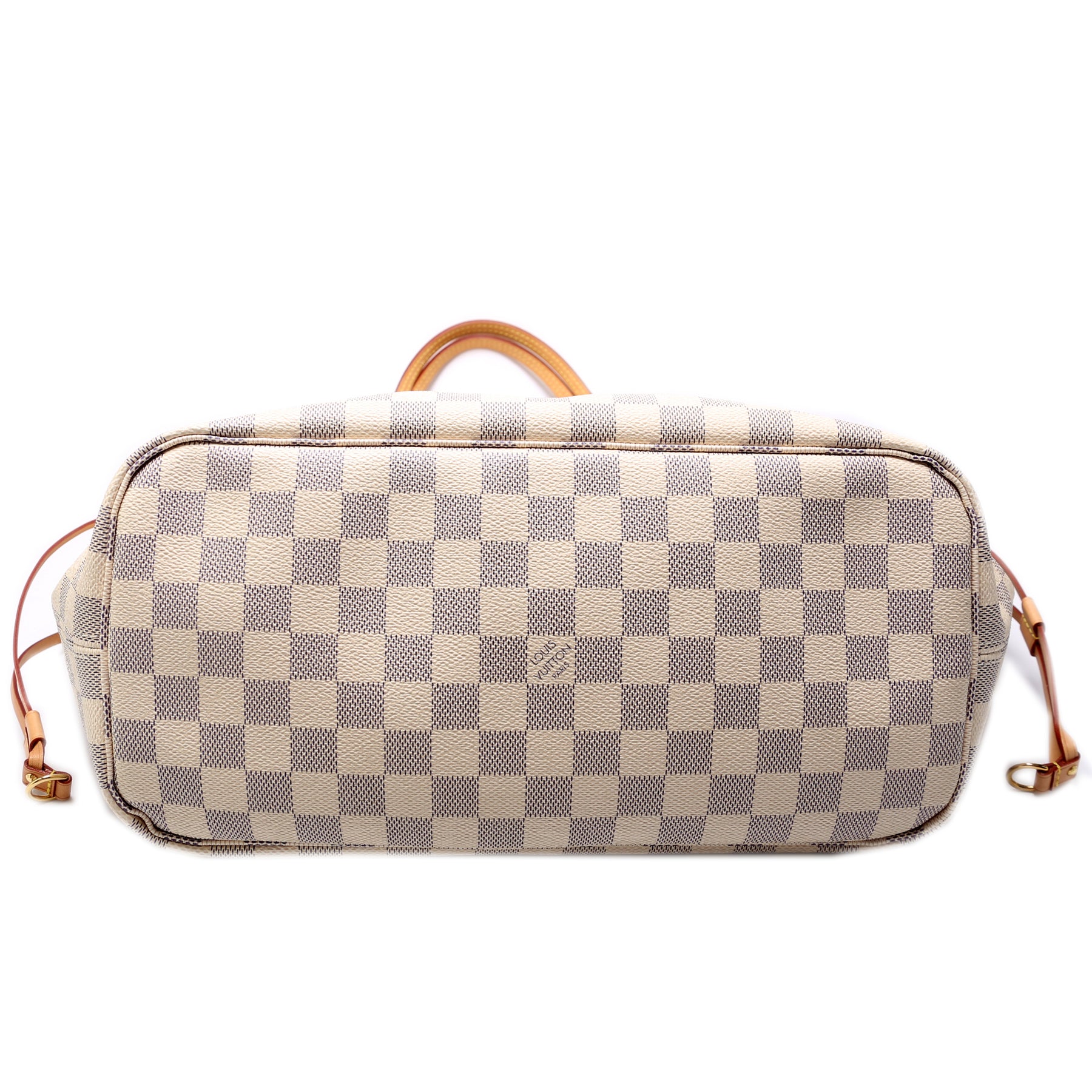 This pre-owned Louis Vuitton Neverfull MM W/Wallet is guaranteed 100% authentic. The exterior is in the classic Louis Vuitton Damier Azur coated canvas.