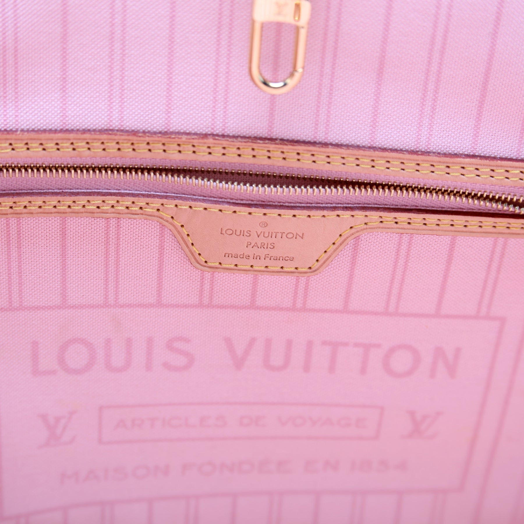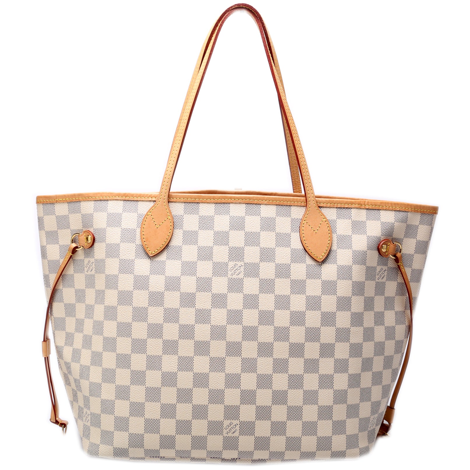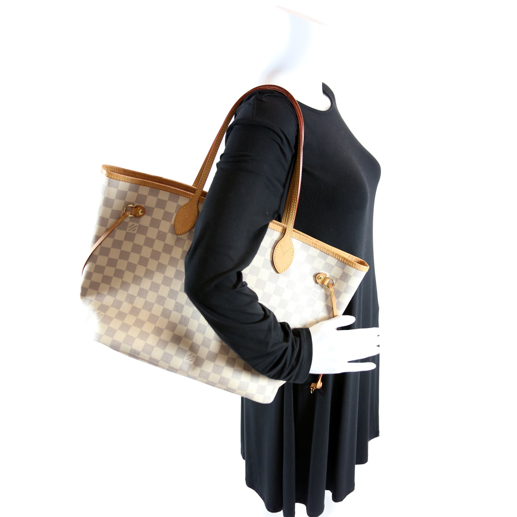 This pre-owned Louis Vuitton Neverfull MM W/Wallet is guaranteed 100% authentic. The exterior is in the classic Louis Vuitton Damier Azur coated canvas.