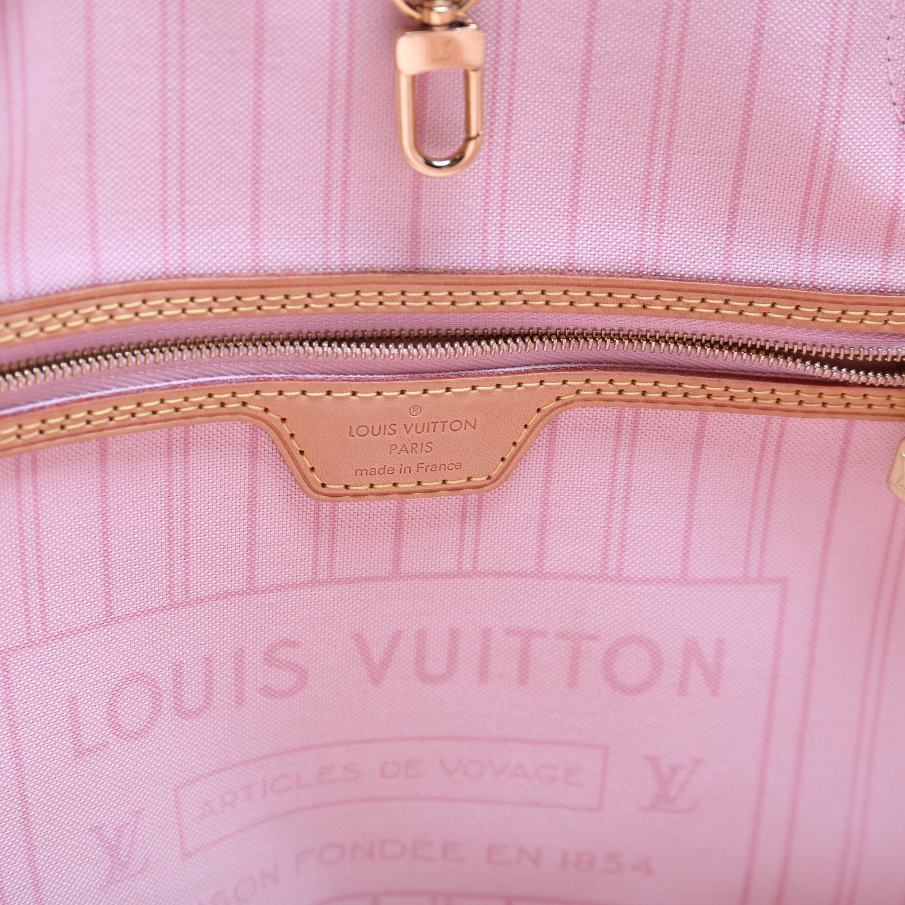 This pre-owned Louis Vuitton Neverfull MM is guaranteed 100% authentic. The exterior is in the classic Louis Vuitton Damier Azur coated canvas.