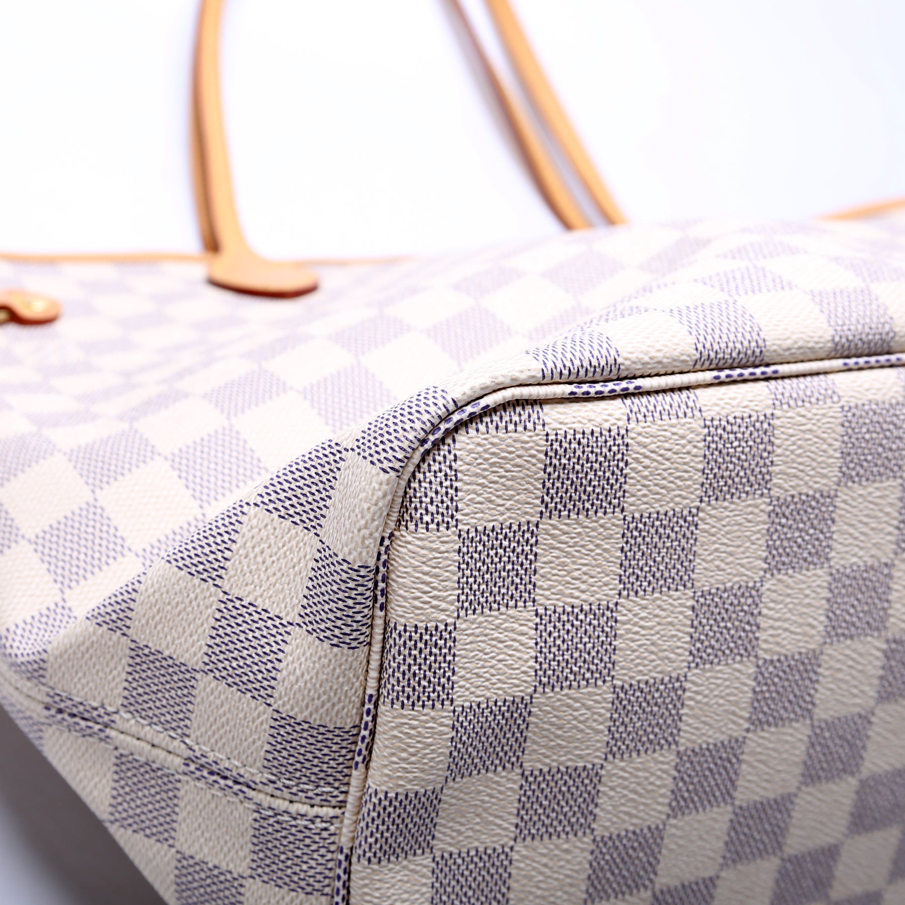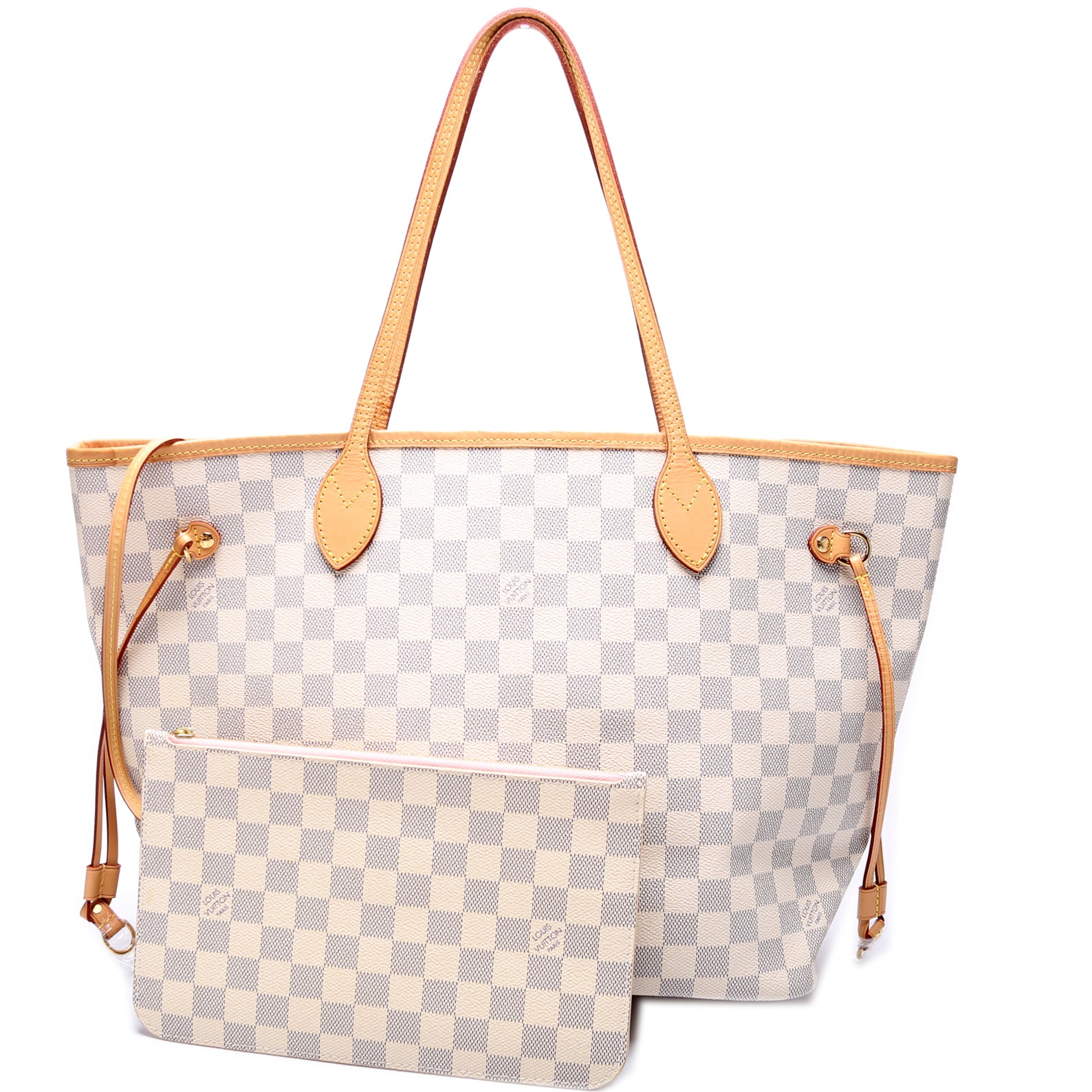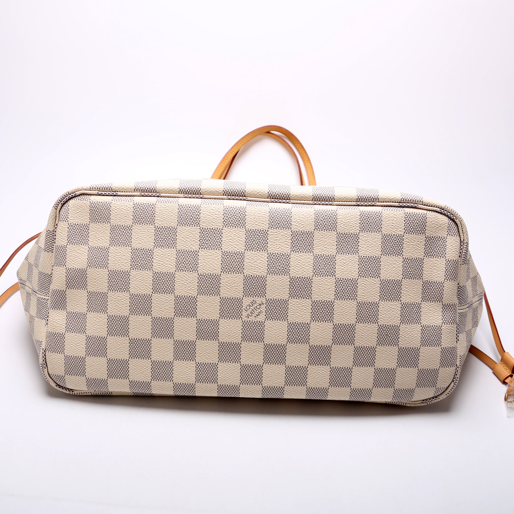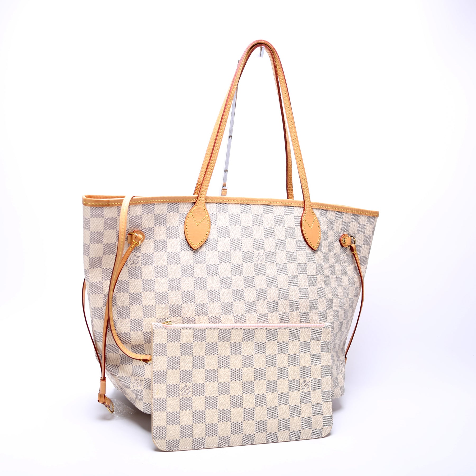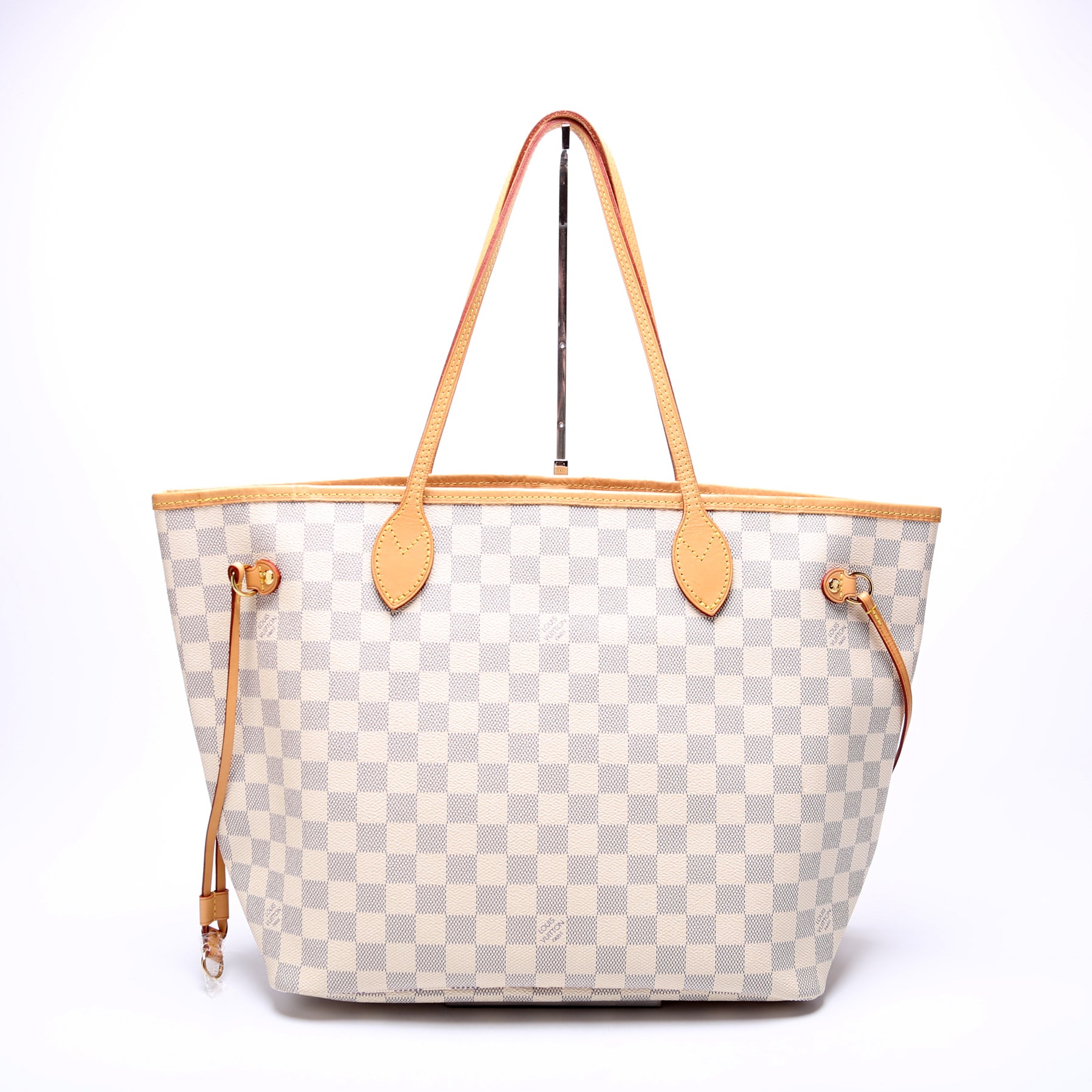 This pre-owned Louis Vuitton Neverfull MM is guaranteed 100% authentic. The exterior is in the classic Louis Vuitton Damier Azur coated canvas.