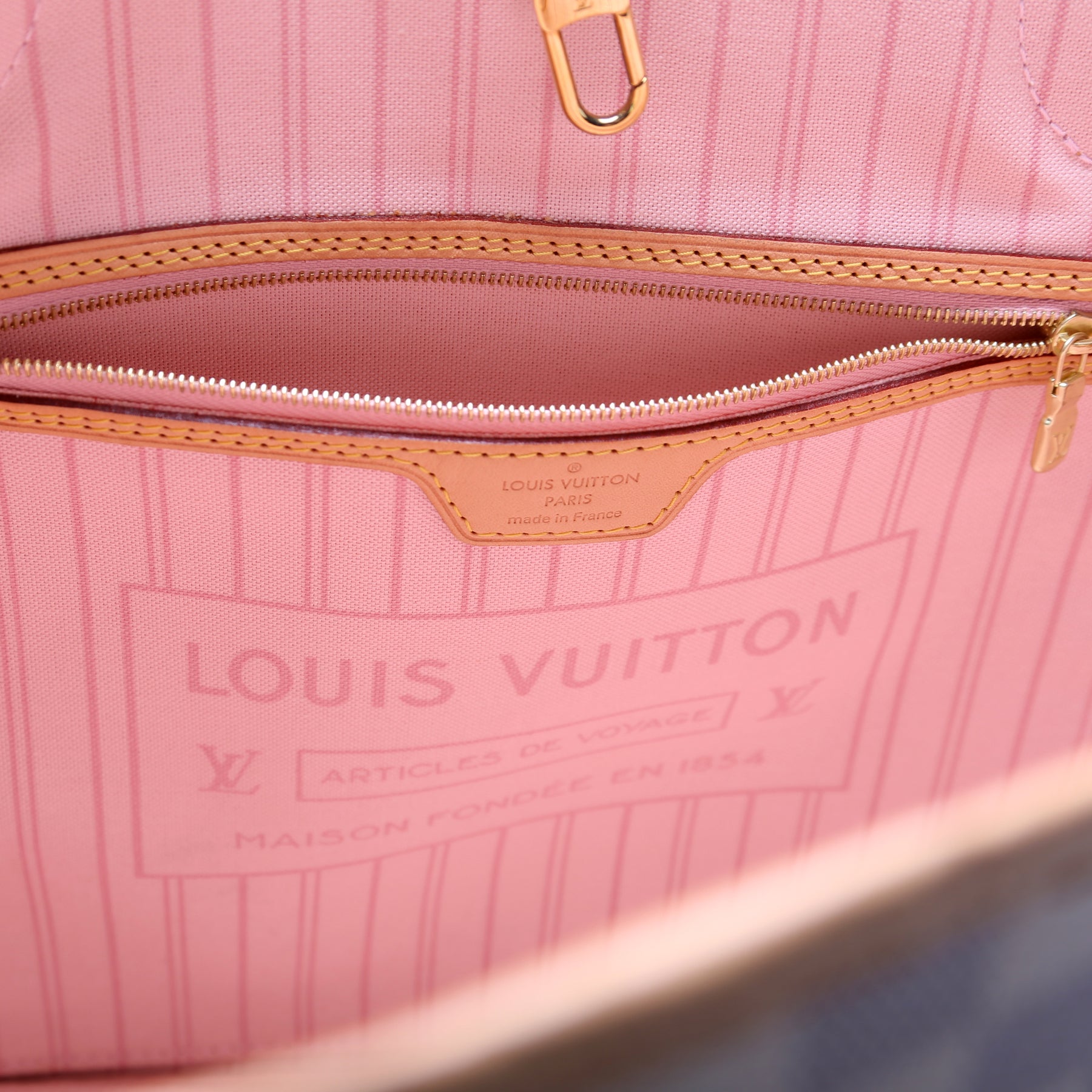 Interior: The interior shows light discoloration. The interior features one zip closure pocket.