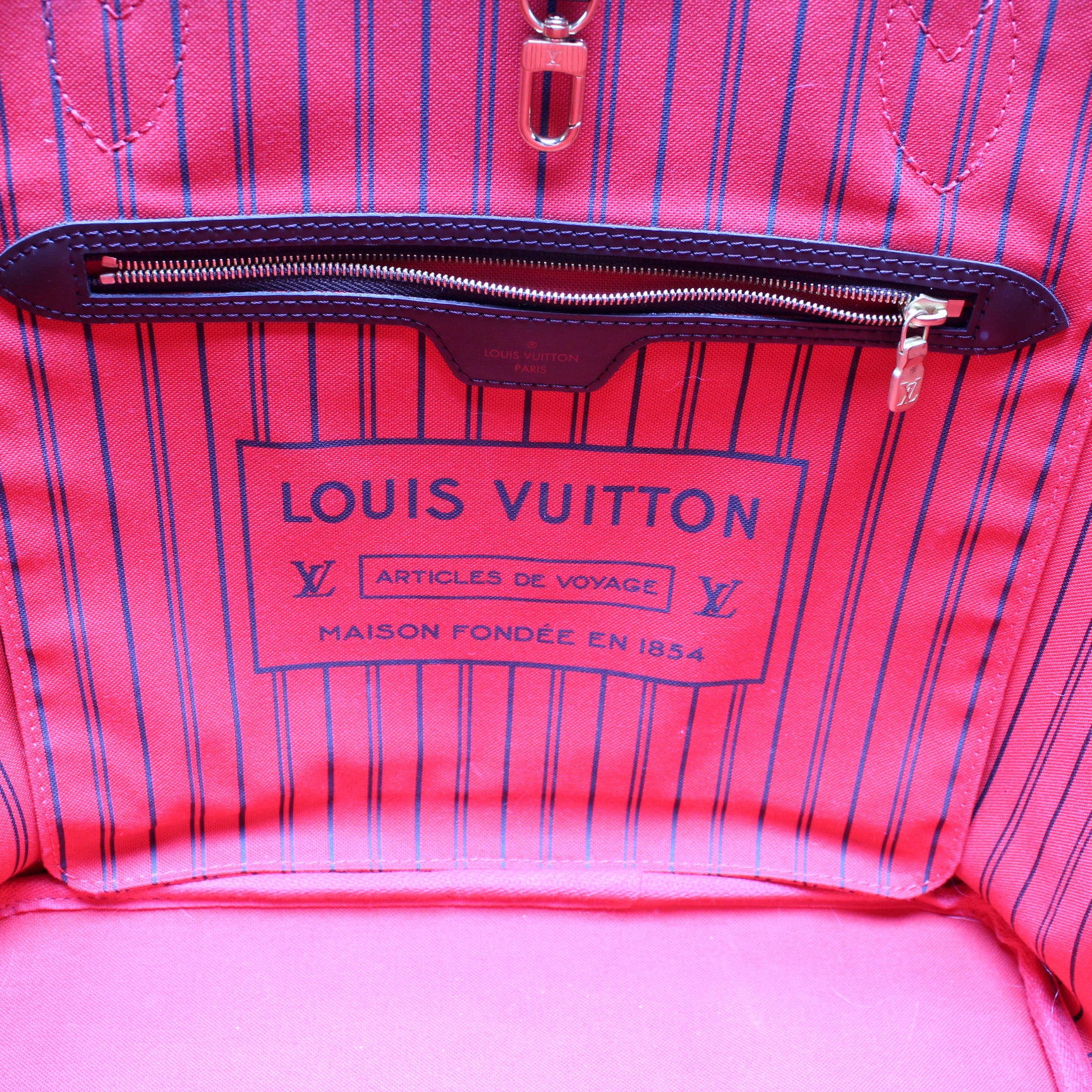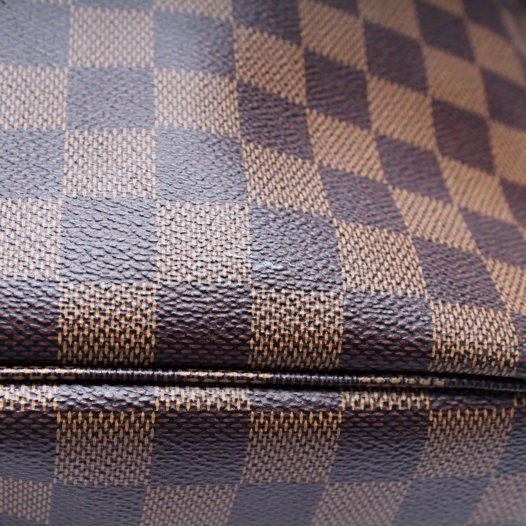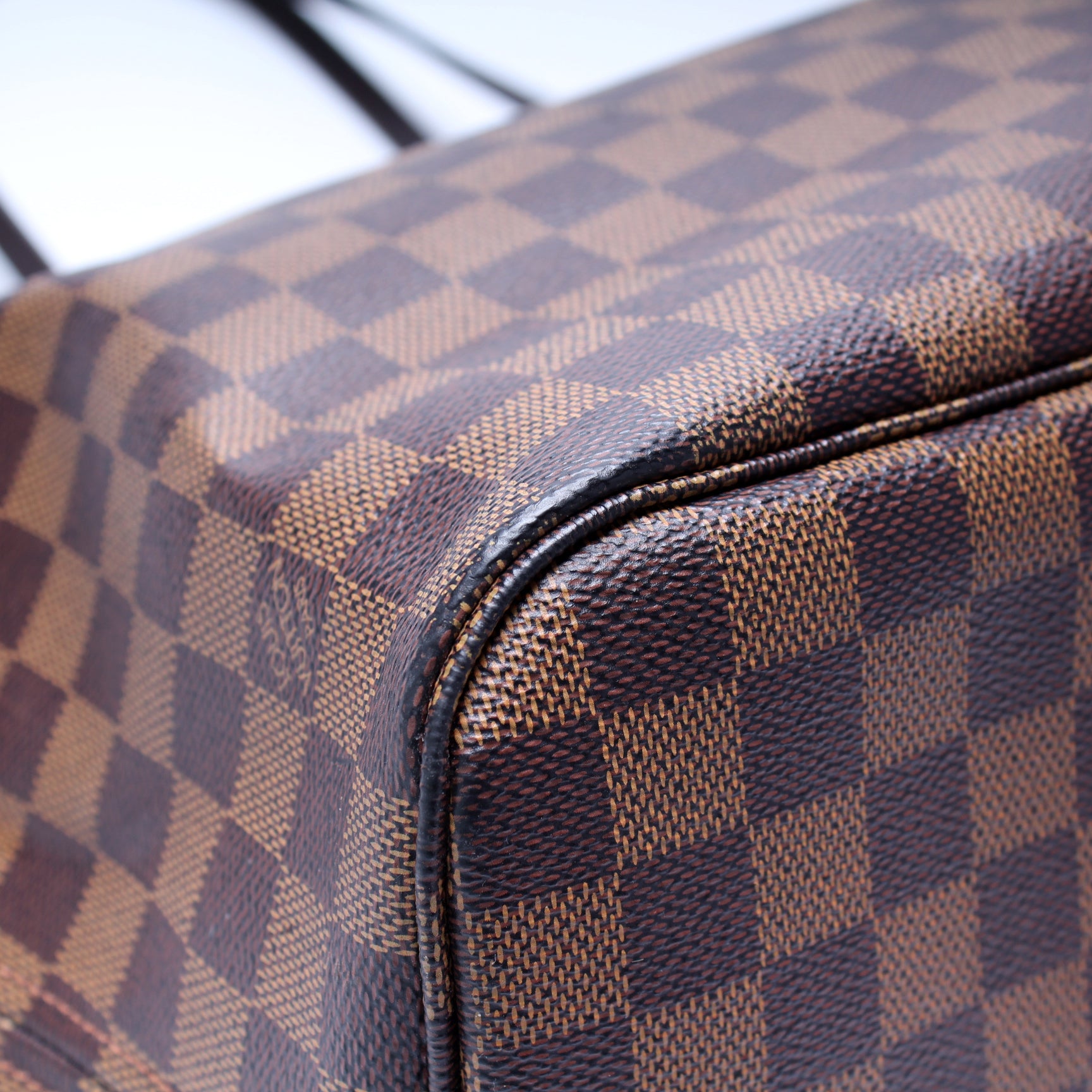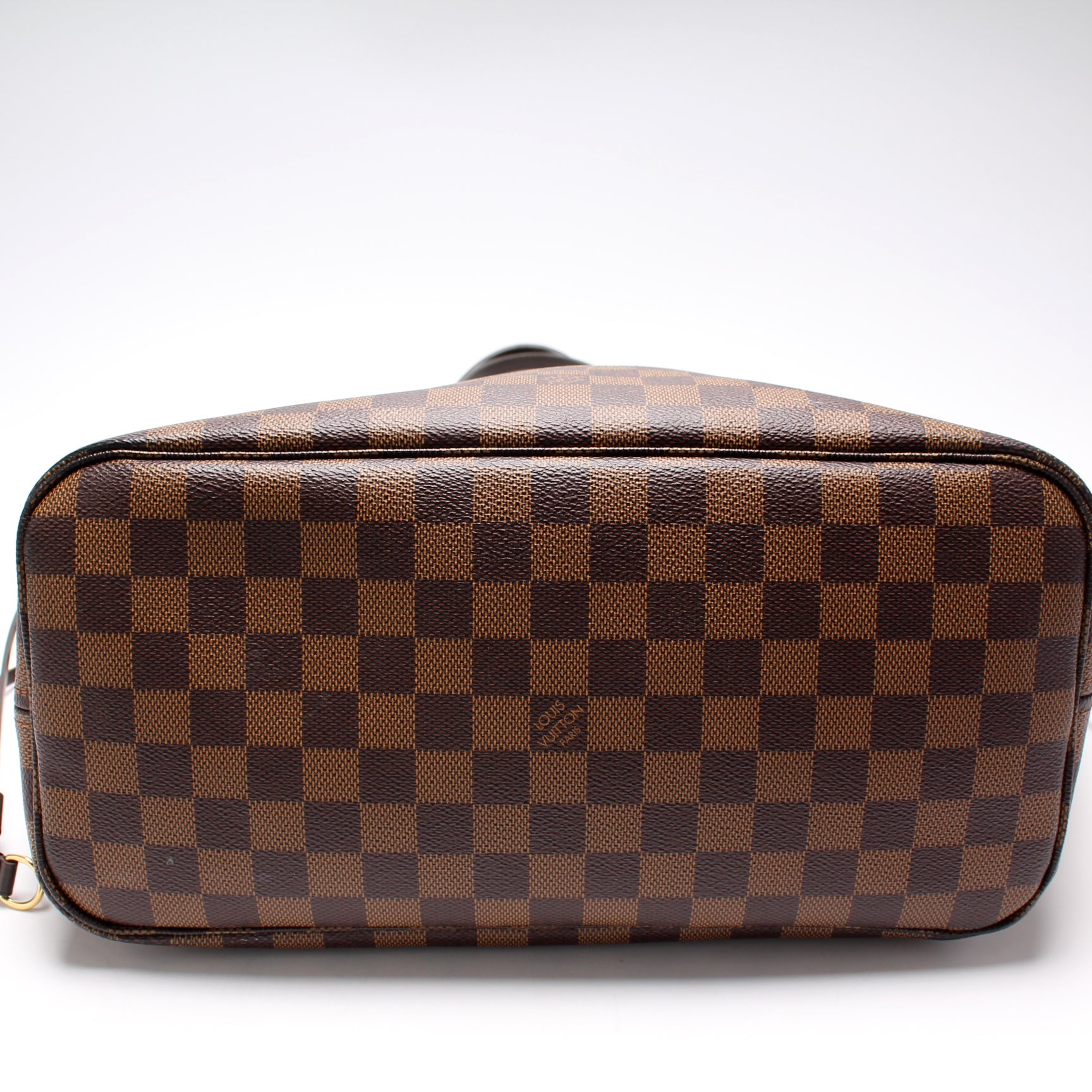 This pre-owned Louis Vuitton Neverfull MM is guaranteed 100% authentic. The exterior is in the classic Louis Vuitton Damier Ebene coated canvas.