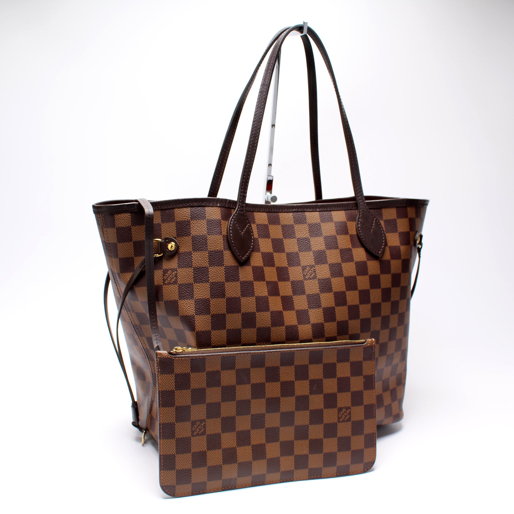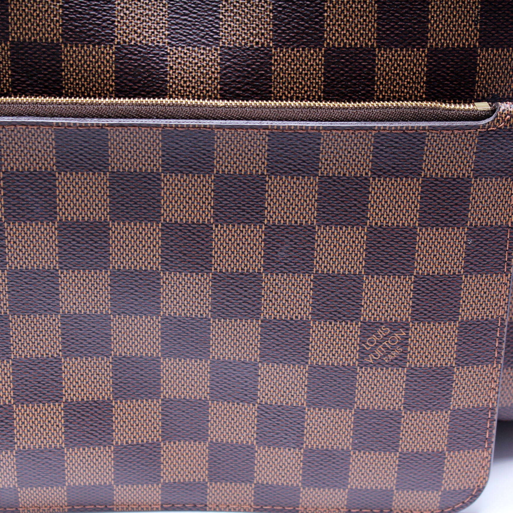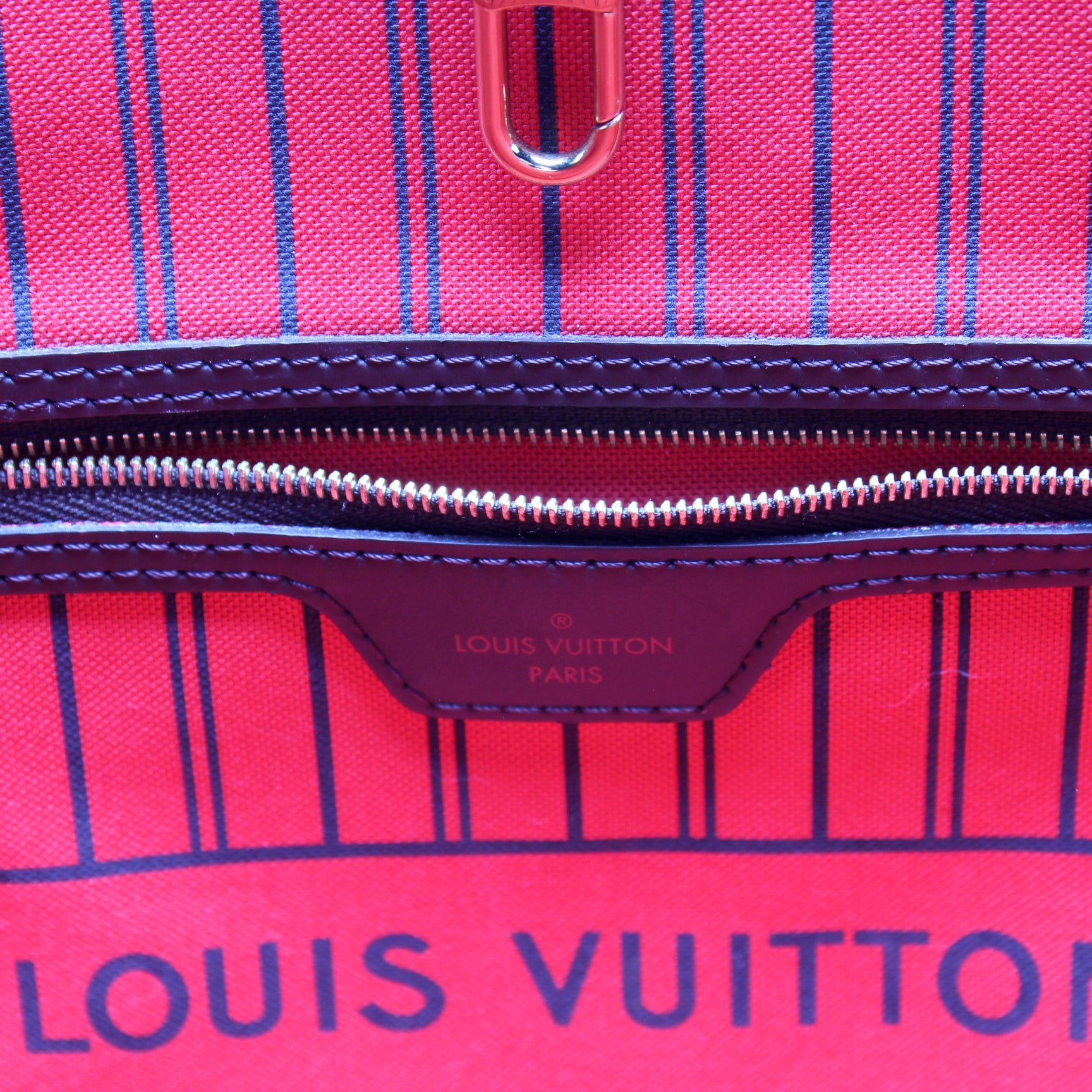 This pre-owned Louis Vuitton Neverfull MM is guaranteed 100% authentic. The exterior is in the classic Louis Vuitton Damier Ebene coated canvas.
