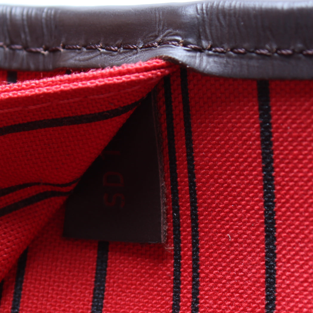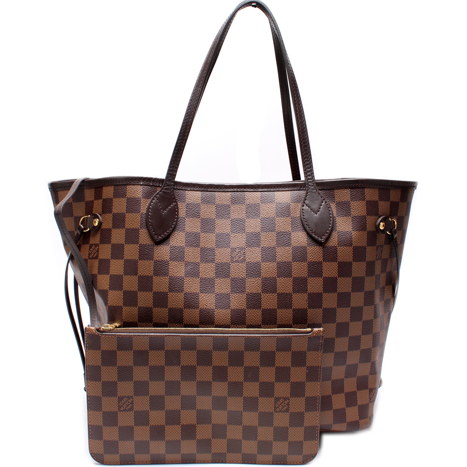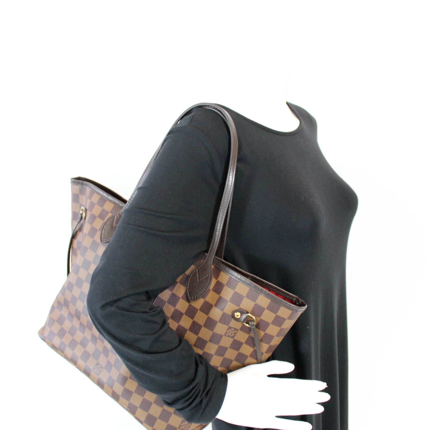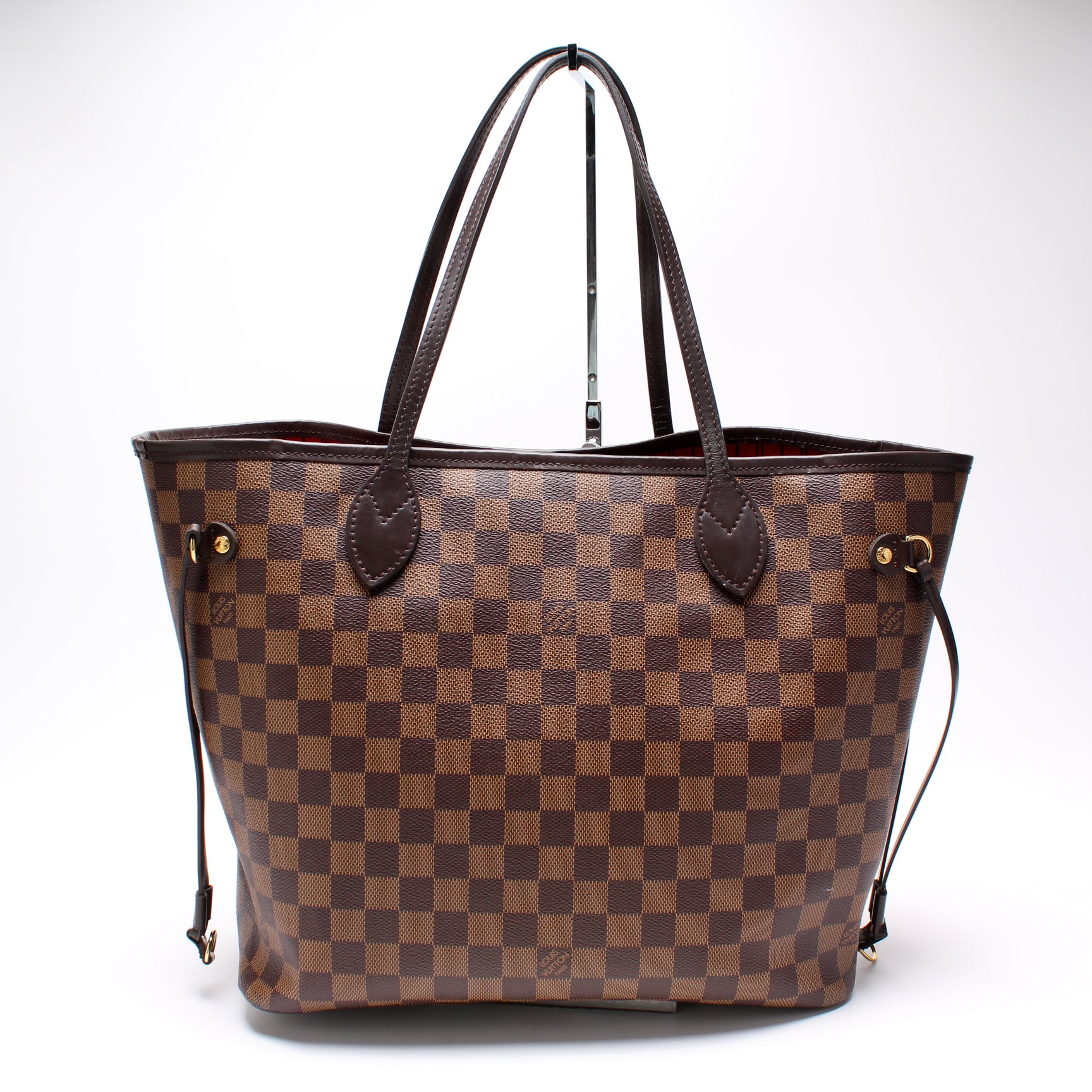 This pre-owned Louis Vuitton Neverfull MM is guaranteed 100% authentic. The exterior is in the classic Louis Vuitton Damier Ebene coated canvas.