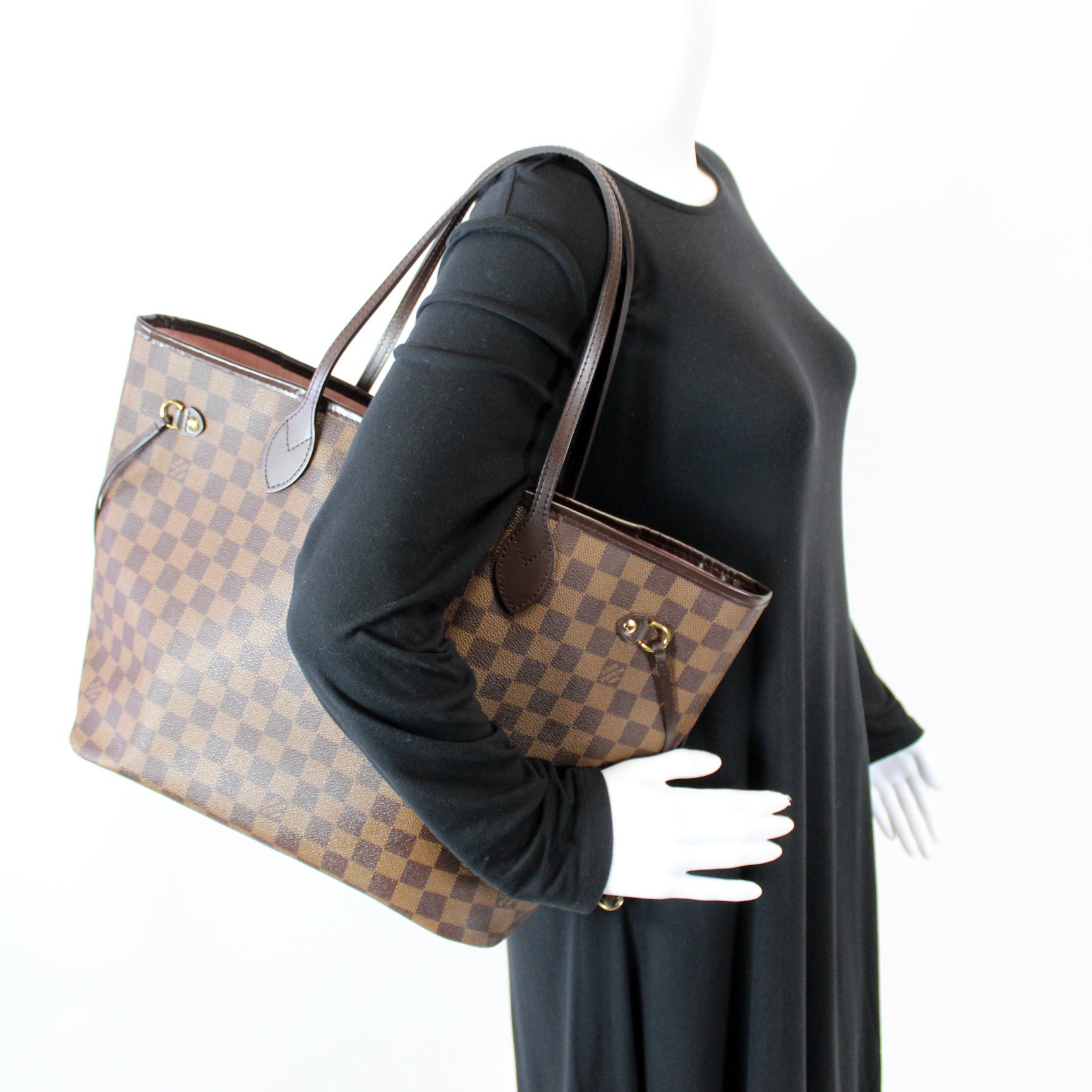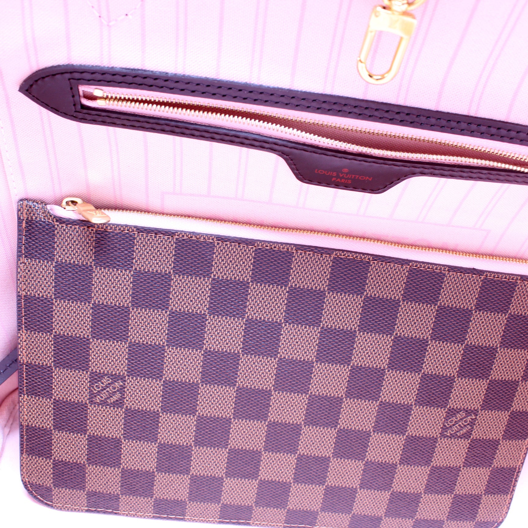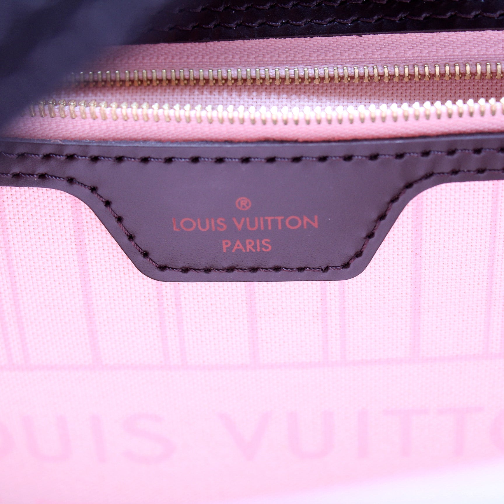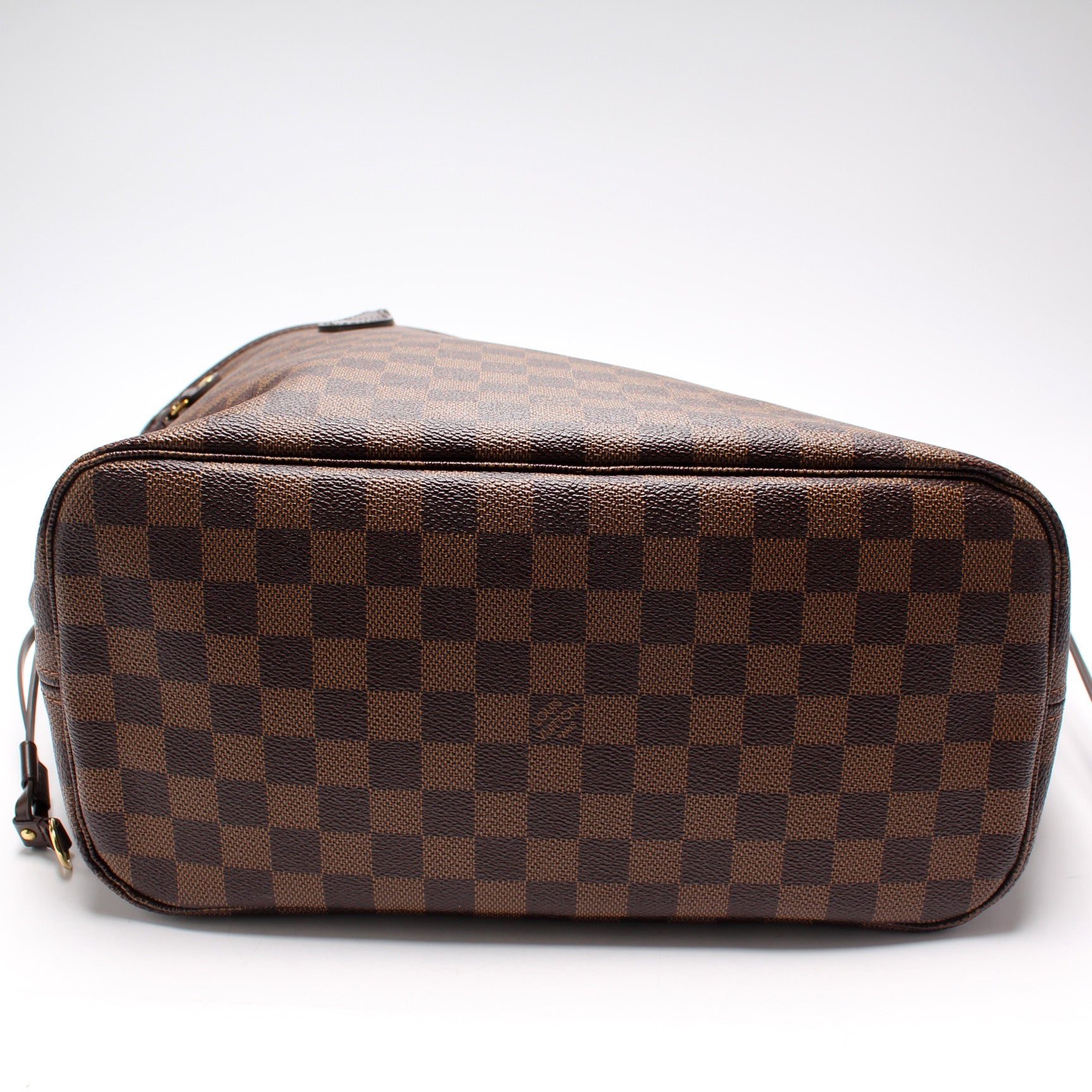 This pre-owned Louis Vuitton Neverfull MM is guaranteed 100% authentic. The exterior is in the classic Louis Vuitton Damier Ebene coated canvas.